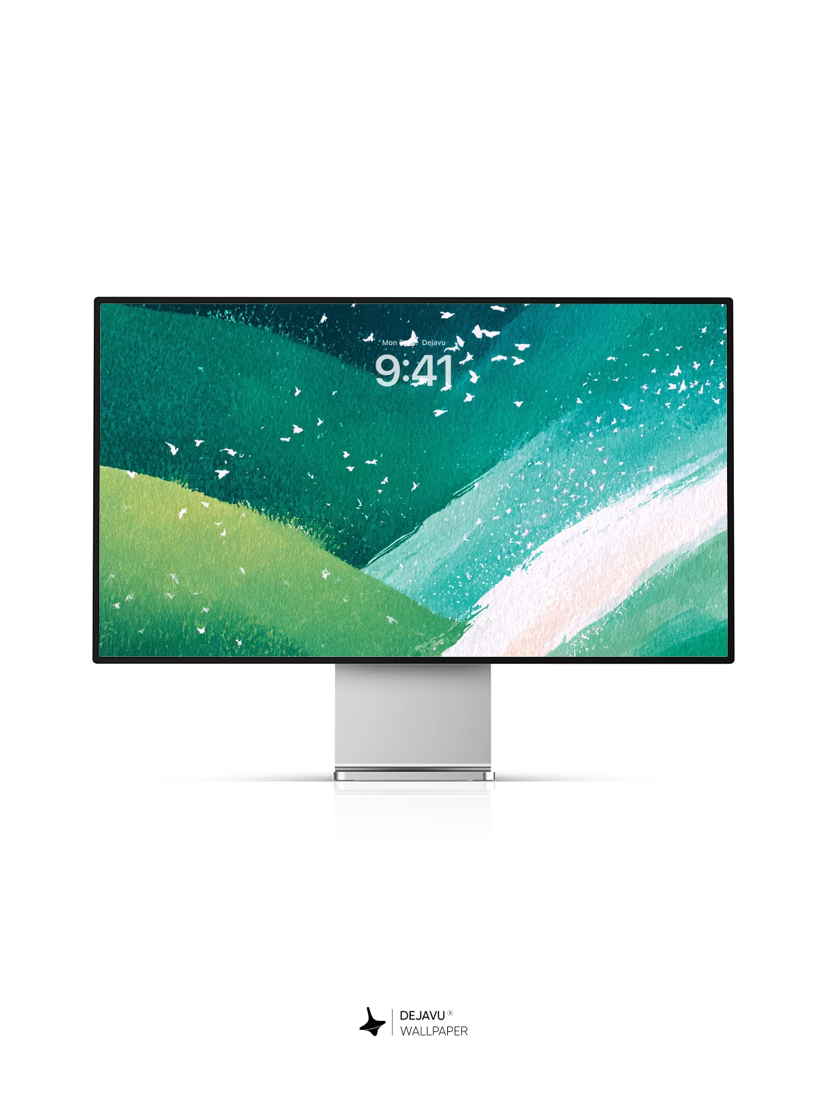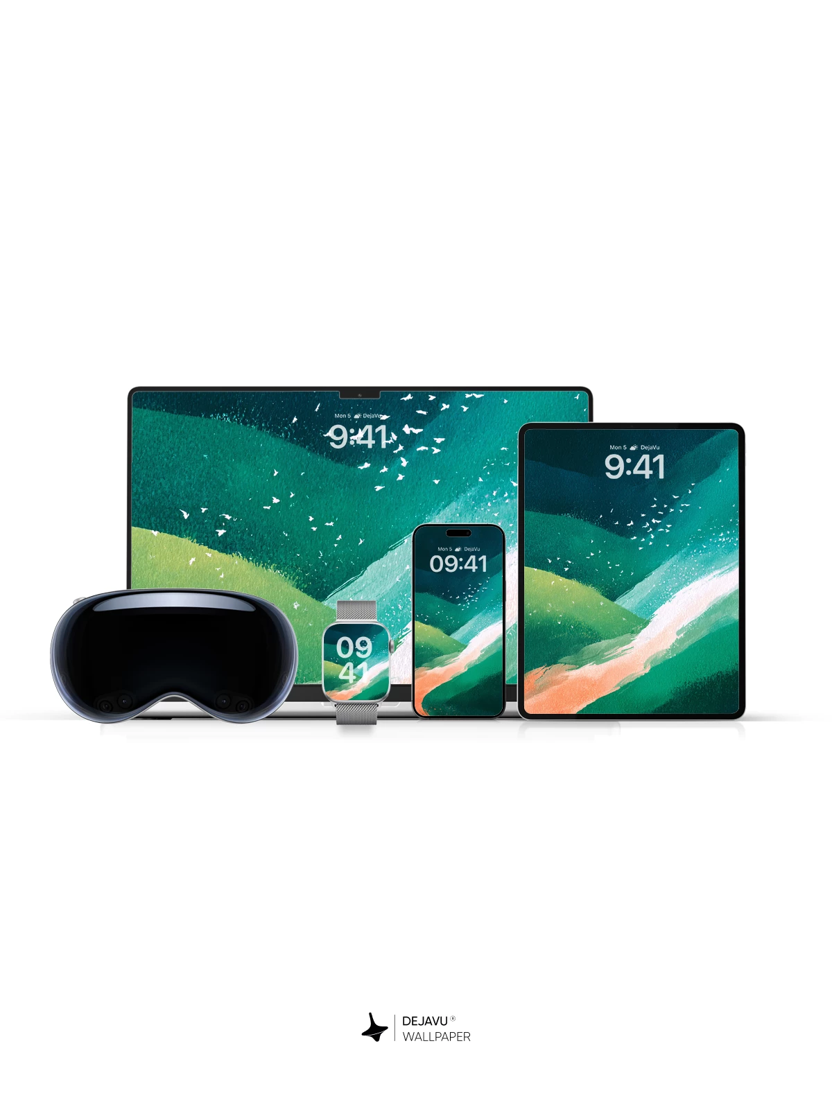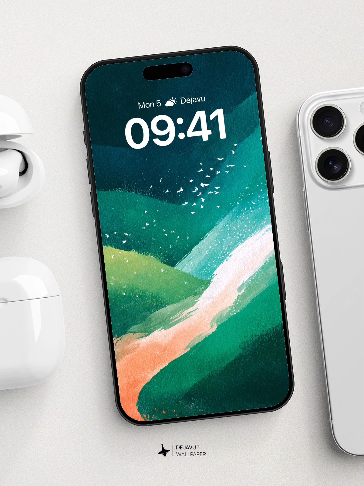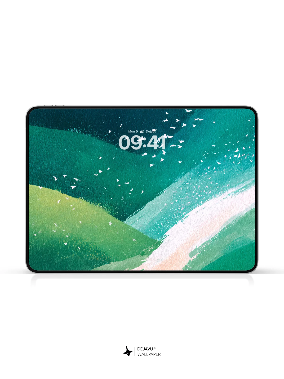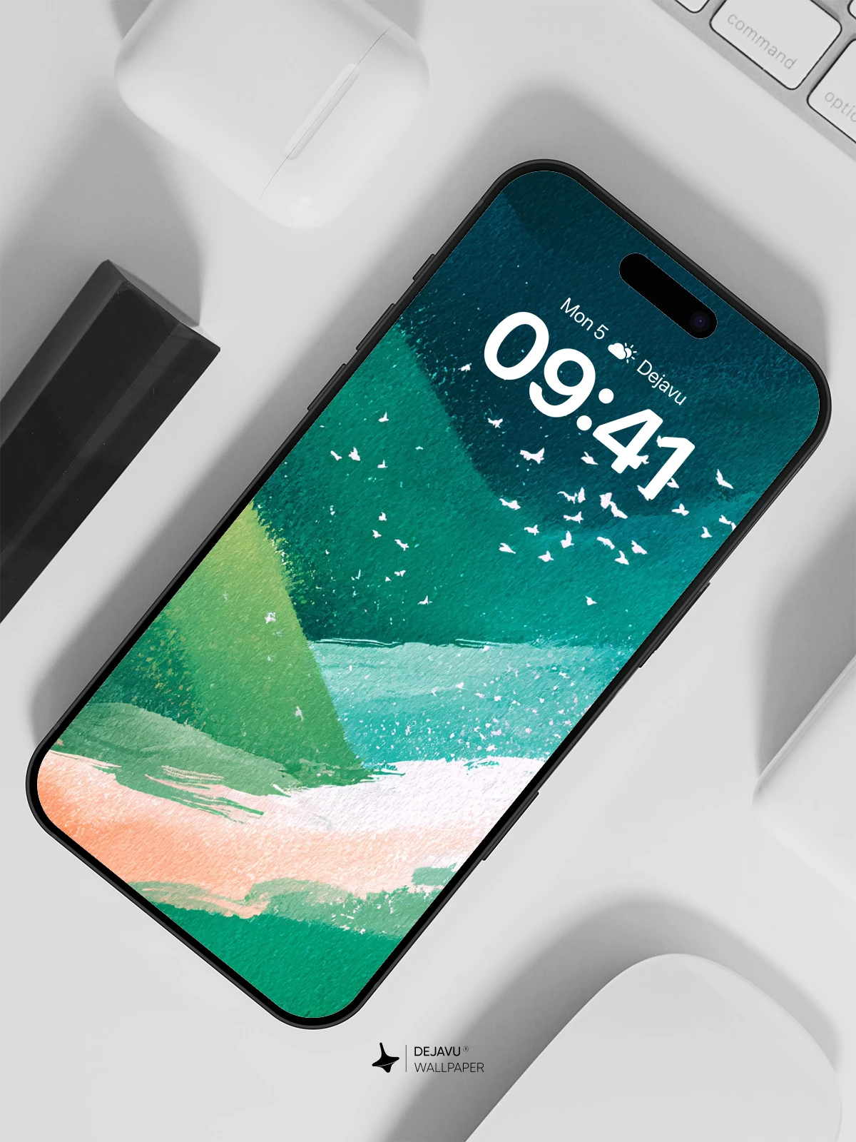 This 8K wallpaper features a tranquil scene of rolling green hills and a flock of birds in flight, evoking a sense of peace and freedom. Ideal for both iPhone and Android users, as well as tablet screens, this design brings a natural and calming aesthetic to your device.