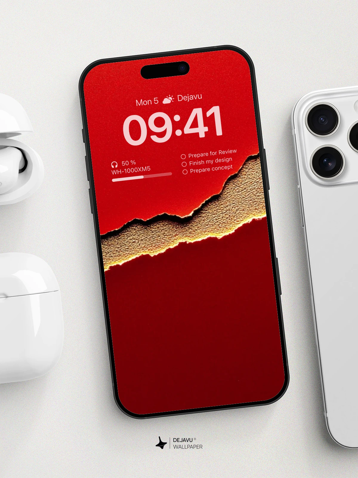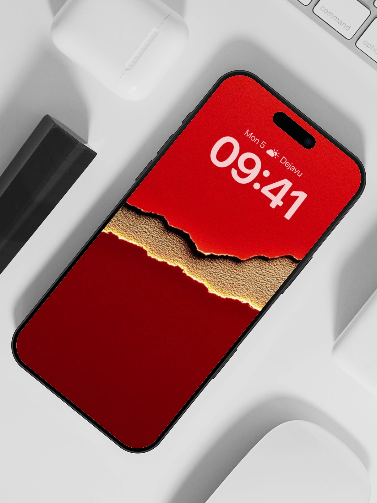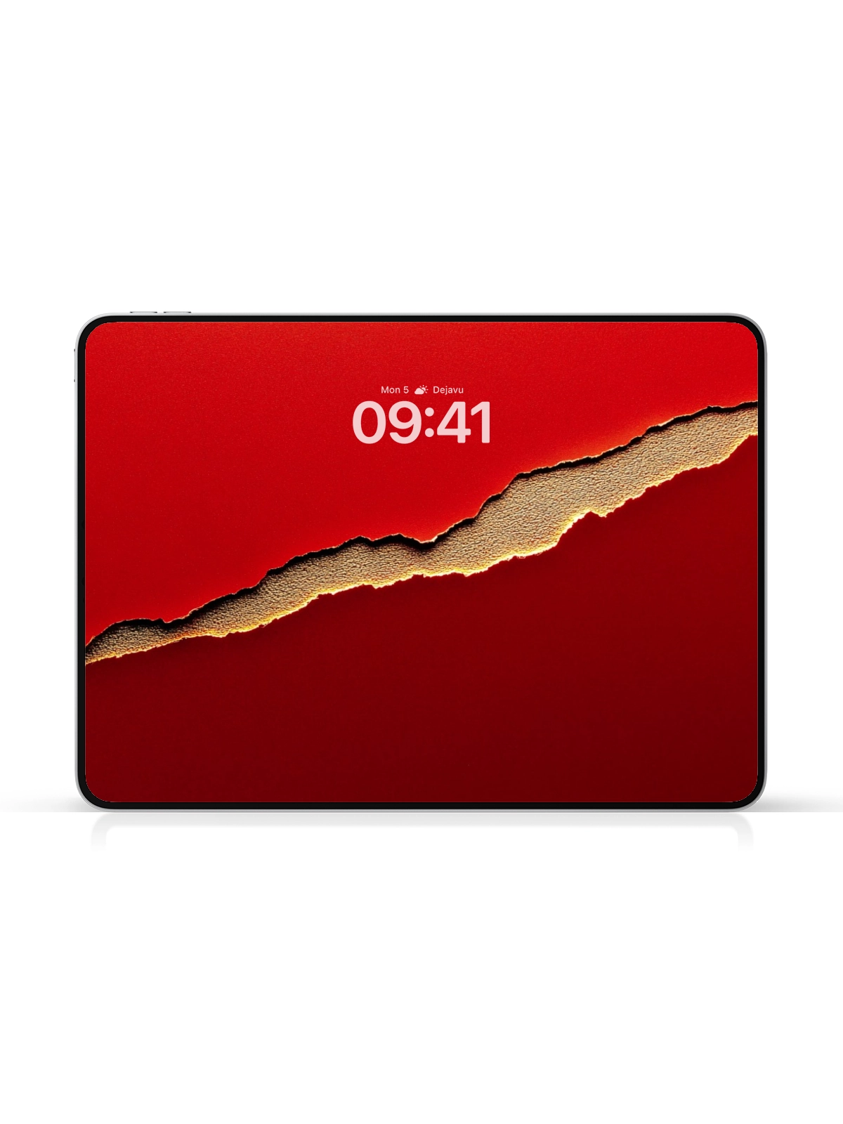 This minimalist wallpaper features a bold red background with a unique golden tear effect, creating a striking contrast. Perfect for enhancing the aesthetic of your iPhone, Android, or tablet screens. The design is both modern and elegant, adding a touch of sophistication to your device.