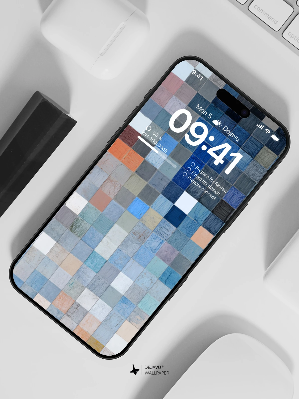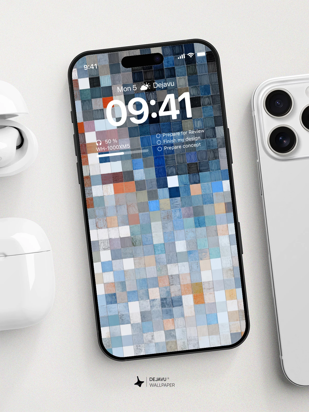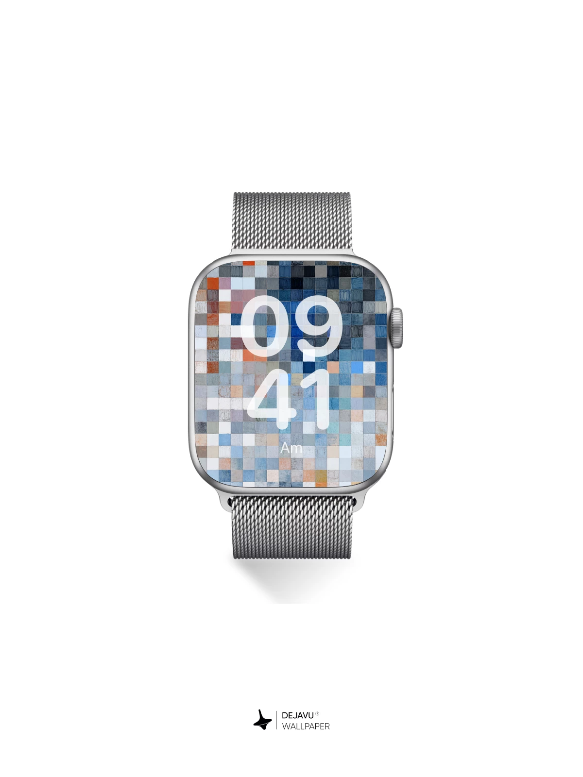 This abstract wallpaper features a mosaic of small squares in varying shades of blue, gray, and orange, creating a calming yet dynamic visual effect. Ideal for iPhone, Android, and tablet users seeking a stylish and versatile background that complements any interface.