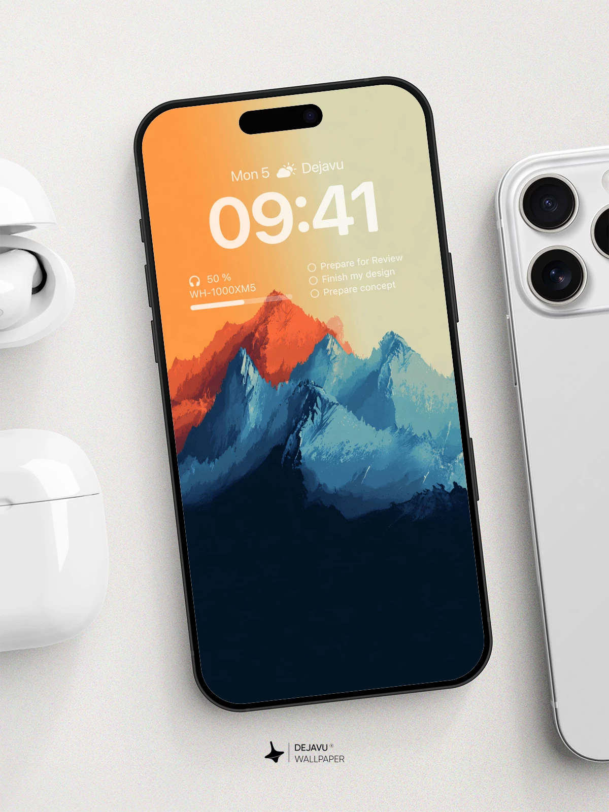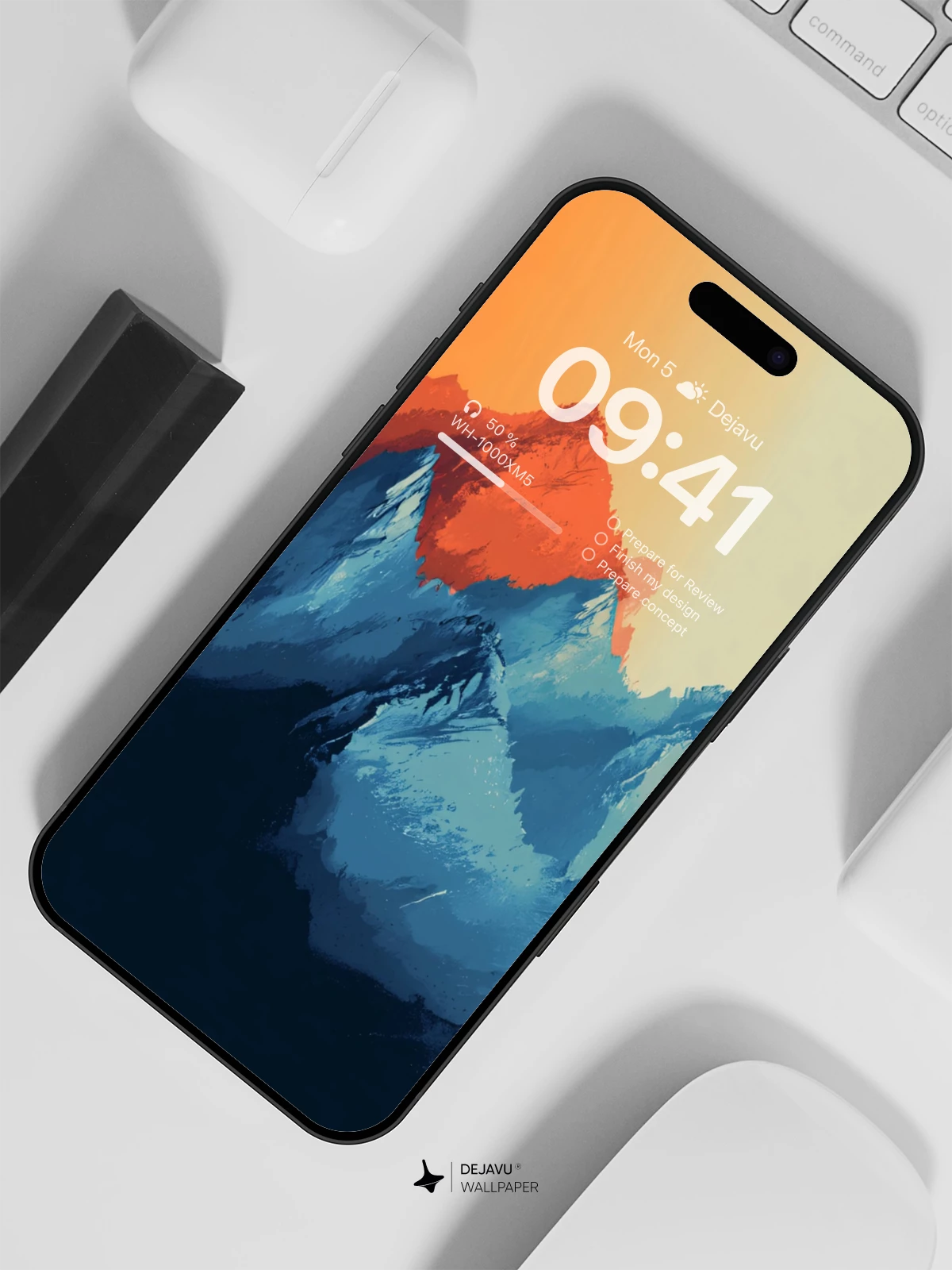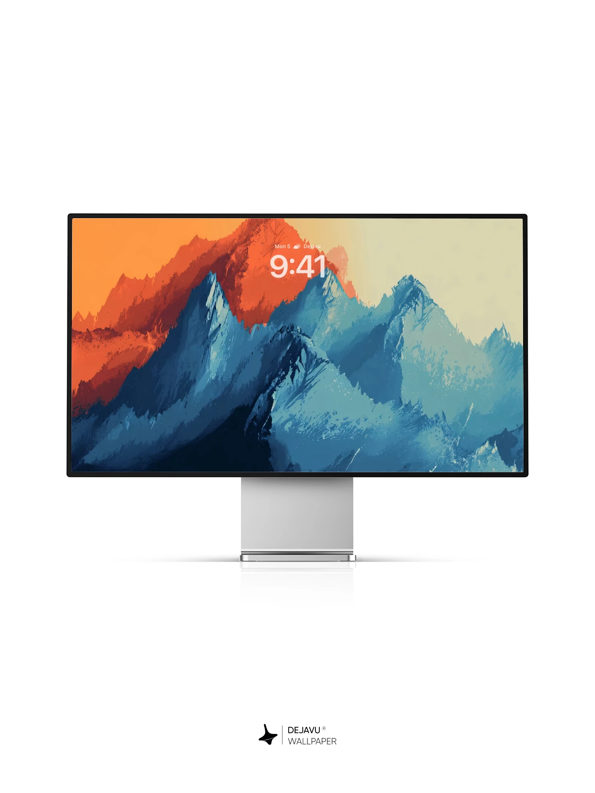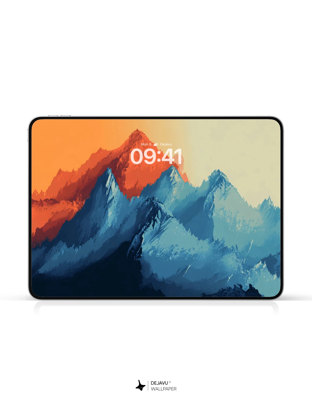 This captivating 8K wallpaper features a stylized mountain range under a gradient sky transitioning from vibrant orange to soft beige, creating a dramatic and serene atmosphere. The bold contrast between the fiery red-orange summit and the icy blue slopes adds depth and emotion, evoking a sense of quiet majesty and timeless beauty. Inspired by modern digital art with painterly textures, it’s ideal for enhancing the visual appeal of iPhone, Android, and tablet screens with its high-resolution detail and balanced composition.