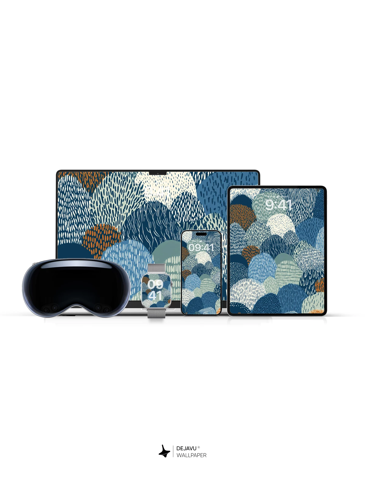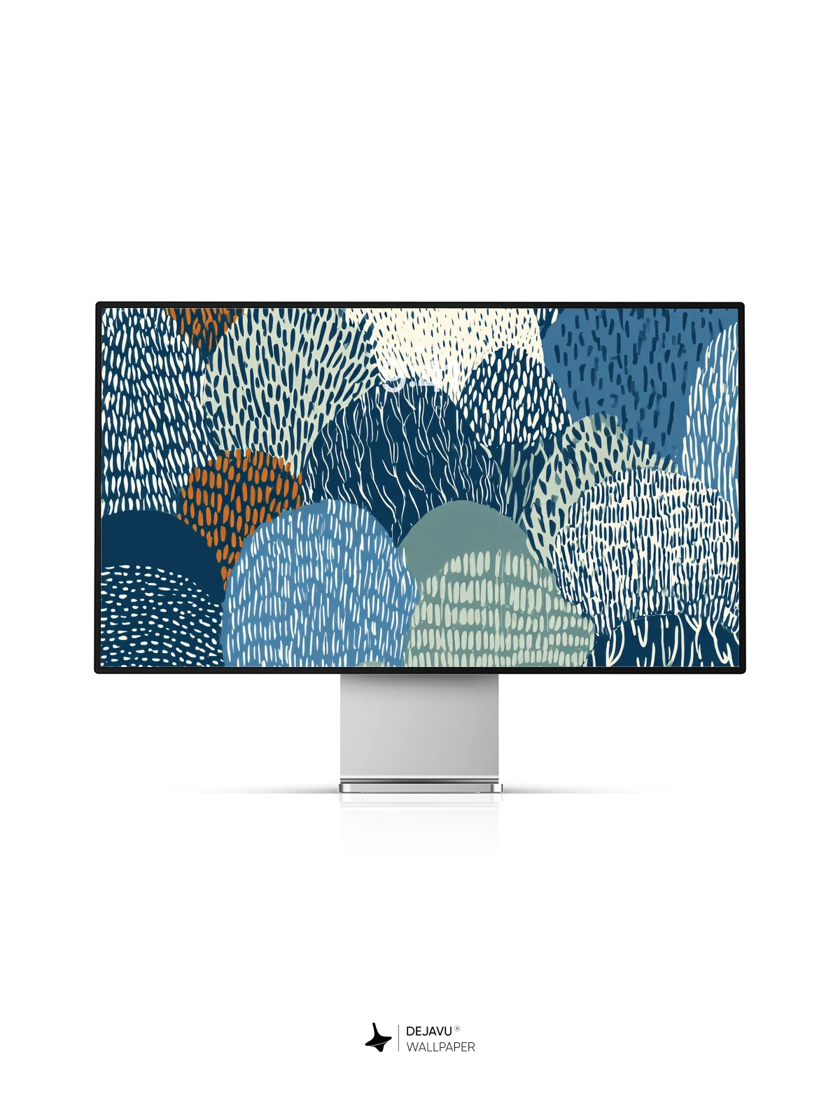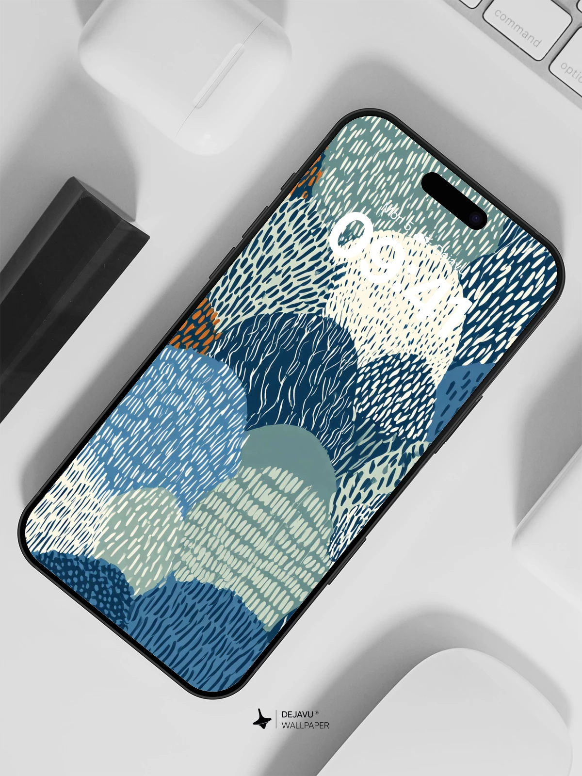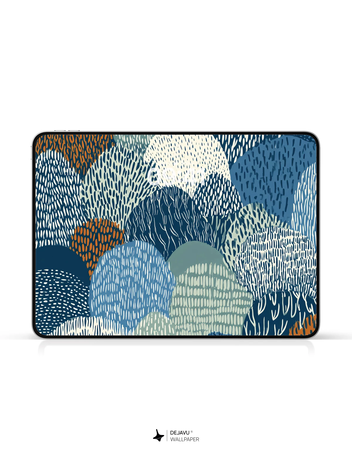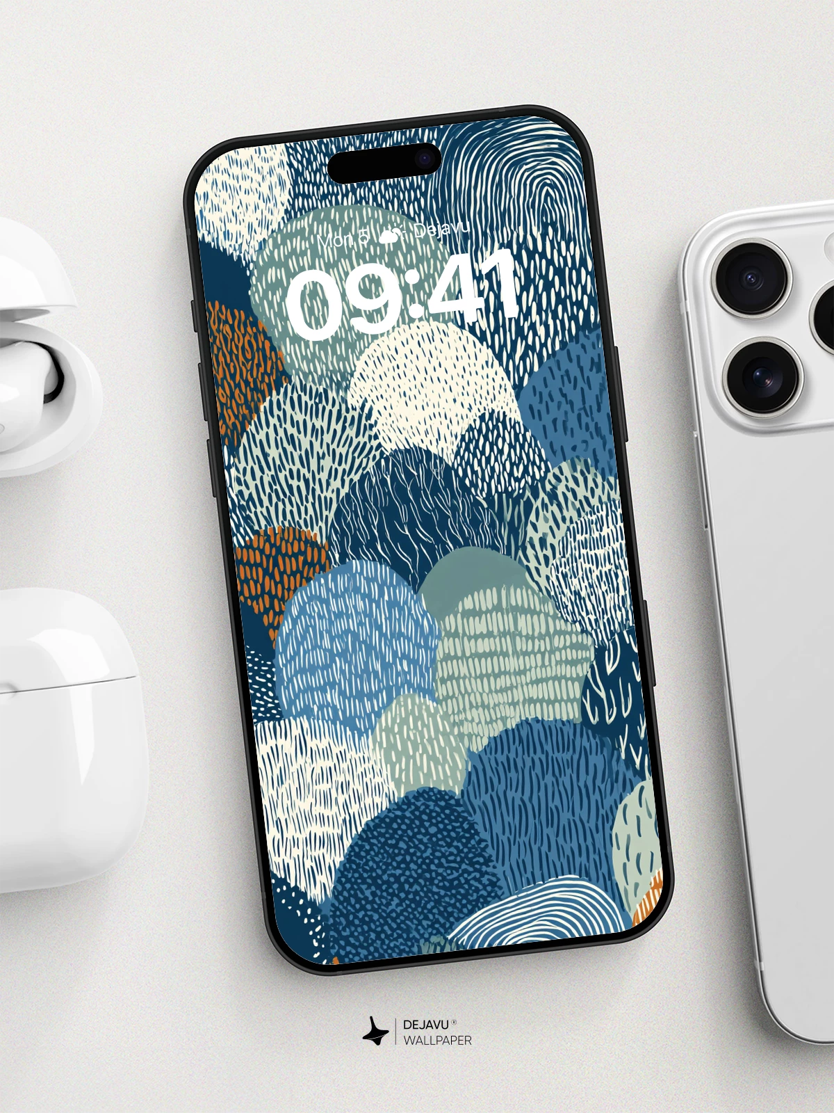Inspired by the rhythmic movement of ocean tides, this abstract wallpaper features overlapping wave-like forms rendered in intricate textures and soothing shades of blue, teal, and terracotta. Each shape carries unique line work, evoking a handcrafted, textile-inspired aesthetic that brings depth and warmth to any device screen. Ideal for iPhone, Android, or tablet users seeking artistic yet serene backgrounds, this 8K design transforms your digital space into a tranquil visual retreat.