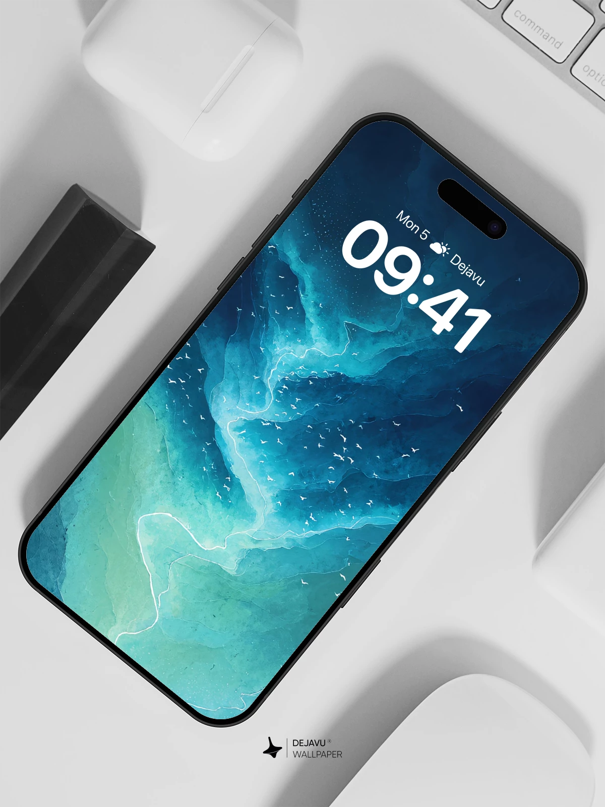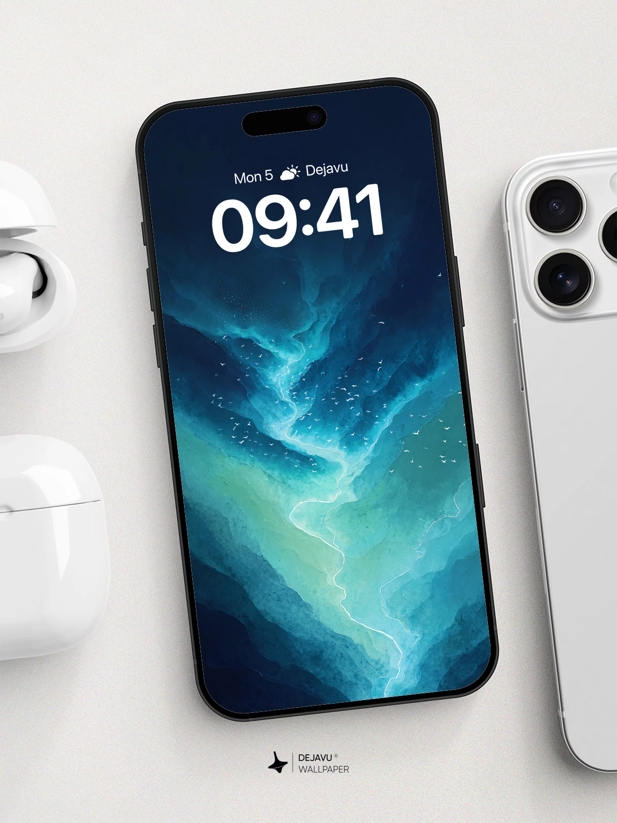 This 8K wallpaper features a stunning river scene with deep blue and teal hues, creating a tranquil atmosphere. Birds soar above, enhancing the sense of freedom and peace. Ideal for iPhone, Android, and tablets, it transforms your screen into a calming natural retreat.