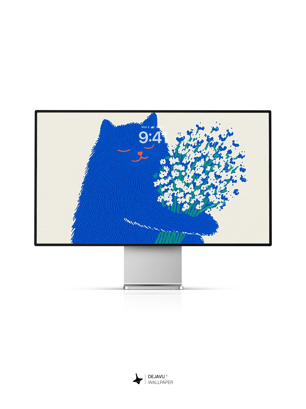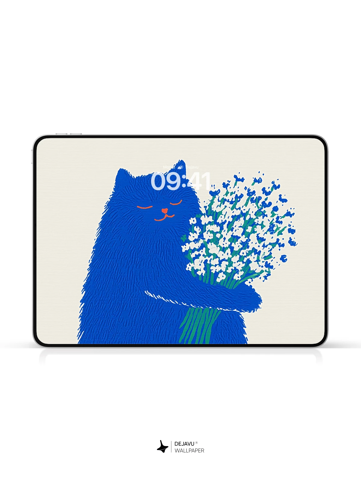 This enchanting 8K wallpaper features a tranquil blue cat holding a gentle bouquet of white and blue blossoms, rendered in a soft, textured illustration style reminiscent of modern folk art. The calming palette and peaceful expression evoke a sense of quiet joy and tender affection, making it an ideal choice for iPhone, Android, or tablet backgrounds. With its minimalist charm and dreamy aesthetic, the image brings a touch of whimsy and warmth to any device.