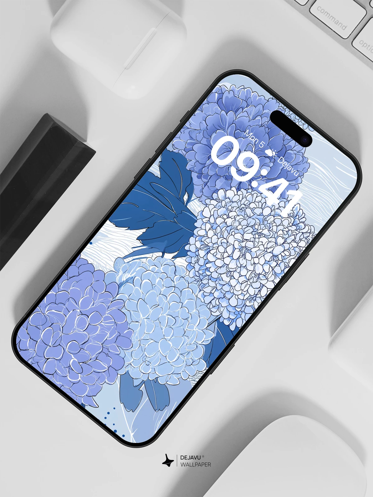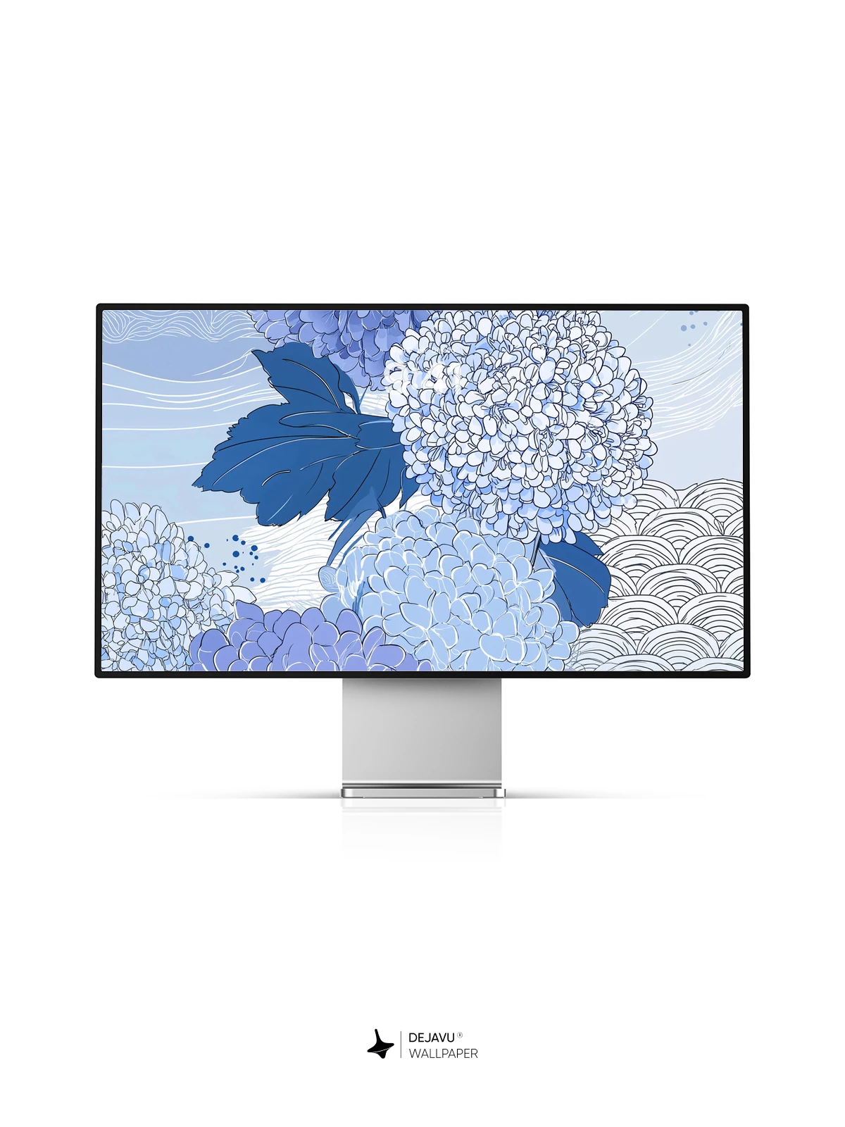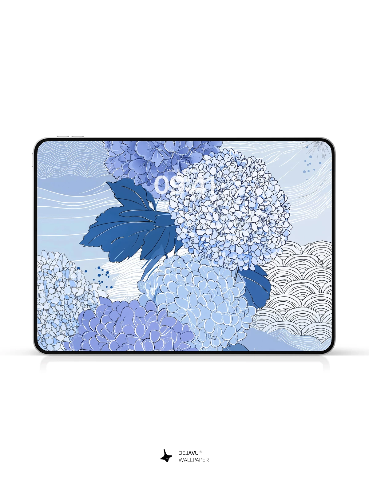 Inspired by the delicate artistry of Japanese Ukiyo-e, this 8K wallpaper captures a tranquil garden of blooming hydrangeas in soft blues and whites, set against flowing wave motifs and star-like accents. The harmonious blend of floral elegance and cultural design evokes a sense of peaceful contemplation, making it ideal for iPhone, Android, or tablet screens. Each petal and pattern is meticulously detailed, offering a soothing visual escape that enhances any device’s aesthetic.