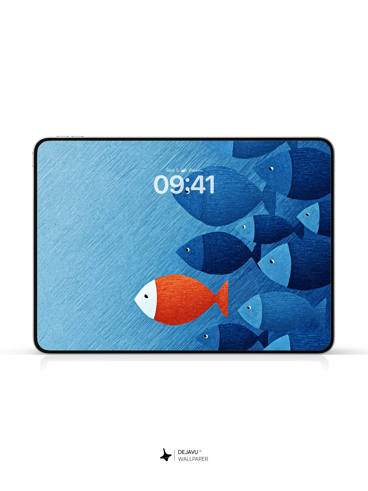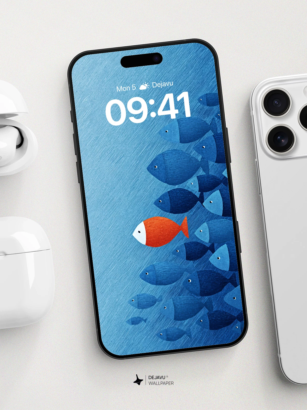 This captivating 8K wallpaper features a lone orange fish breaking away from a synchronized school of deep blue fish, symbolizing individuality and courage. Inspired by minimalist marine art with a touch of symbolic storytelling, the image uses clean shapes and rich textures to create a serene yet powerful underwater scene. Ideal for iPhone, Android, and tablets, it brings a fresh burst of color and meaning to your mobile device’s background.