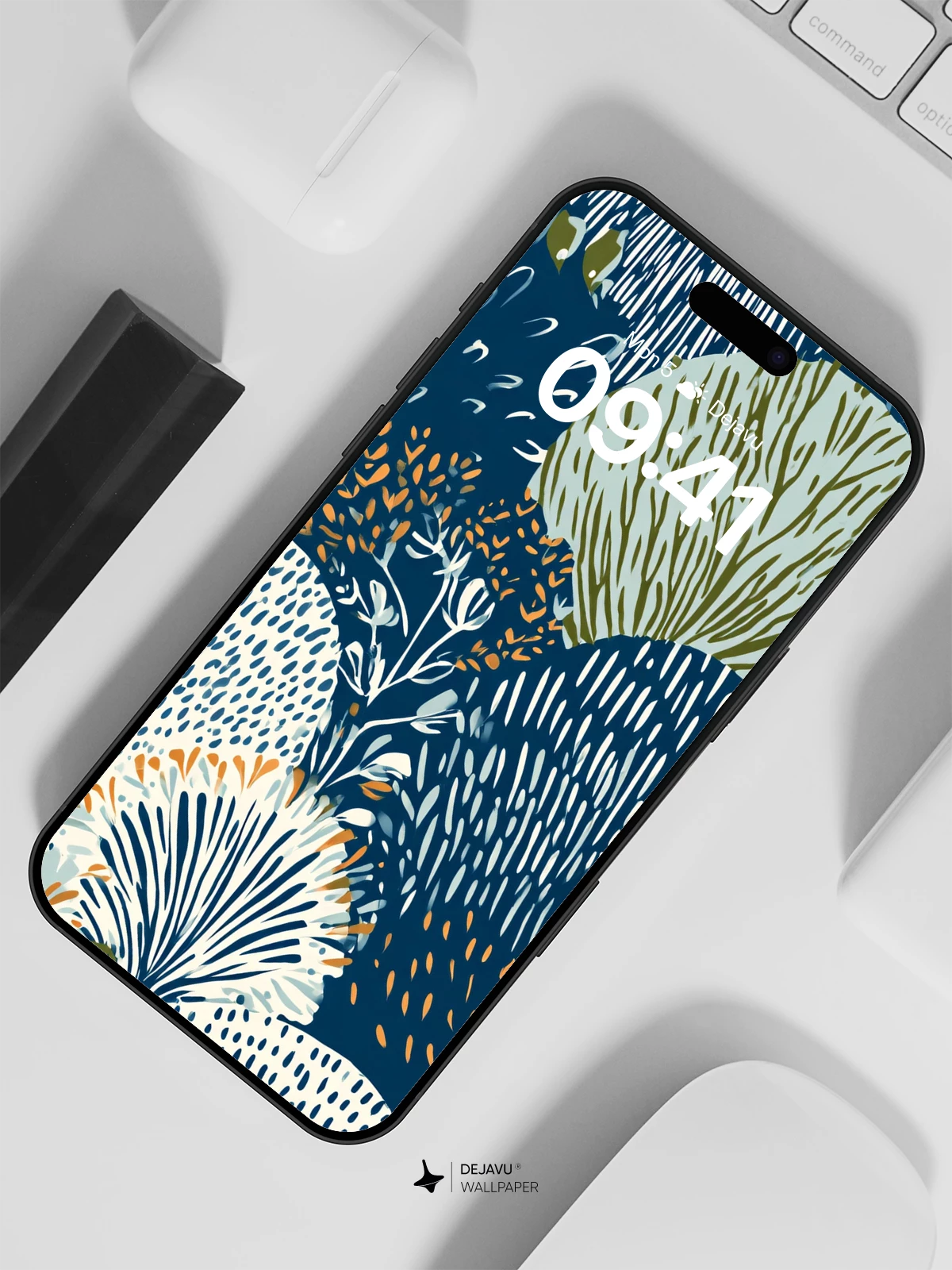 This captivating abstract wallpaper draws inspiration from the intricate details of tropical foliage and natural forms, rendered in a painterly, illustrative style reminiscent of contemporary textile art. Rich navy blues, soft greens, and warm terracotta hues create depth and harmony, while bold patterns evoke the rhythm of leaves and ferns. Ideal for enhancing your iPhone, Android, or tablet screen with a touch of serene elegance, this 8K wallpaper brings the tranquility of nature into your digital world.