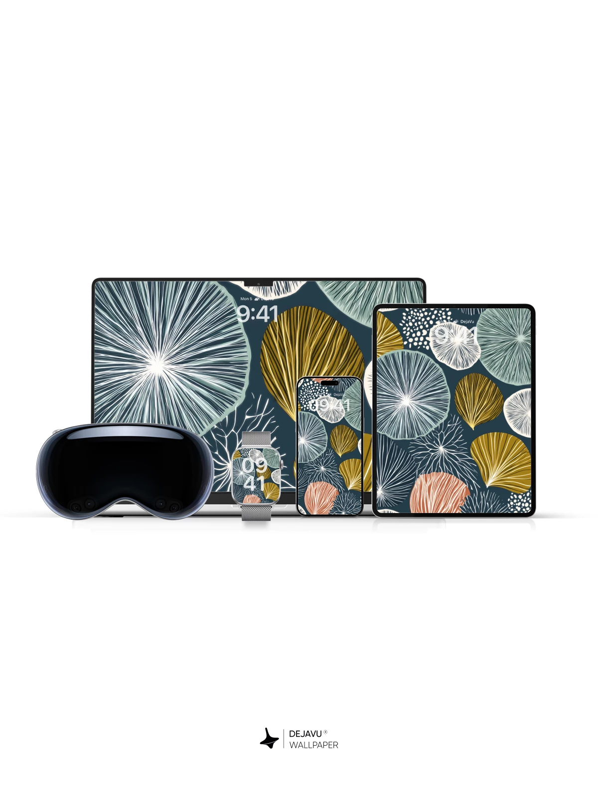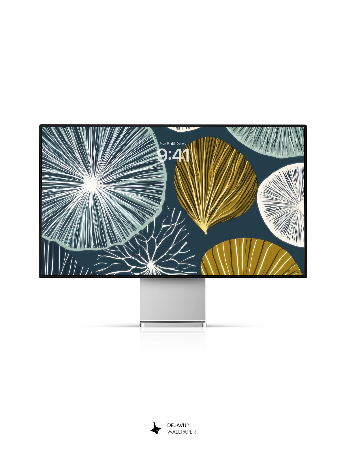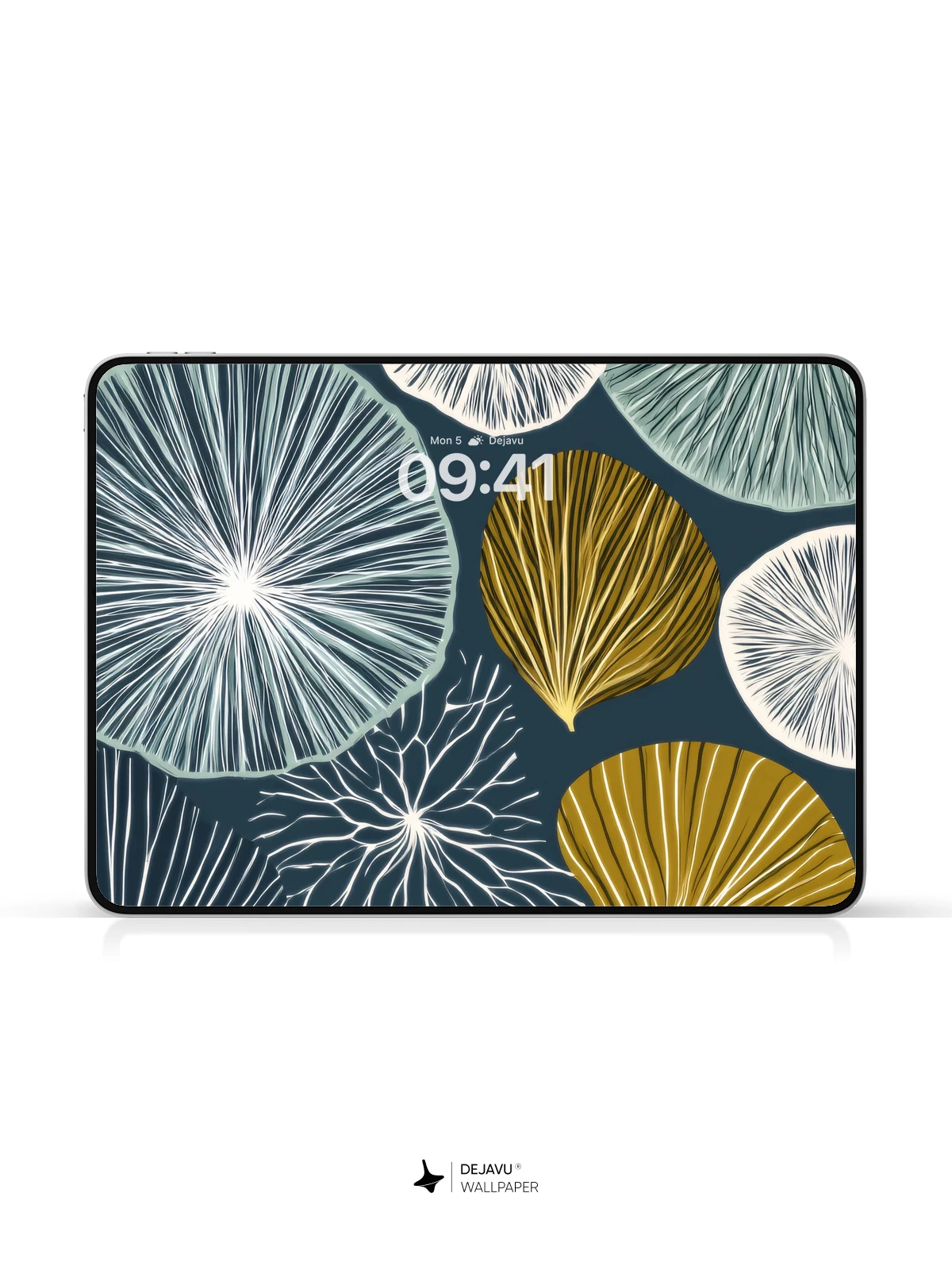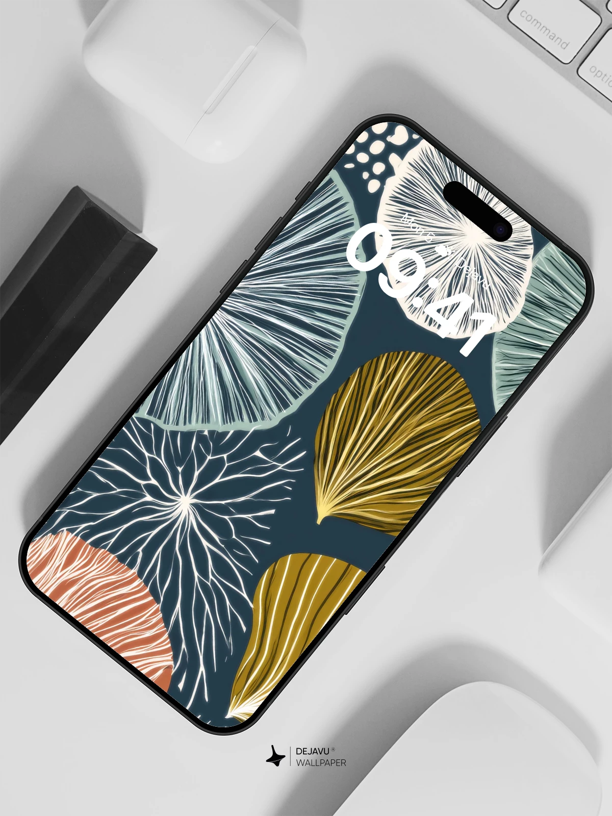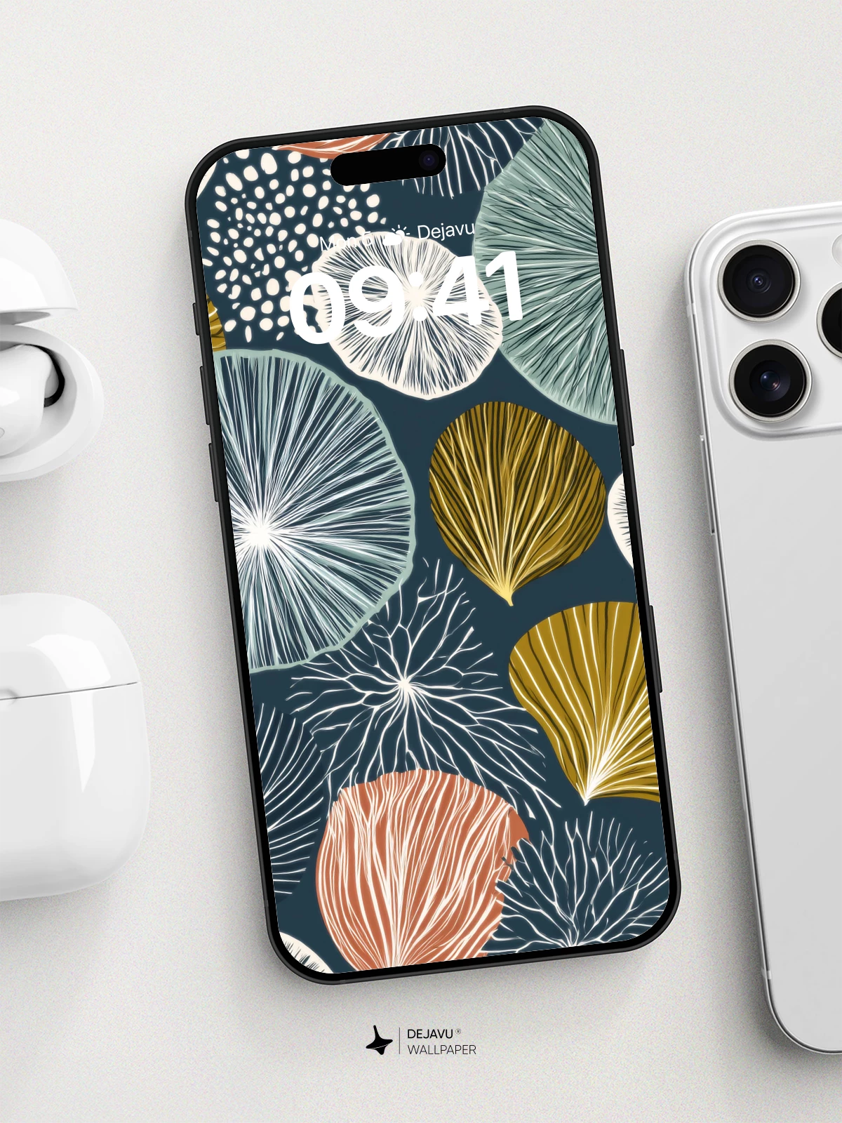 This striking wallpaper features an artistic arrangement of stylized fan-like botanical forms, reminiscent of sea urchins and palm fronds, rendered in rich teal, golden ochre, coral, and crisp white on a deep navy background. Inspired by organic patterns found in nature, the design evokes a sense of serene elegance and timeless beauty. Ideal for enhancing the look of your iPhone, Android phone, or tablet, this 8K resolution wallpaper brings a touch of sophisticated artistry to your device’s screen.
