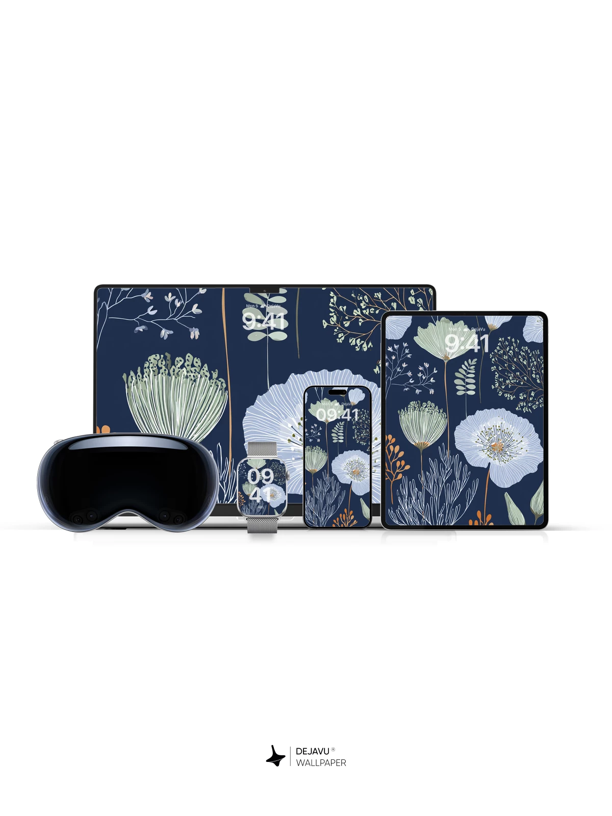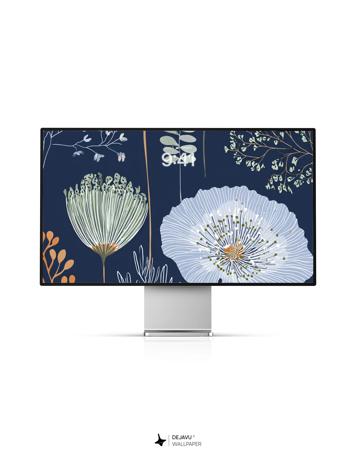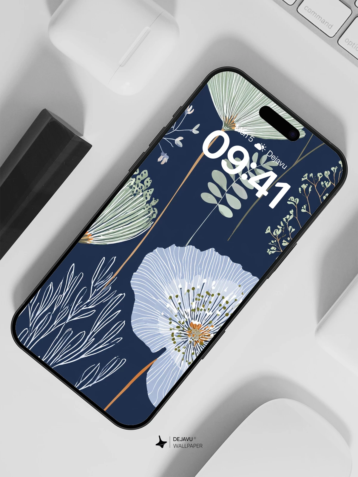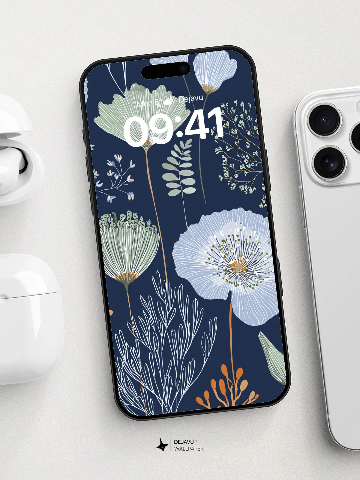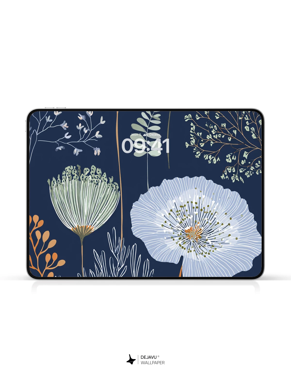This beautifully illustrated botanical wallpaper features delicate poppies, ferns, and wildflowers in a harmonious blend of pastel hues on a rich navy canvas. Inspired by the intricate detail of naturalistic botanical art, it evokes a sense of calm and timeless beauty. Ideal for iPhone, Android, and tablet screens, this 8K design brings a touch of refined elegance to your device with its graceful lines and soothing color palette.