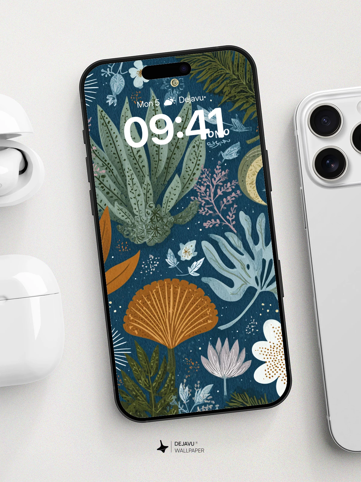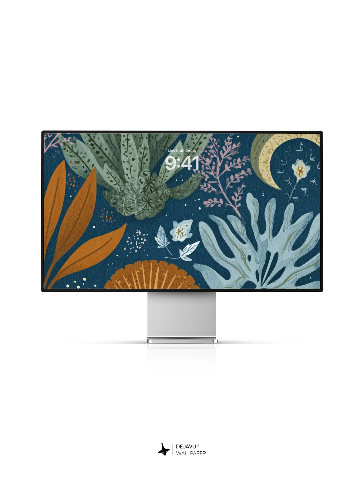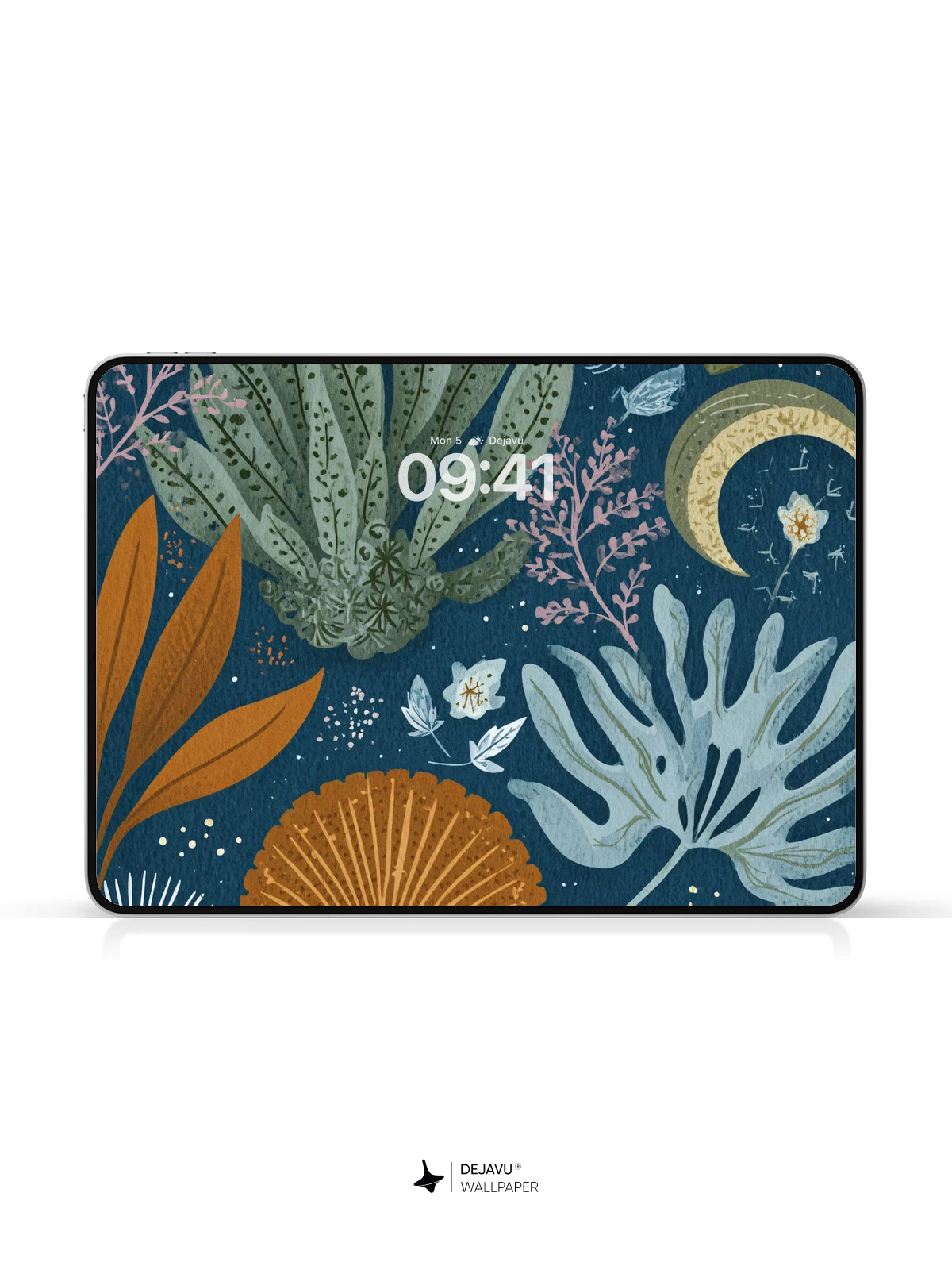 Immerse yourself in a serene night jungle where monstera leaves, agave, and blooming flora dance under a soft crescent moon. This intricately illustrated wallpaper evokes a sense of tranquil mysticism, with rich textures and celestial details that bring the magic of nature to life on your iPhone or Android device. Designed with botanical artistry and cosmic charm, it’s ideal for tablets and mobile screens craving depth and beauty.