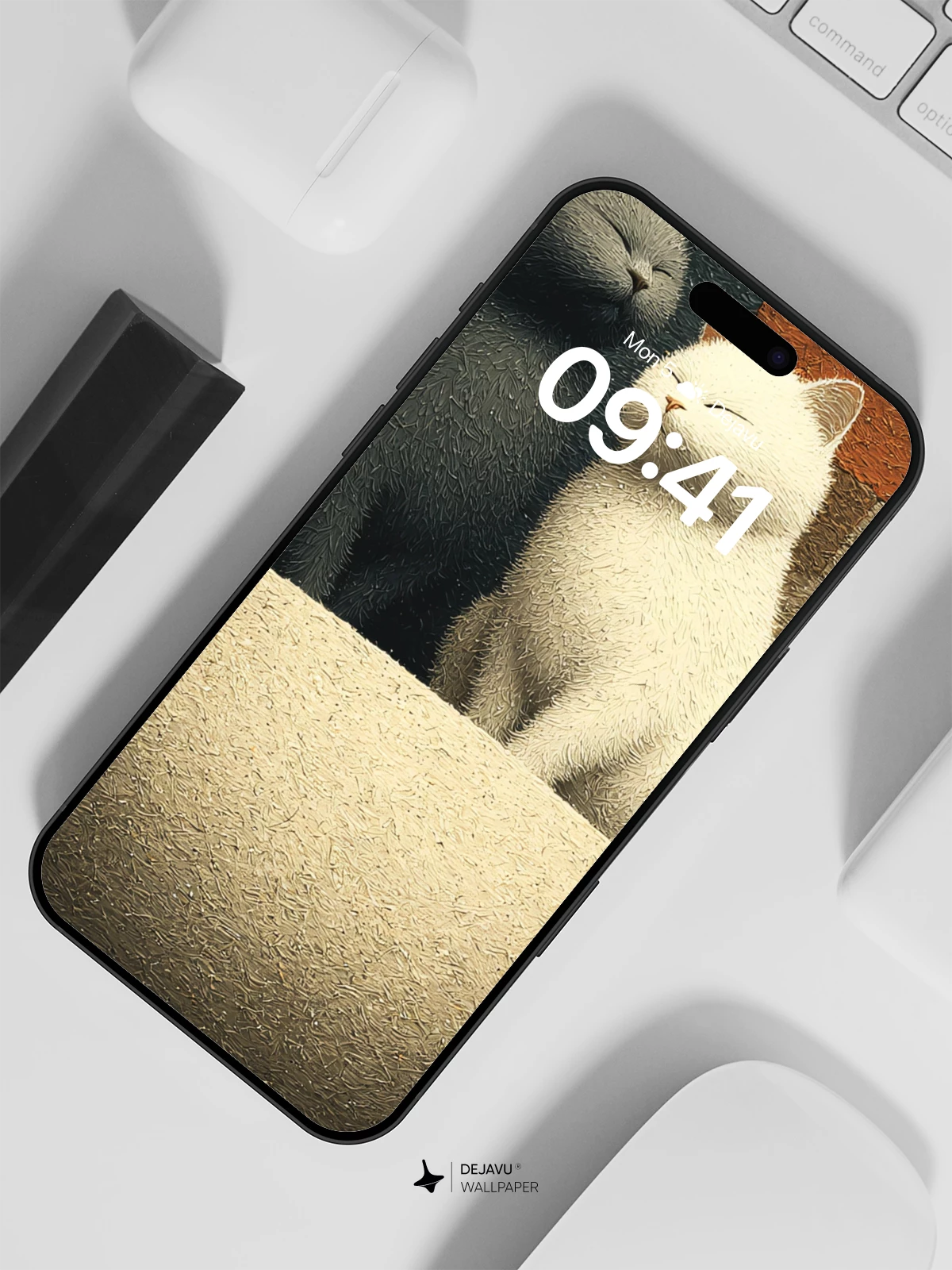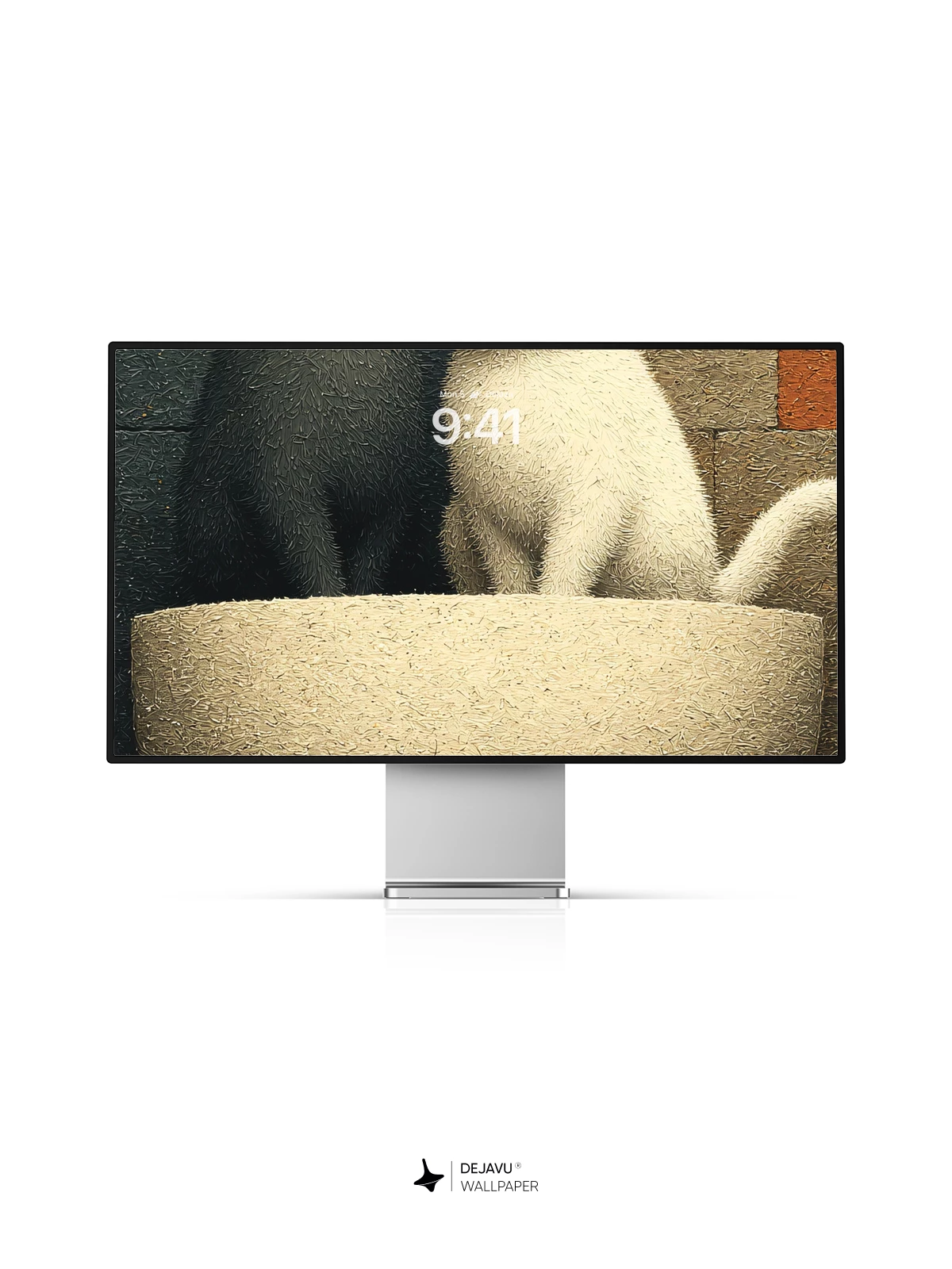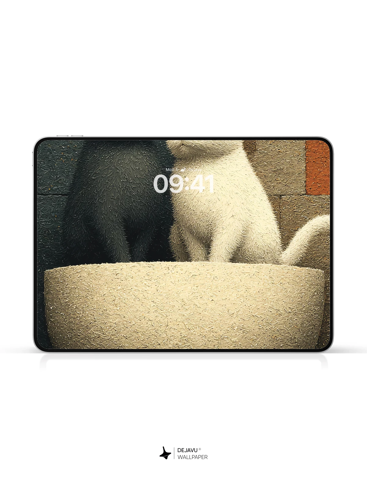 In this whimsical yet soothing scene, a pair of fluffy cats—one dark gray, one pure white—sit side by side in a soft, rounded bowl, eyes gently closed as if in peaceful harmony. The background features a patchwork of earthy tiles in muted reds, grays, and browns, creating a warm, tactile contrast to the smooth fur of the cats. The composition evokes a sense of quiet companionship and balance, making it an ideal 8K wallpaper for iPhone, Android, or any mobile device seeking elegance and serenity. Perfect for those who appreciate minimalist charm with a touch of emotional warmth.