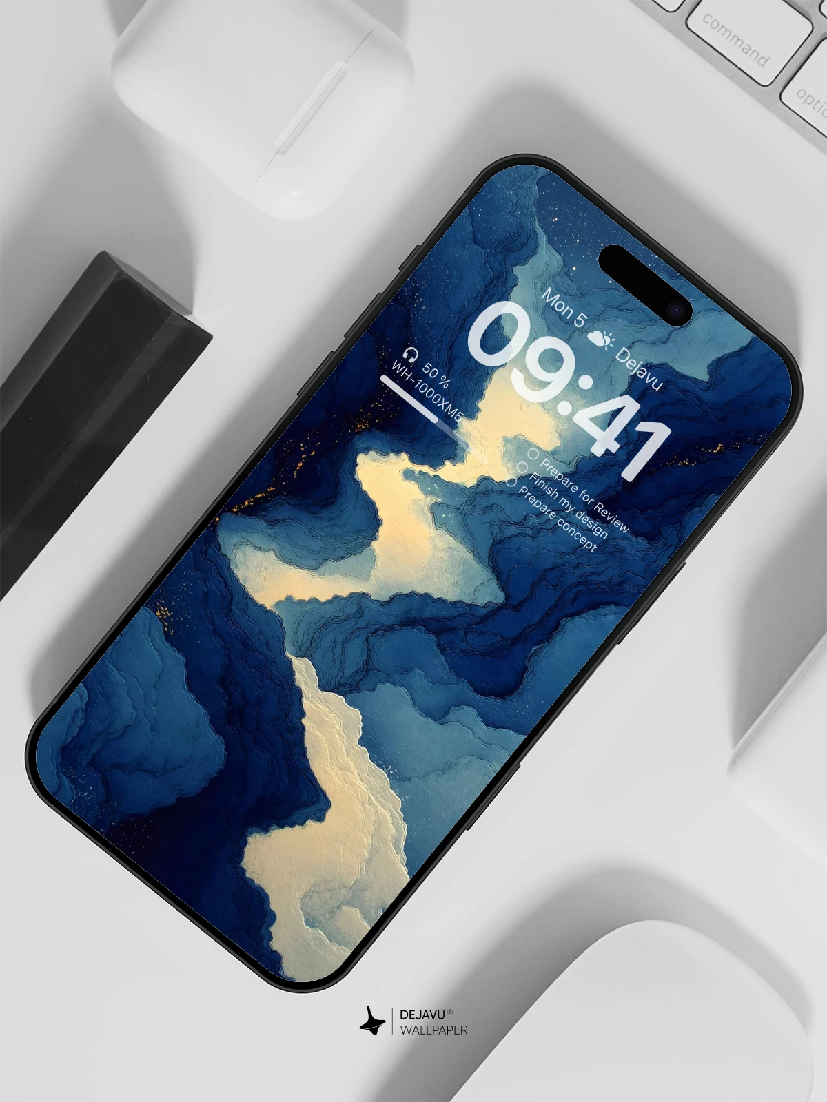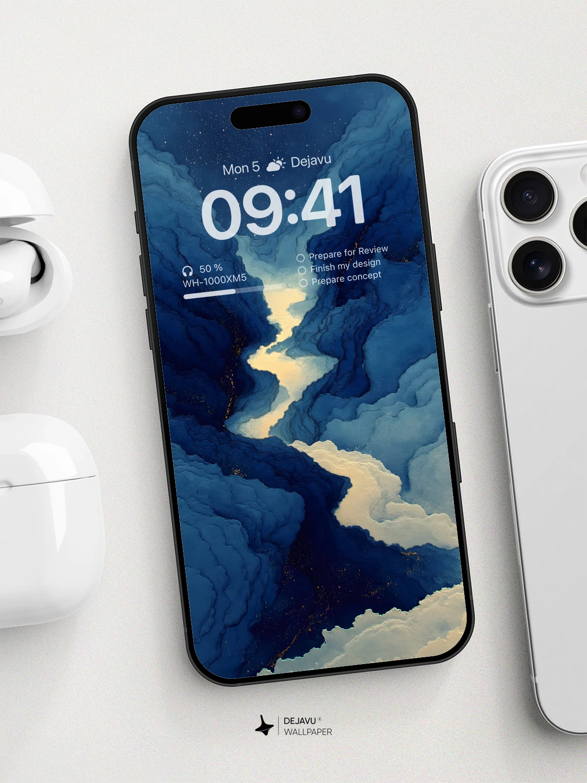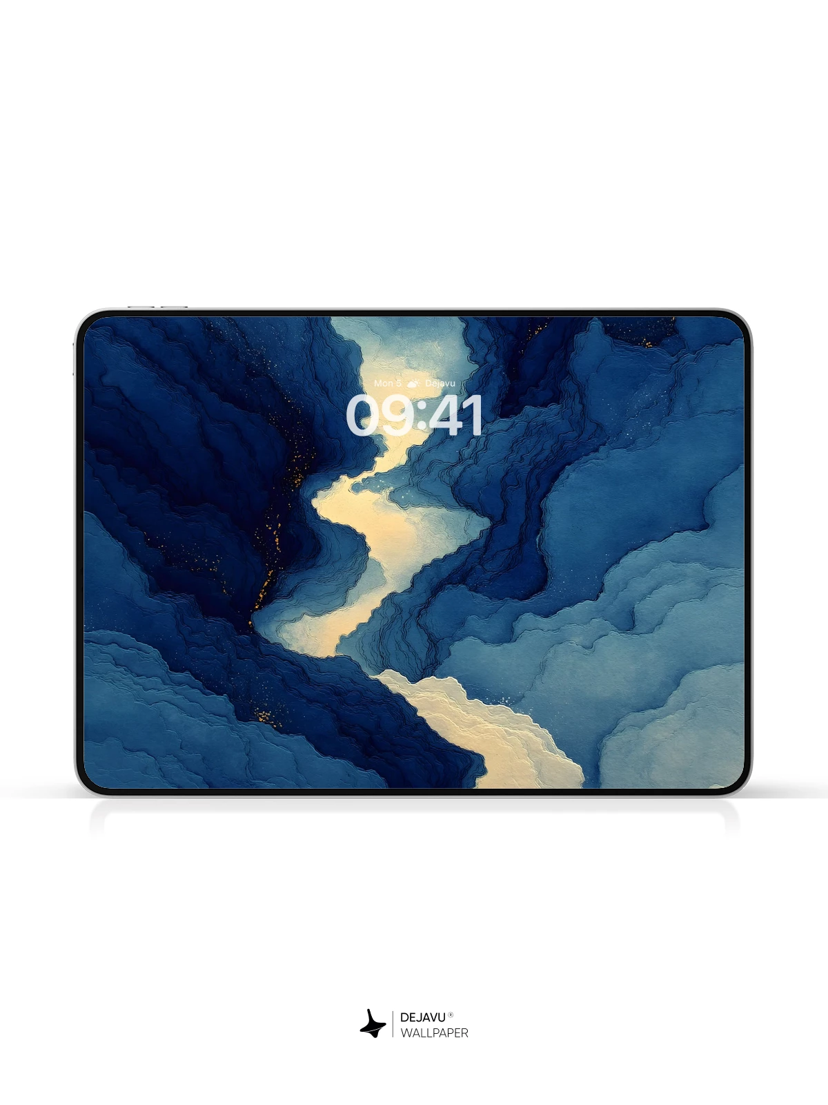 This mesmerizing 8K wallpaper captures a dreamlike celestial canyon where swirling clouds form deep valleys illuminated by soft, golden glimmers beneath a star-studded night sky. Inspired by surrealism and cosmic artistry, the image evokes a sense of wonder and infinite depth, ideal for iPhone, Android, and tablet users who appreciate immersive, poetic visuals. The rich blues and luminous contrasts make it a stunning choice for those seeking an otherworldly aesthetic on their mobile devices.