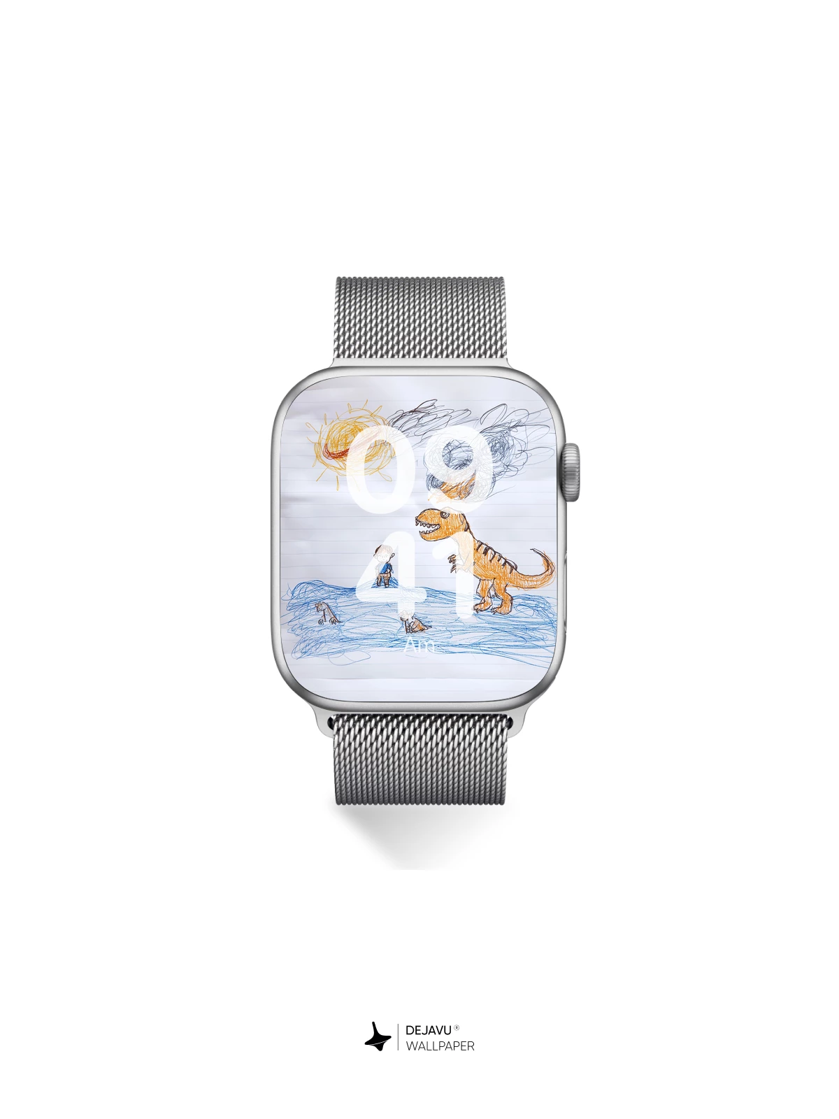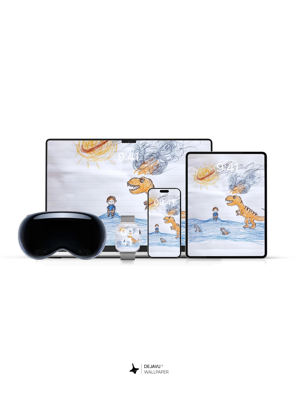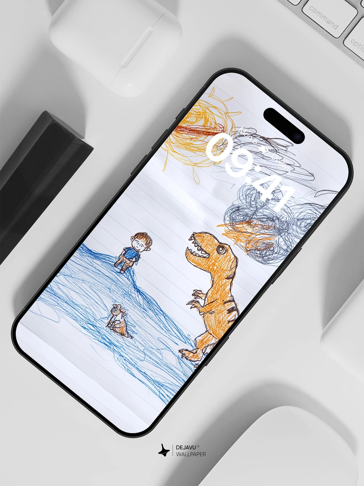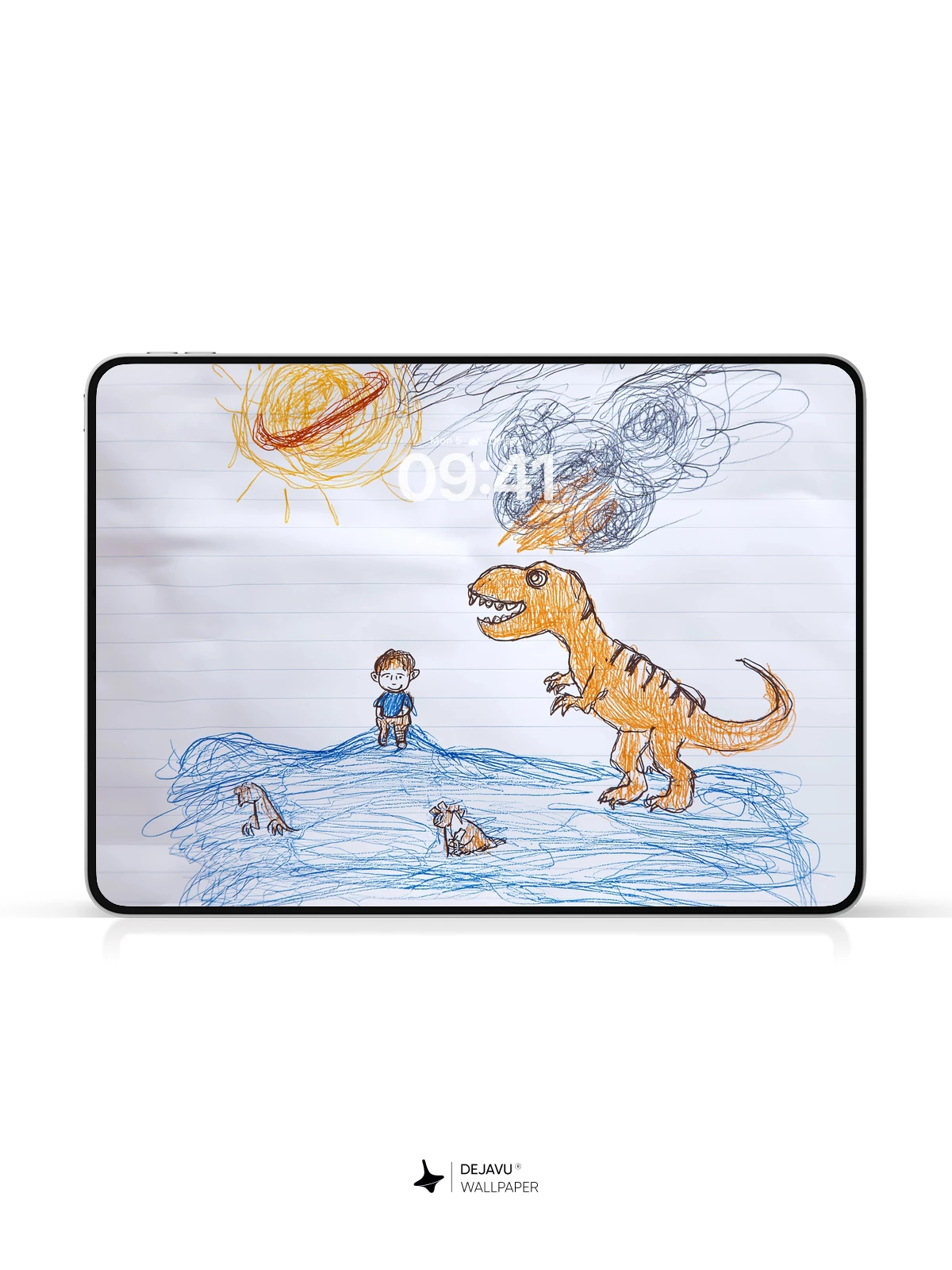 This charming child’s drawing captures a surreal adventure where a young boy stands calmly beside a giant, smiling T-Rex on a blue scribbled landscape, with a fiery sun and storm clouds above. The fantasy scene blends innocence and wonder, evoking childhood dreams of prehistoric friendship. Ideal as an 8K wallpaper for iPhone, Android, or tablets, it brings playful creativity to your device’s screen.