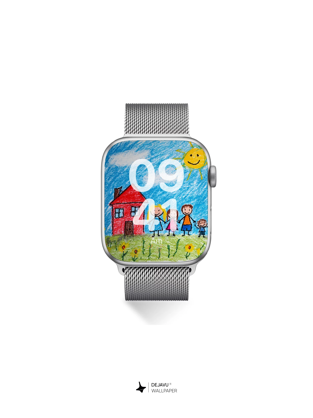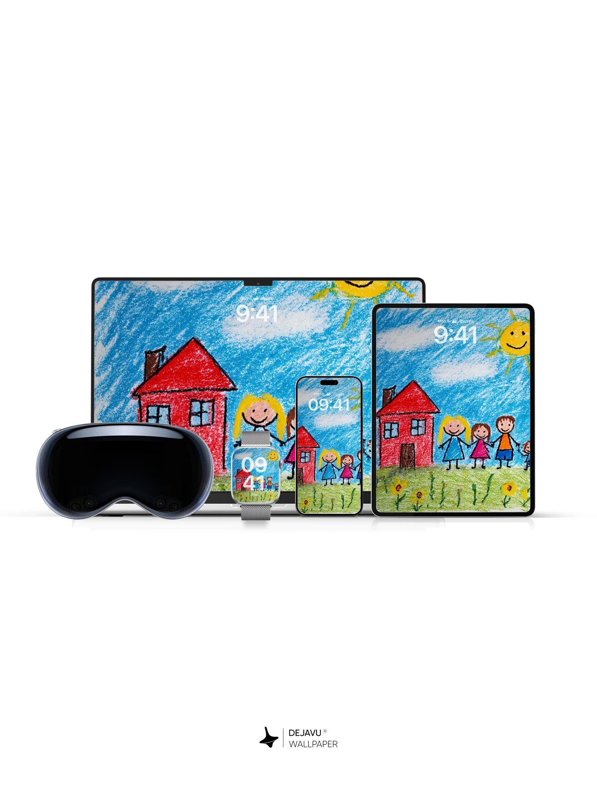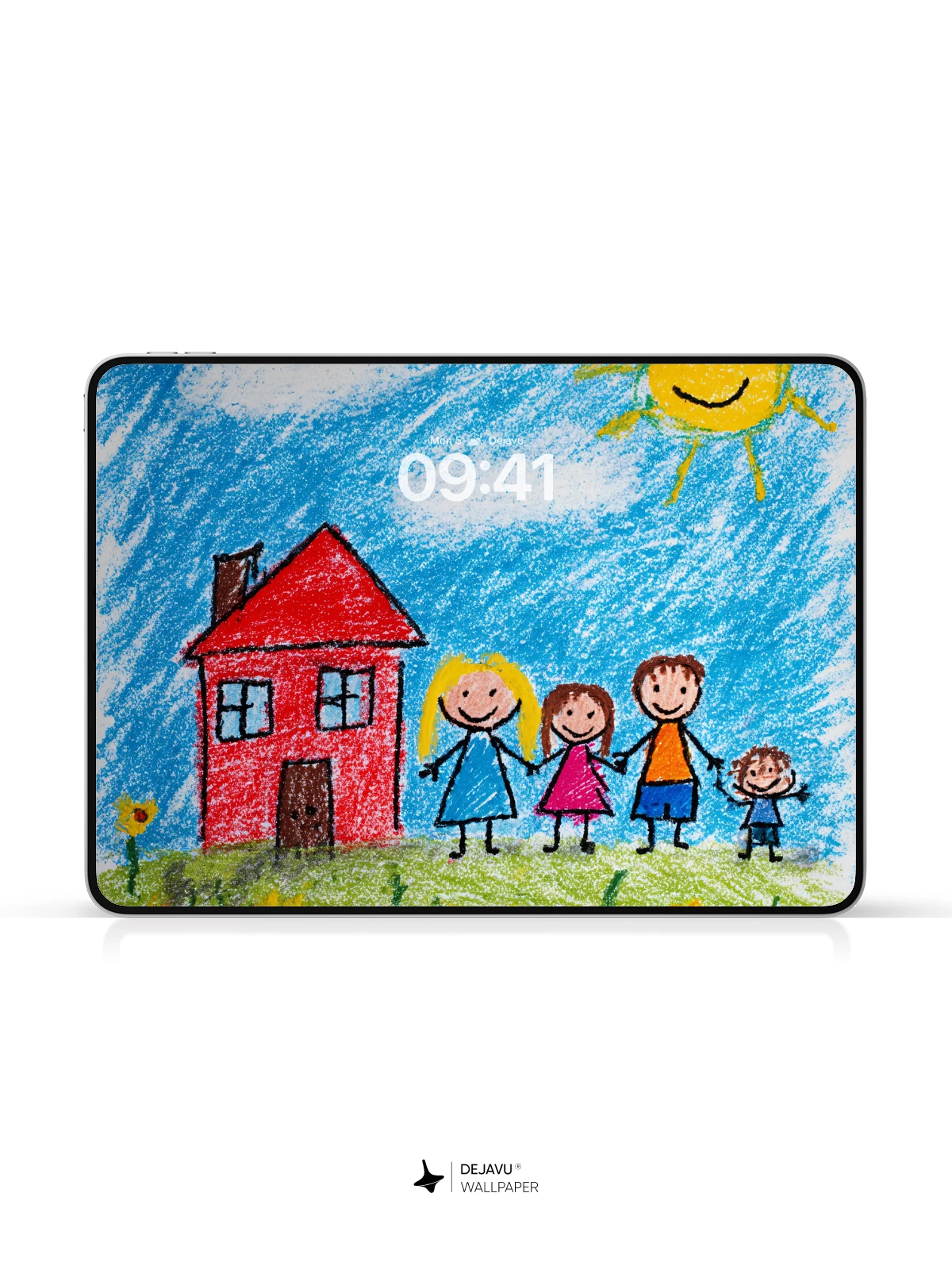 This cheerful, childlike drawing captures a happy family holding hands in front of a cozy red house, set against a vibrant blue sky with a radiant yellow sun. The whimsical style evokes innocence and joy, making it an ideal 8K wallpaper for iPhone, Android, or tablets. With its bold crayon-like strokes and cheerful palette, the artwork brings a sense of warmth and nostalgia to any digital space.