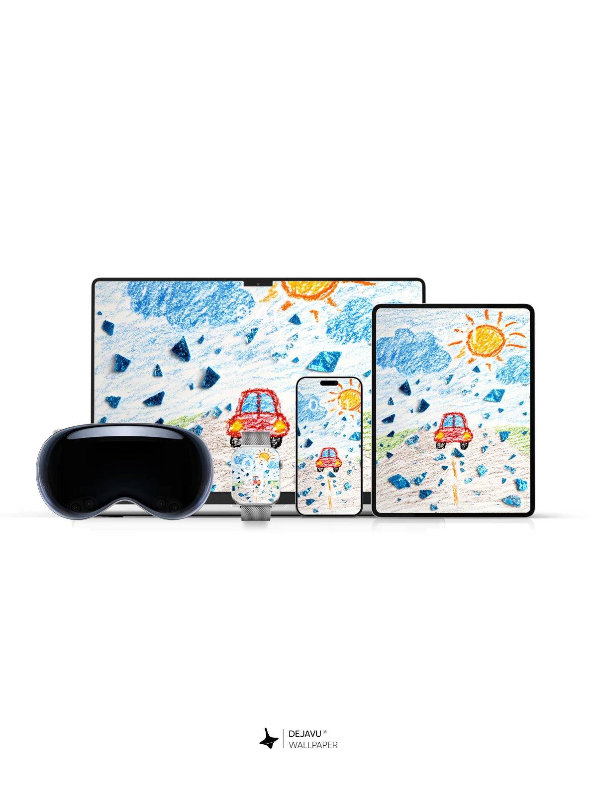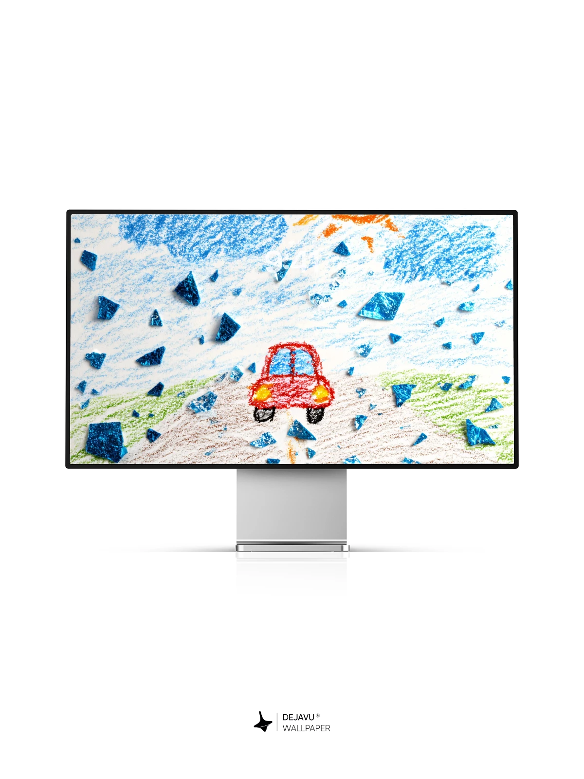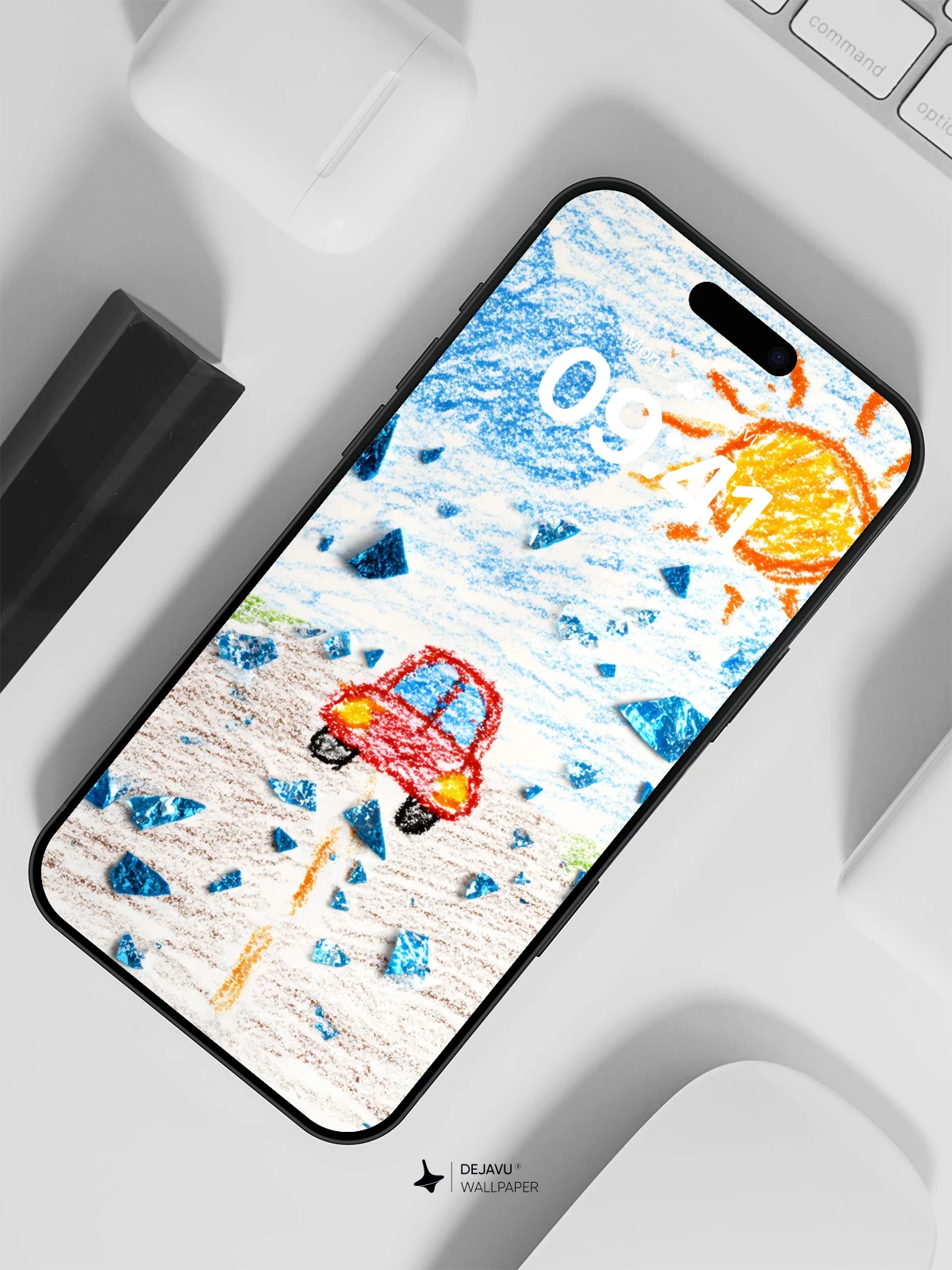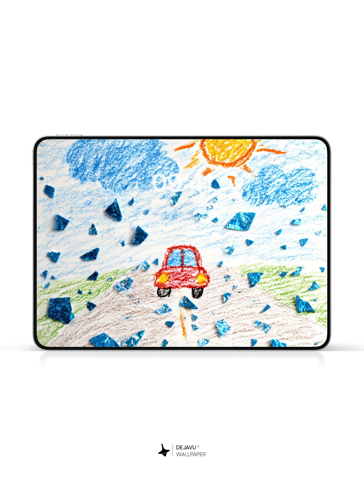 This vibrant, hand-drawn scene captures the joy of a child’s imagination: a cheerful red car travels down a winding road beneath a radiant sun and fluffy clouds, all rendered in colorful crayon strokes. Blue crystalline shards float across the landscape, adding a magical touch to the dreamy journey. The nostalgic, cartoon-like aesthetic evokes feelings of innocence and adventure, making it an ideal 8K wallpaper for iPhone, Android, or tablets—where art meets childhood wonder.