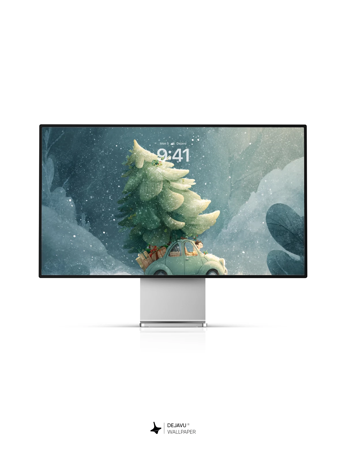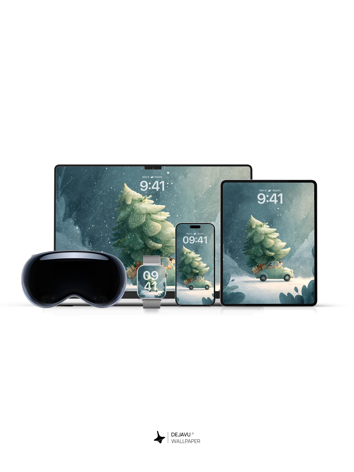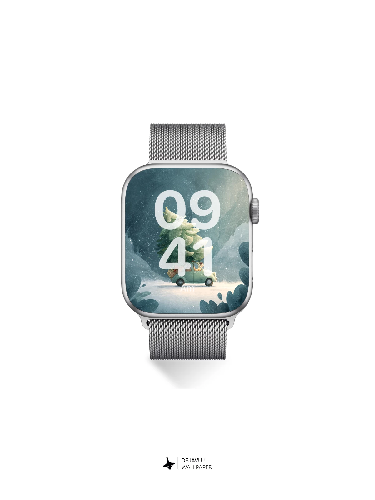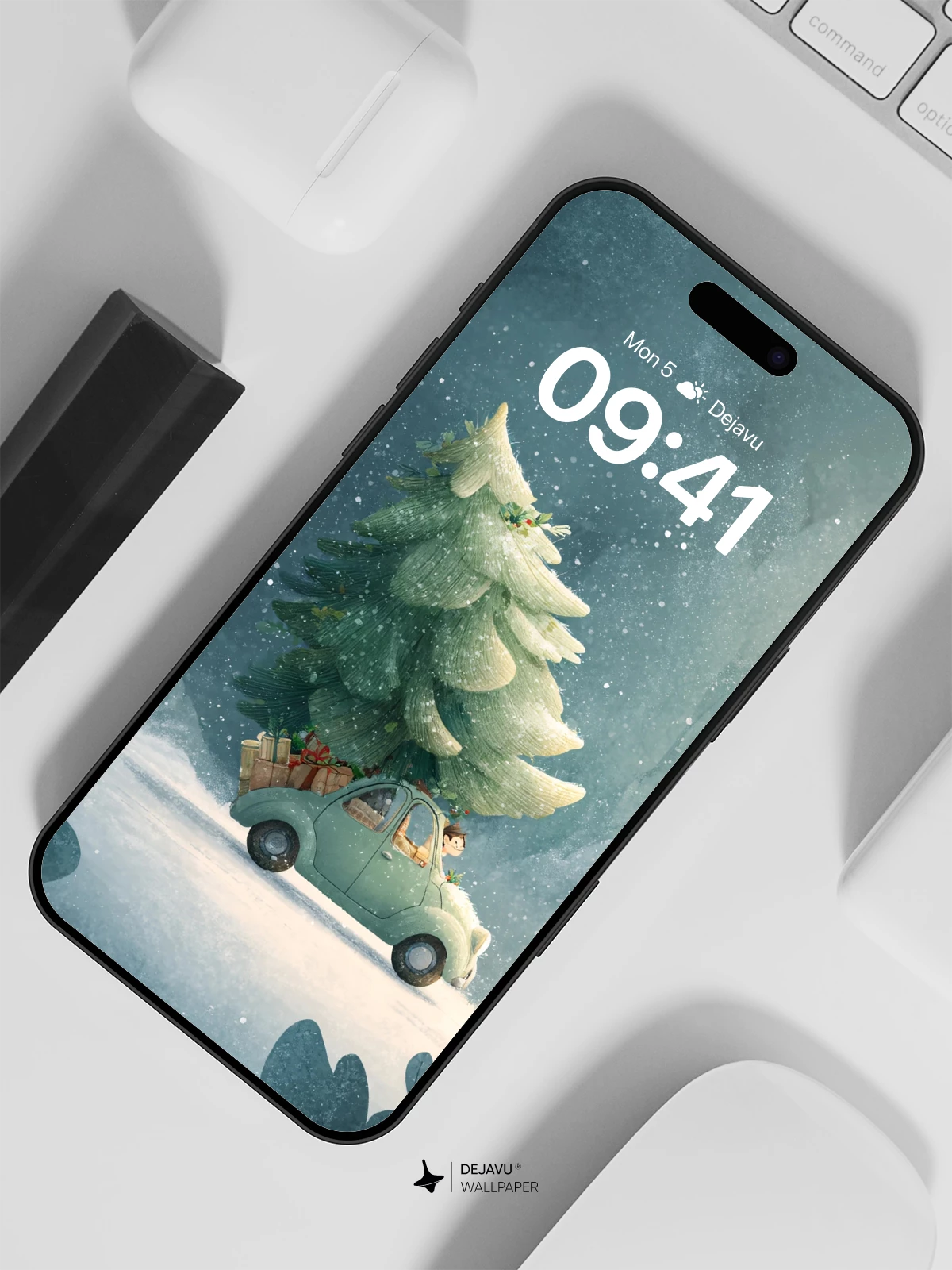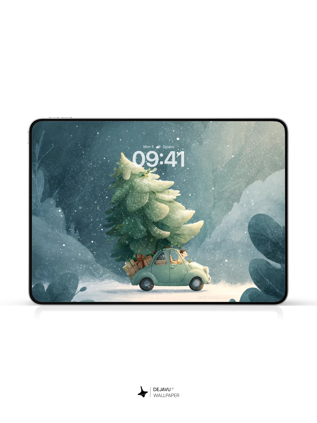 In this enchanting fantasy illustration, a retro green car drives through a dreamy snowstorm, proudly hauling a towering, snow-laden Christmas tree. The soft glow of the headlights cuts through misty blues and silvery whites, evoking warmth and holiday cheer. Inspired by classic fairytale artistry, this magical moment captures the joy of the season with gentle surrealism—ideal as an 8K wallpaper for iPhone, Android, or tablets, bringing festive wonder to your screen.