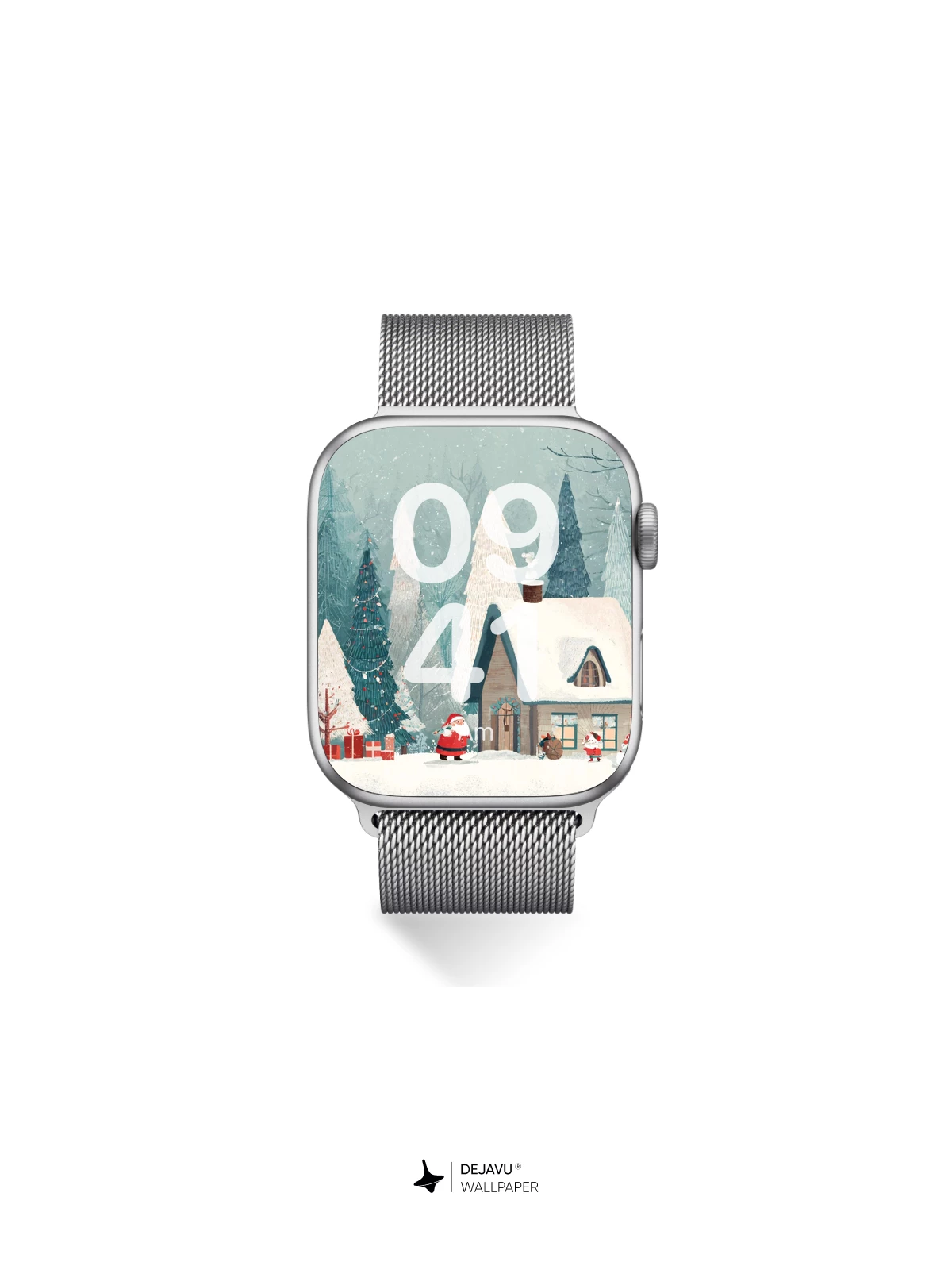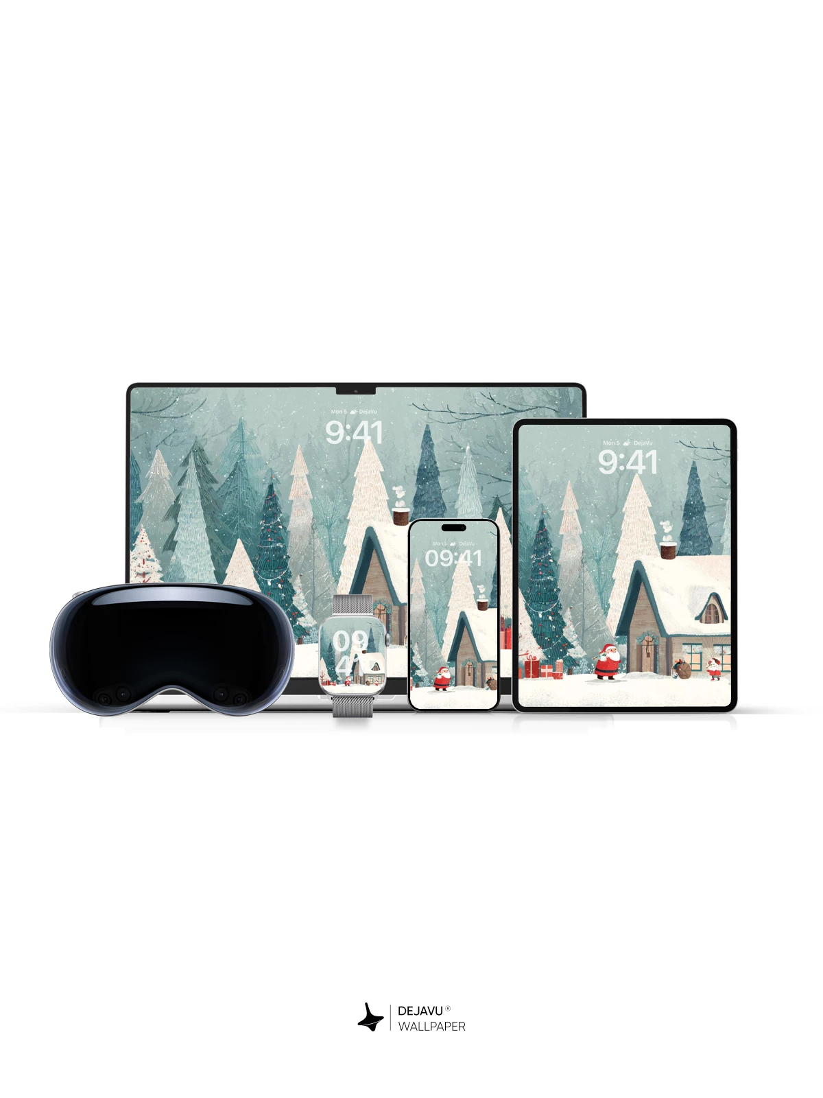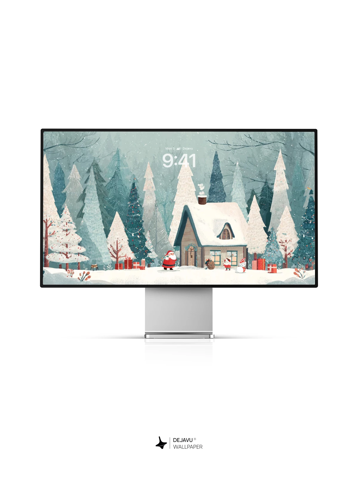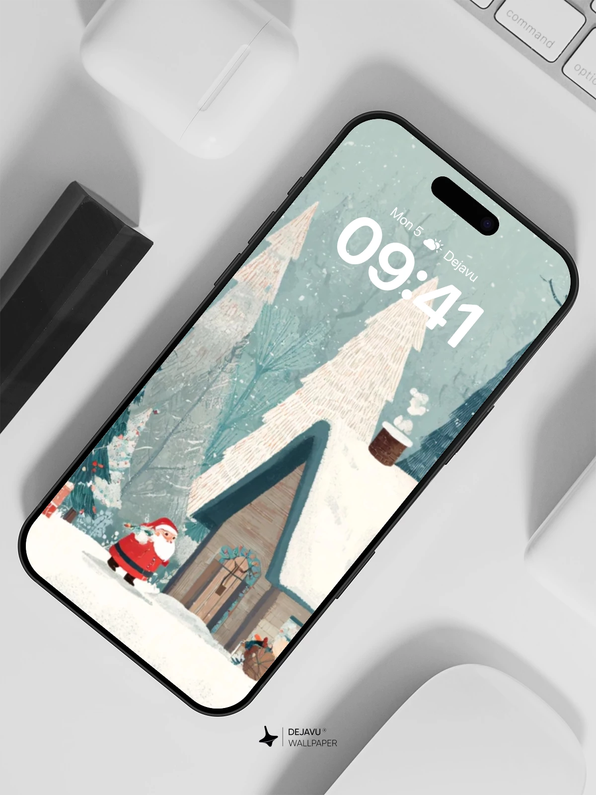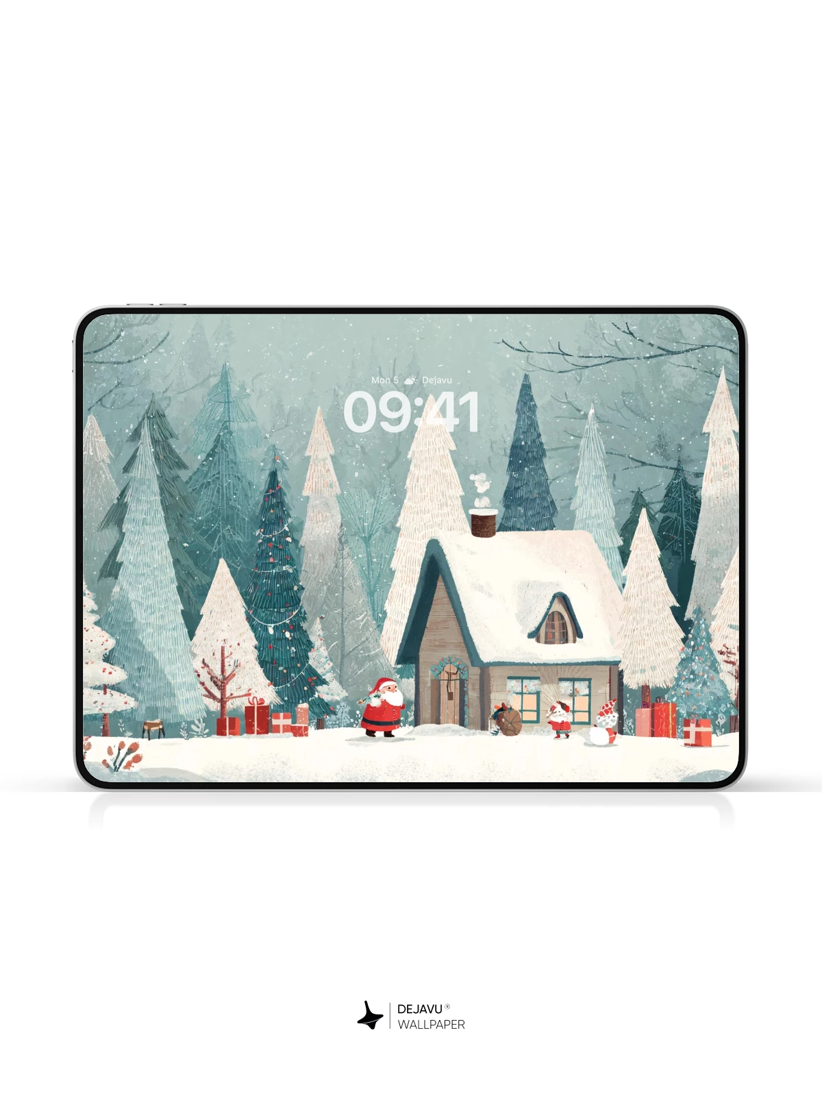 This enchanting winter illustration captures a serene Christmas cottage nestled in a snow-dusted pine forest, where Santa Claus strolls near glowing presents. The whimsical, storybook style evokes warmth and holiday joy, making it an ideal 8K wallpaper for iPhone, Android, or tablet screens. With soft pastel tones and delicate details, this festive design transforms your device into a winter wonderland.