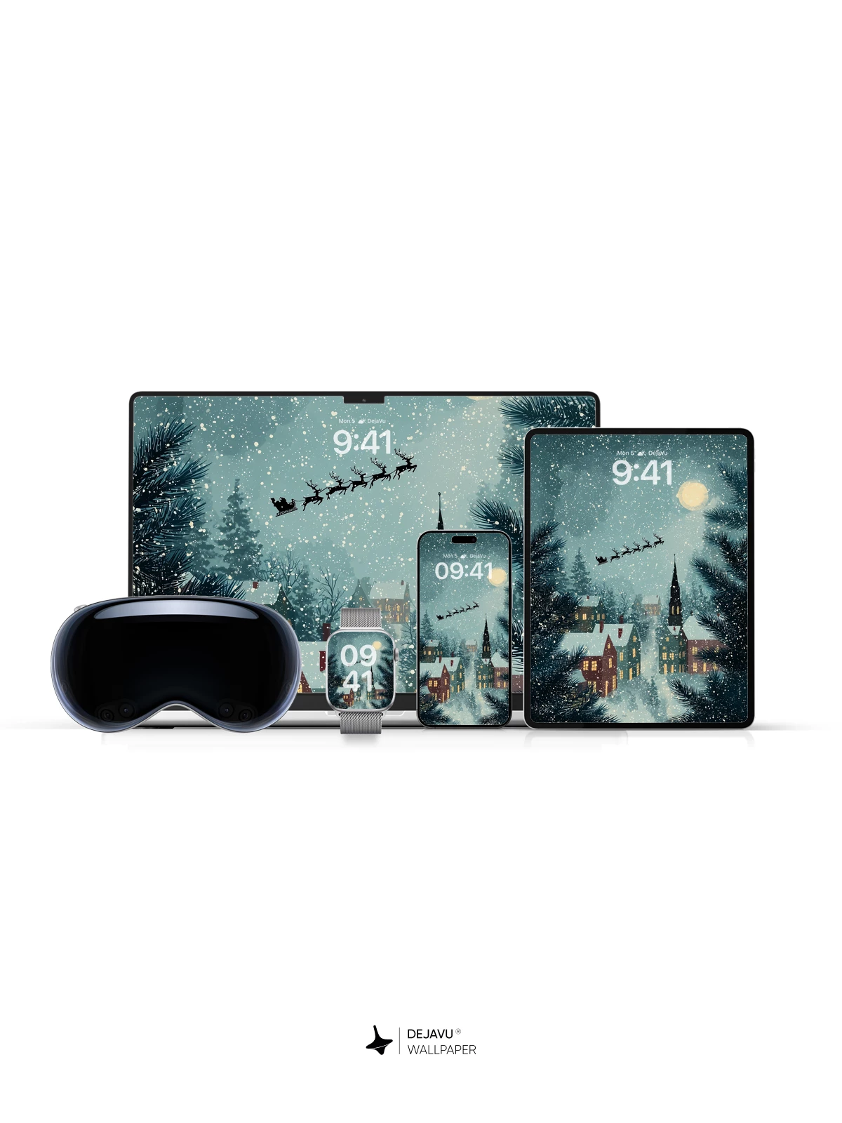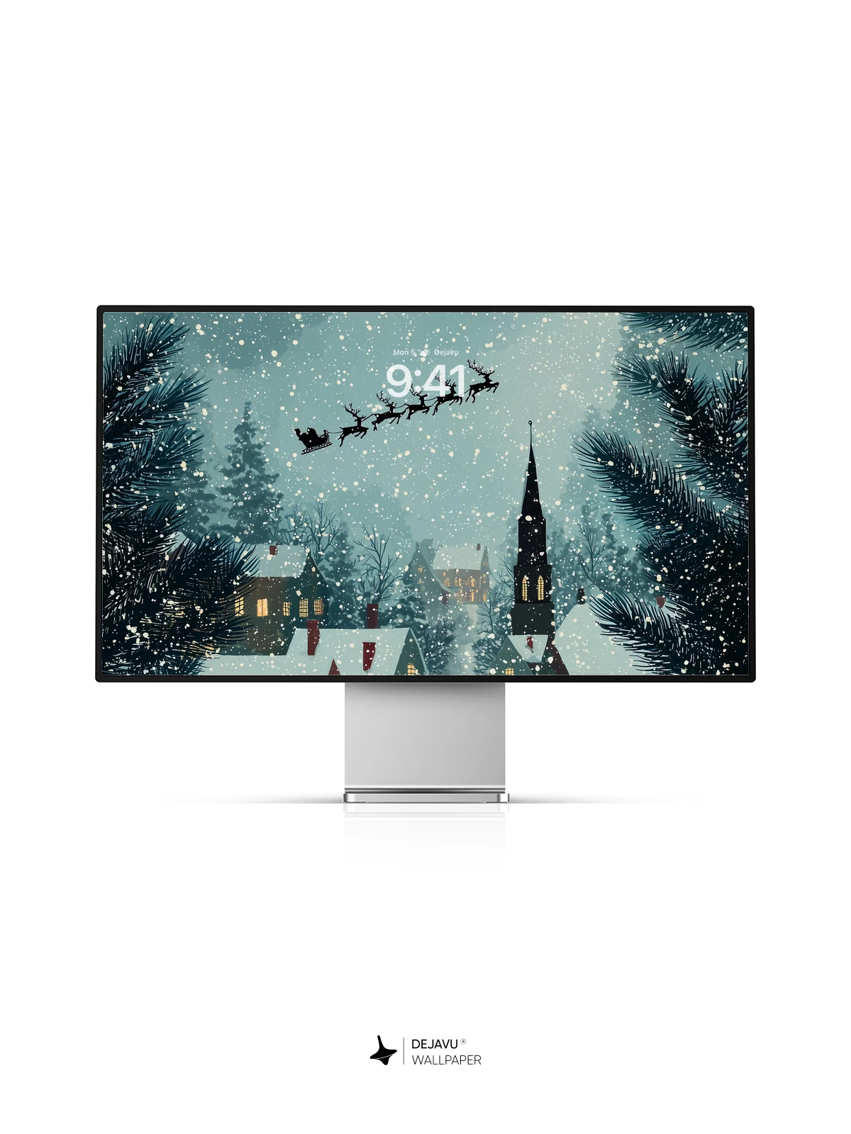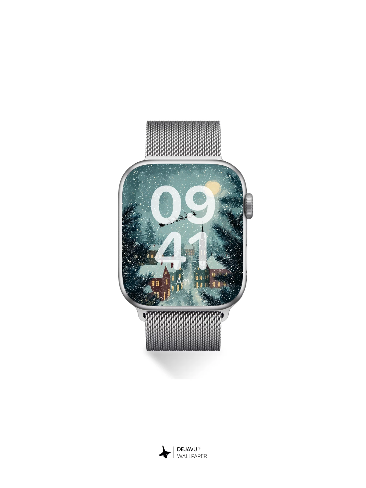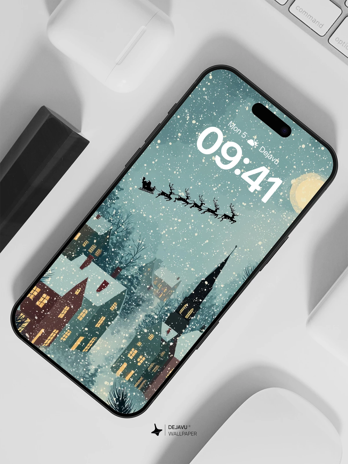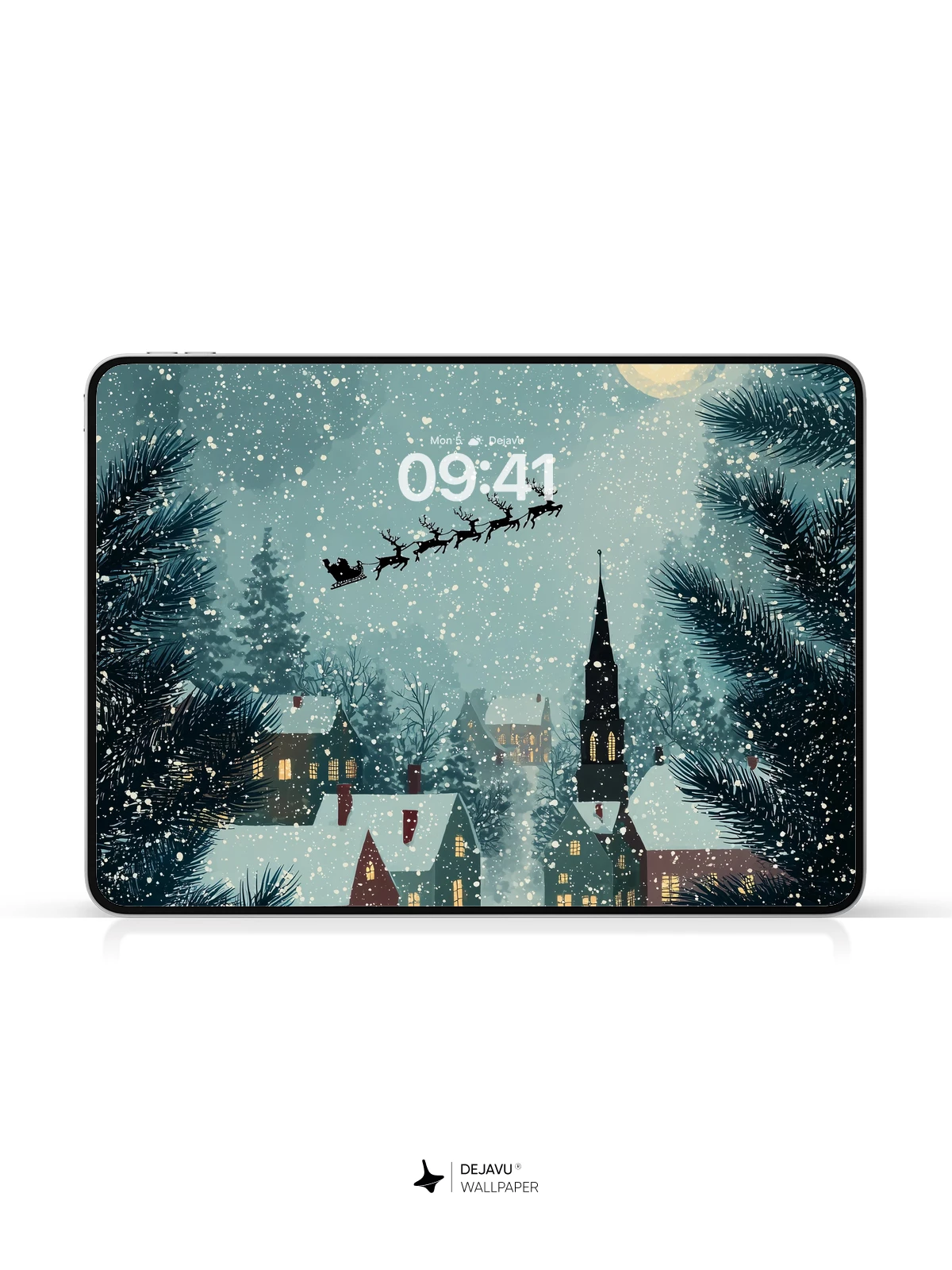 This enchanting 8K wallpaper captures a serene snowy village at night, where warm lights glow from cozy homes beneath a starry sky. Santa’s sleigh glides across the heavens, pulled by reindeer, as snowflakes gently fall. Framed by pine branches, the scene blends whimsy and tranquility, evoking holiday wonder. Inspired by classic illustrative storytelling, it’s ideal for iPhone, Android, or tablet screens seeking festive elegance.