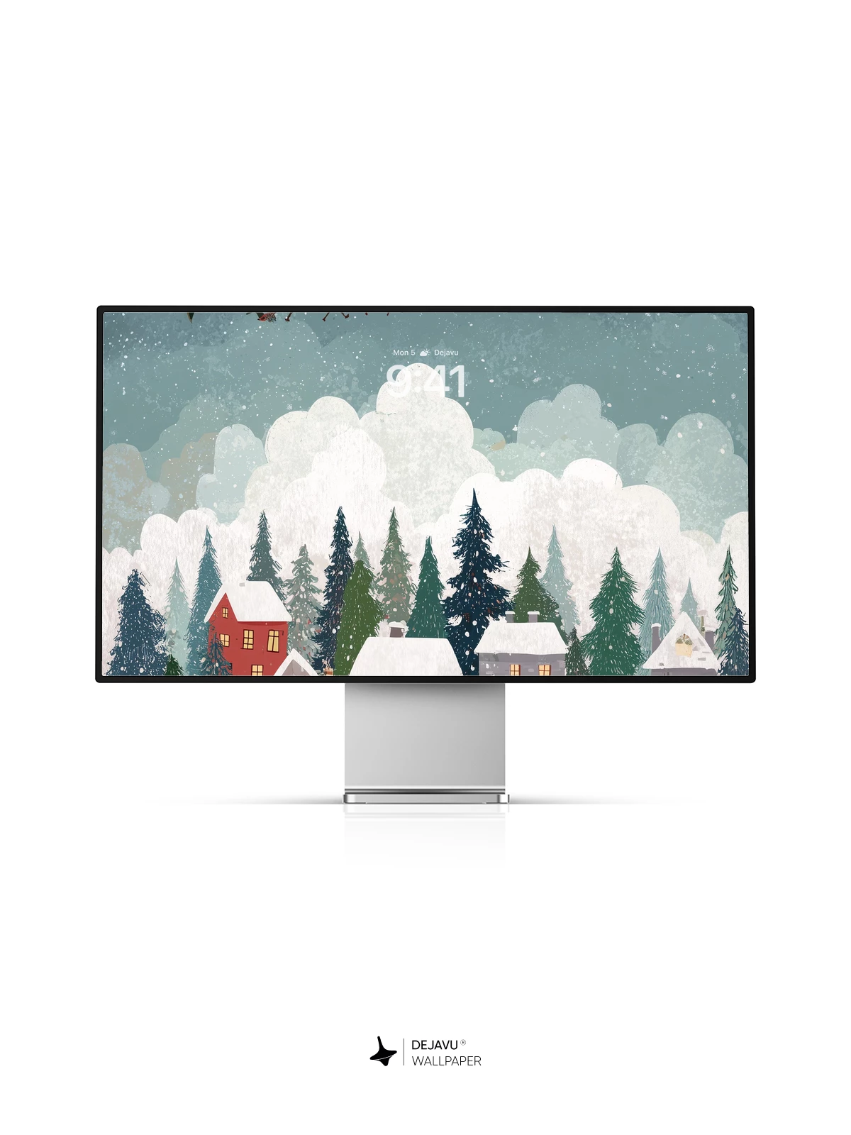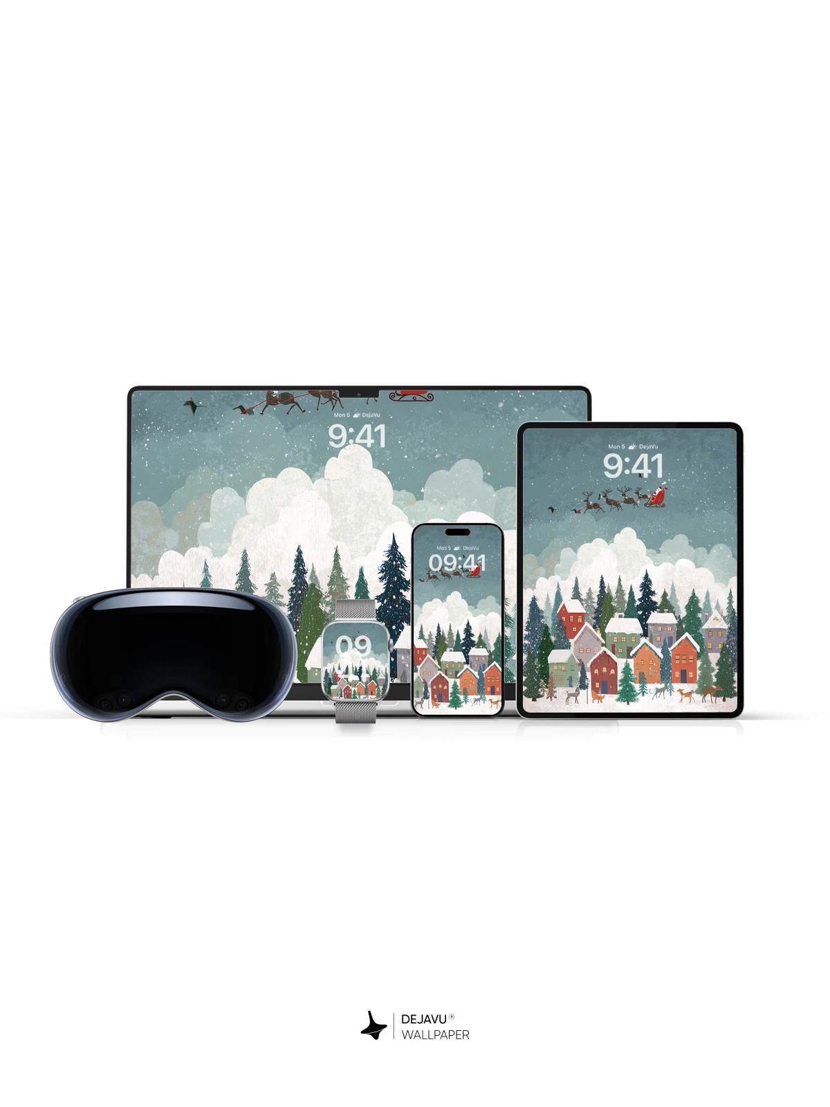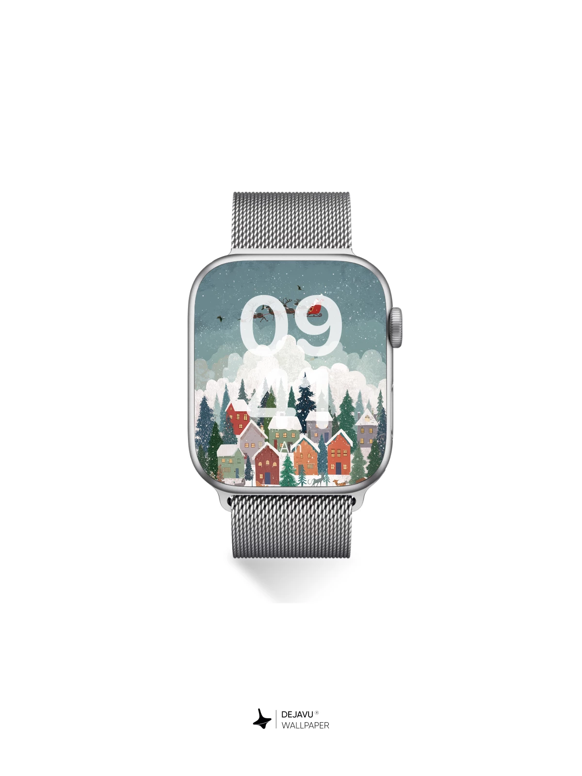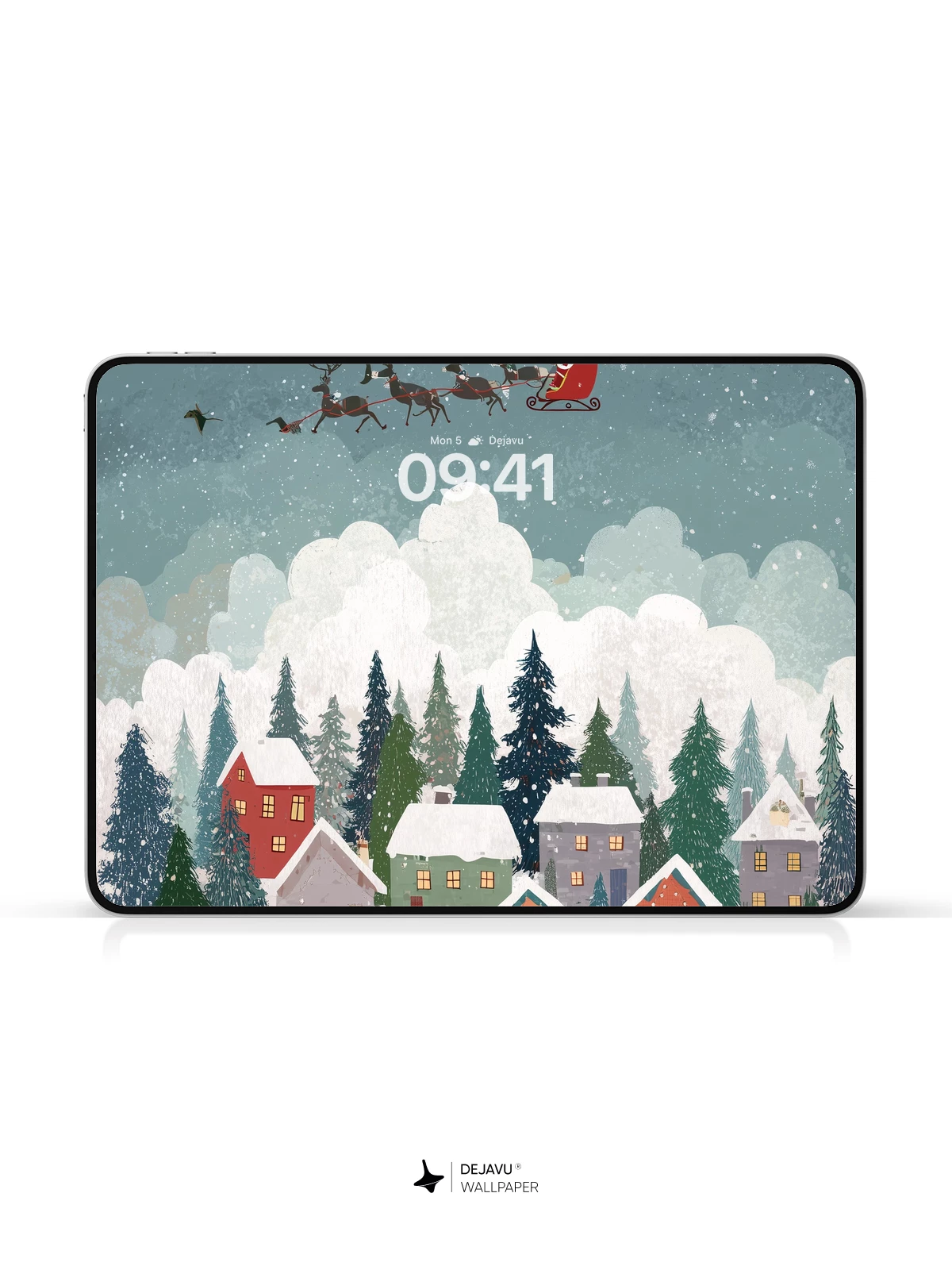 This enchanting Christmas scene captures a peaceful village nestled among pine trees under a starry sky, as Santa Claus flies overhead in his sleigh pulled by reindeer. Snowflakes gently fall, illuminating rooftops and windows aglow with warm light, while deer wander below. The whimsical, illustrated style evokes the timeless joy of the holiday season—ideal as an 8K wallpaper for iPhone, Android, or tablets, bringing festive cheer to your device.