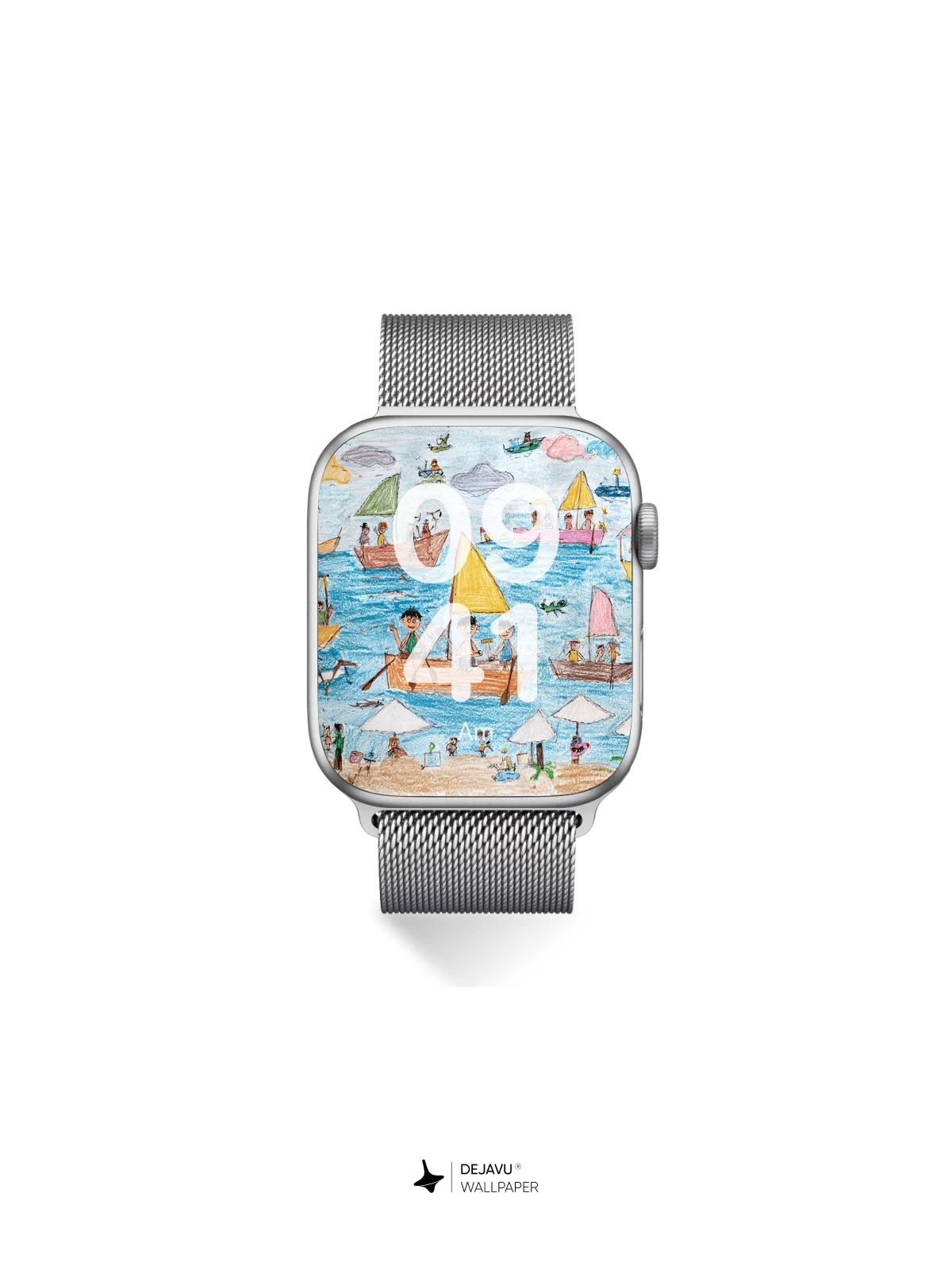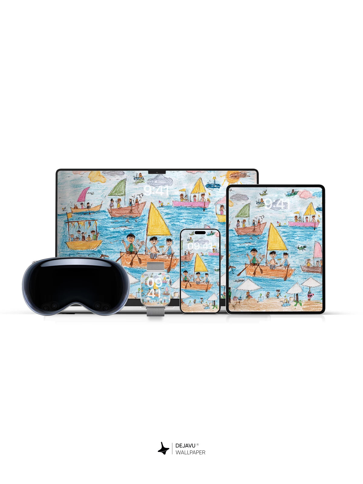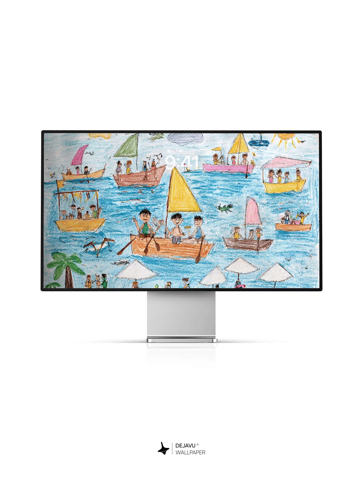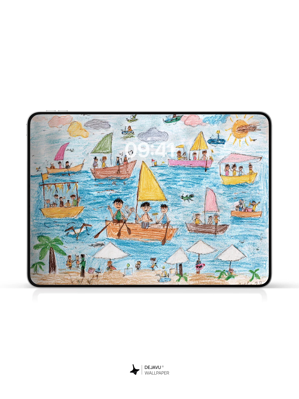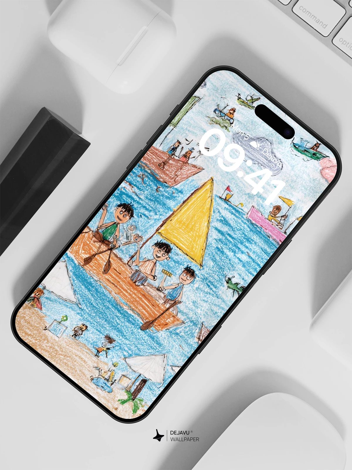 This cheerful, hand-drawn illustration captures a joyful seaside scene filled with sailboats, playful children, and colorful umbrellas on a sandy shore. Inspired by the whimsical charm of children’s art, it evokes a sense of carefree summer fun and imagination. The bright colors and dynamic composition make it an ideal 8K wallpaper for iPhone, Android, or tablet devices, bringing warmth and happiness to any screen.