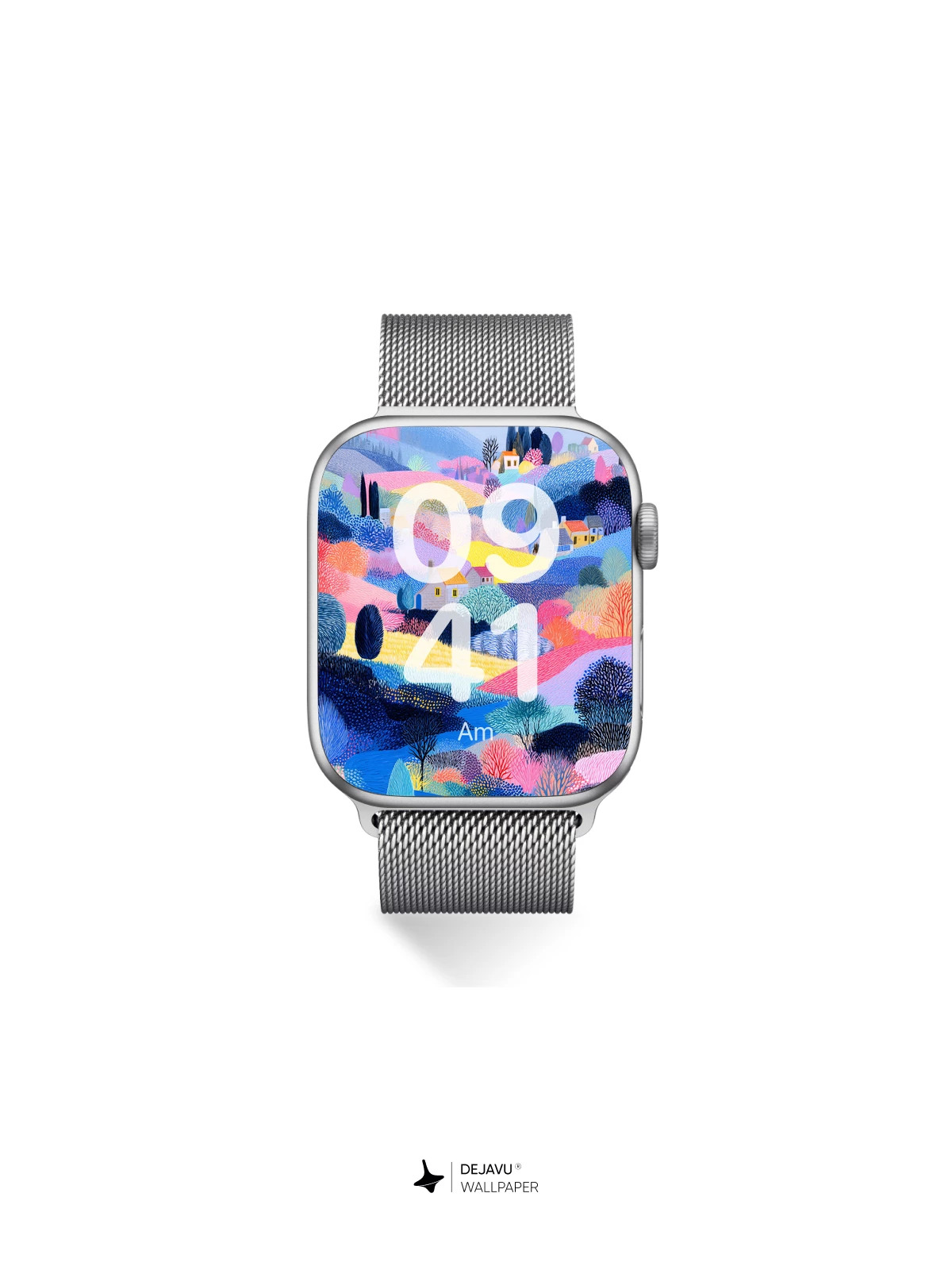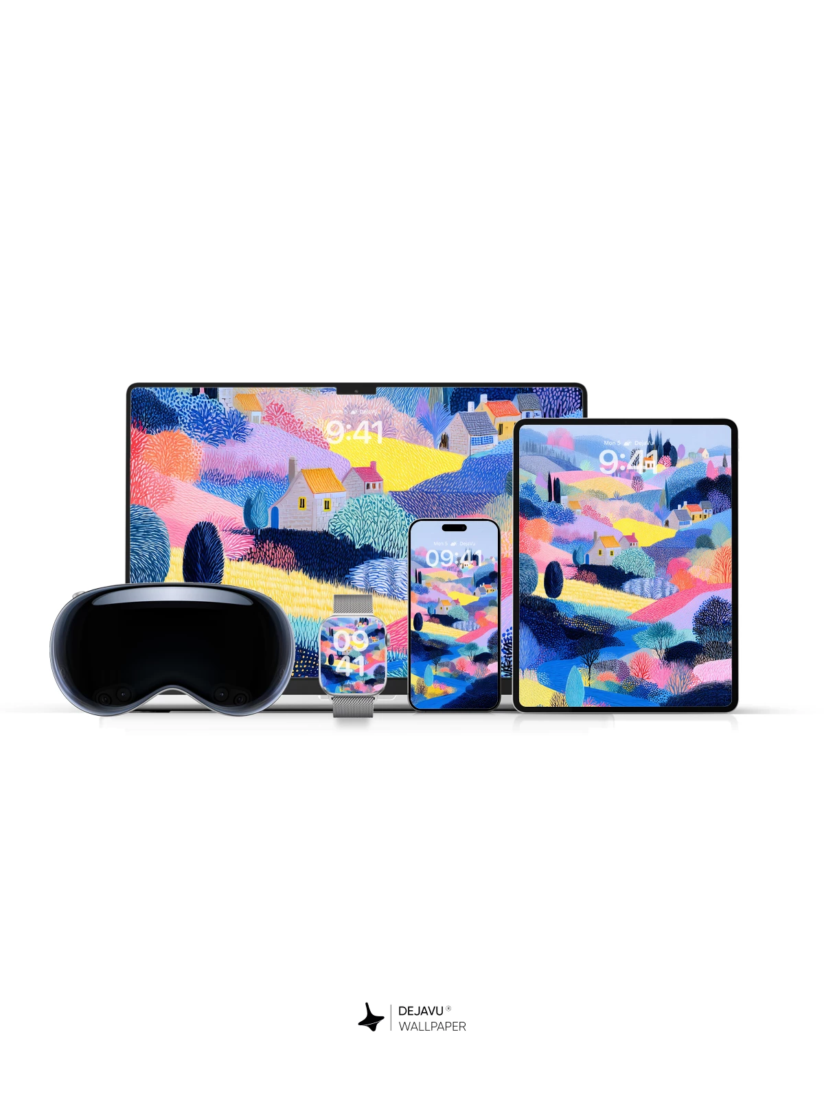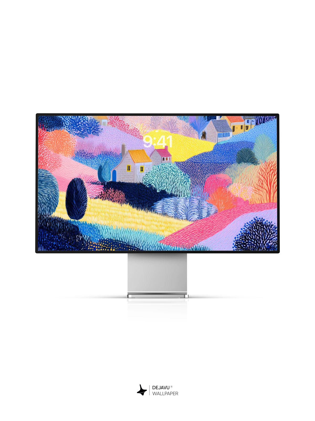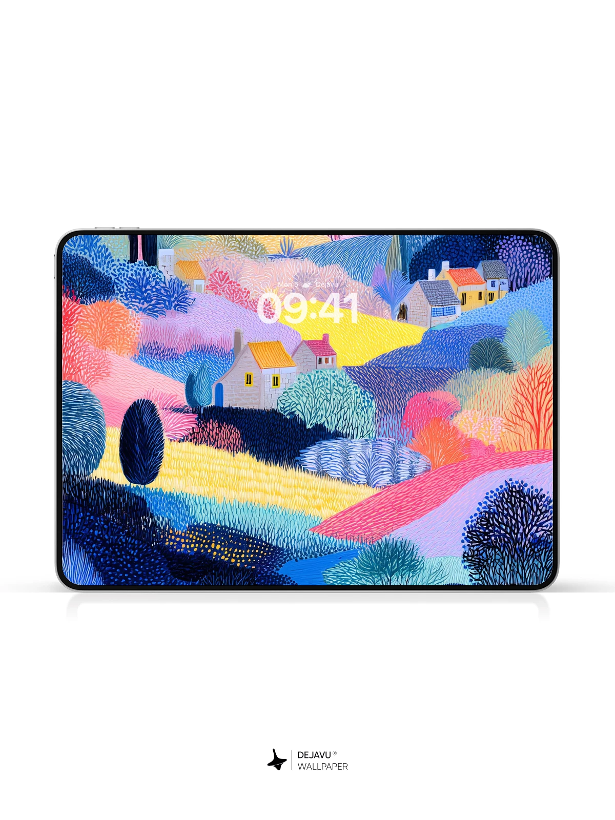 This wallpaper showcases a whimsical, pointillist landscape with colorful rolling hills and textured trees. Its playful composition and bright palette bring a lively, artistic touch to your iPhone, Android, or tablet screen.