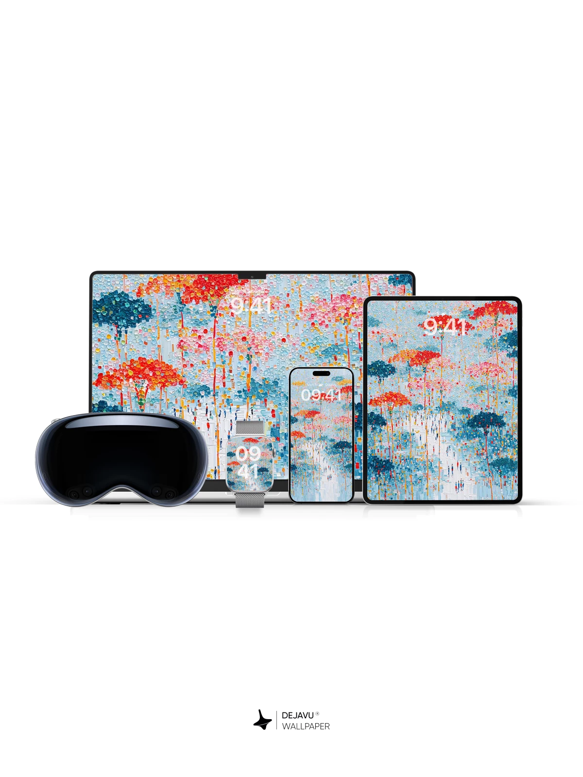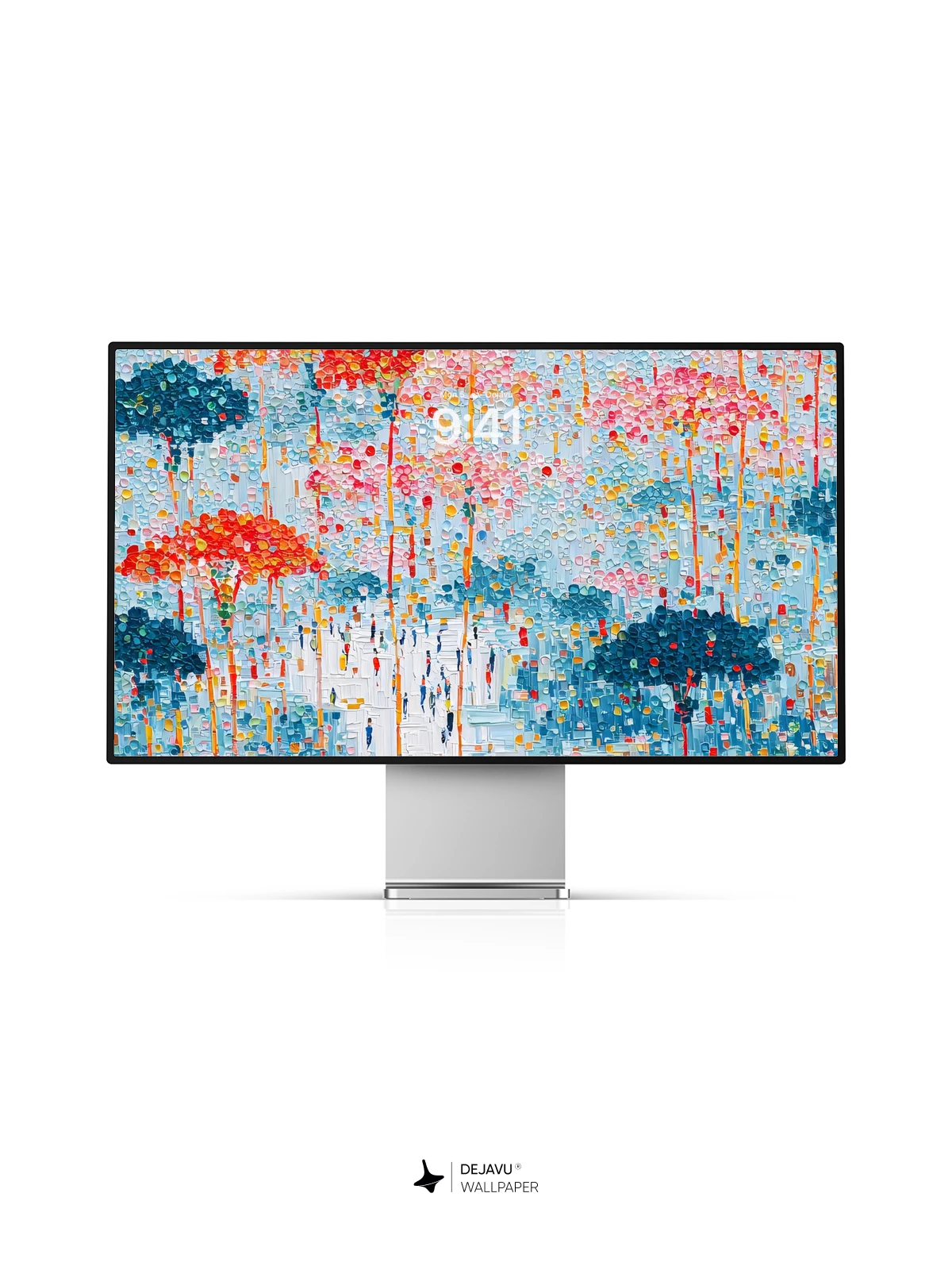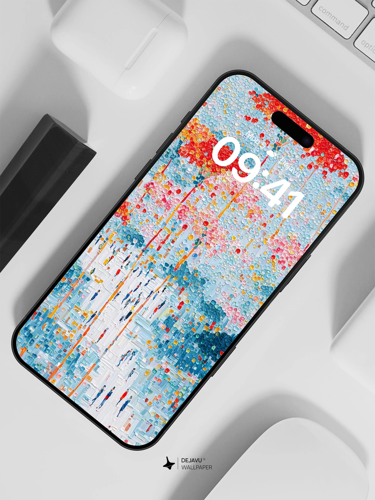 Inspired by the delicate textures of pointillism, this enchanting artwork transforms a rainy cityscape into a surreal garden where colorful umbrellas bloom like flowers. Tiny figures walk beneath glowing canopies, creating a poetic balance between urban life and nature’s whimsy. The soft palette of blues, pinks, and fiery reds brings warmth and serenity, making it ideal as an 8K wallpaper for iPhone, Android, or tablets. Embrace the magic of everyday moments with this artistic vision that turns rain into celebration.
