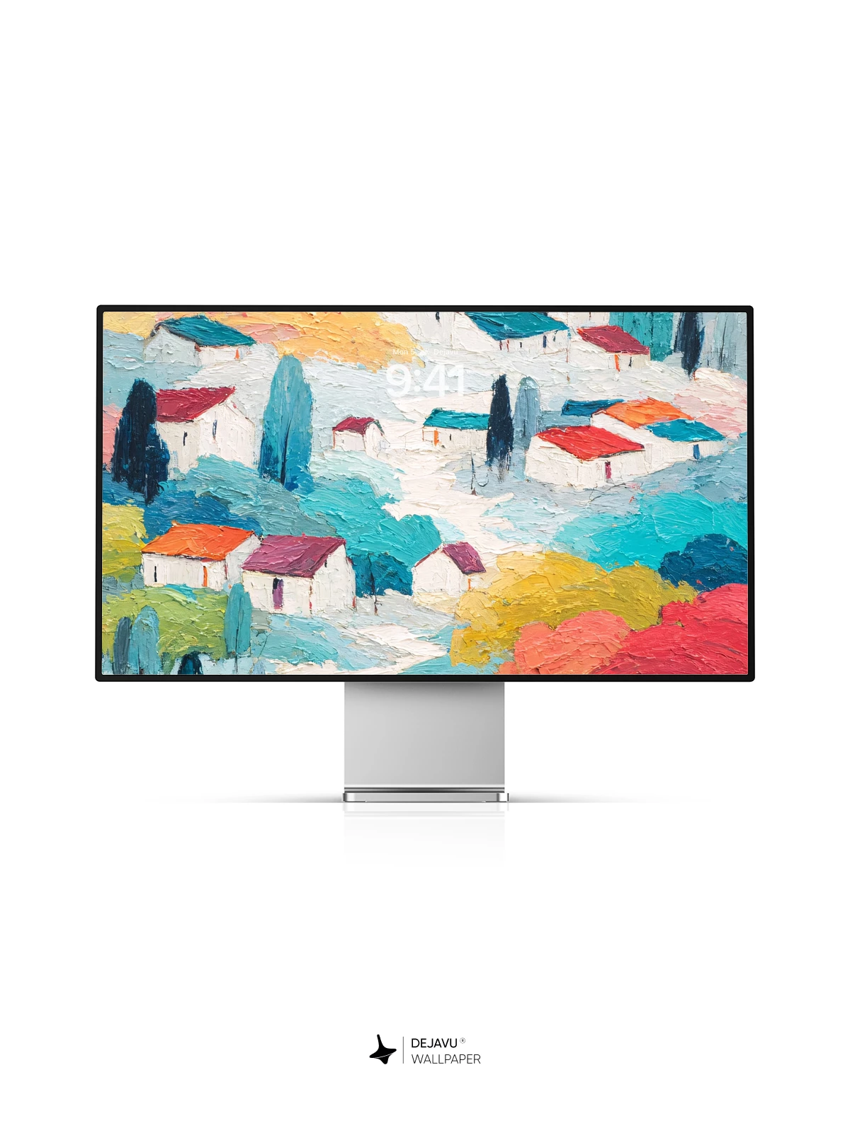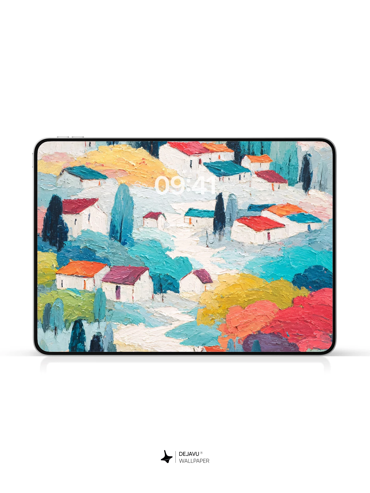 This captivating 8K wallpaper showcases a whimsical village nestled in rolling hills, painted with rich, layered textures reminiscent of modern impressionism. Bright rooftops in red, orange, and teal pop against lush greenery and dreamy skies, evoking a sense of peaceful harmony and artistic joy. Ideal for iPhone, Android, or tablets, it transforms your device into a canvas of serene beauty. The expressive brushstrokes and vivid palette bring warmth and personality to your home screen, making every glance feel like a moment of calm inspiration.