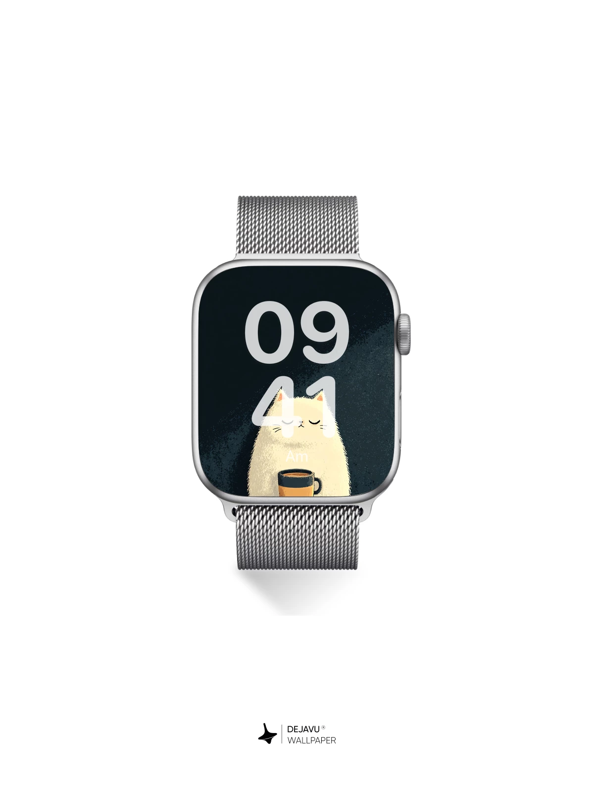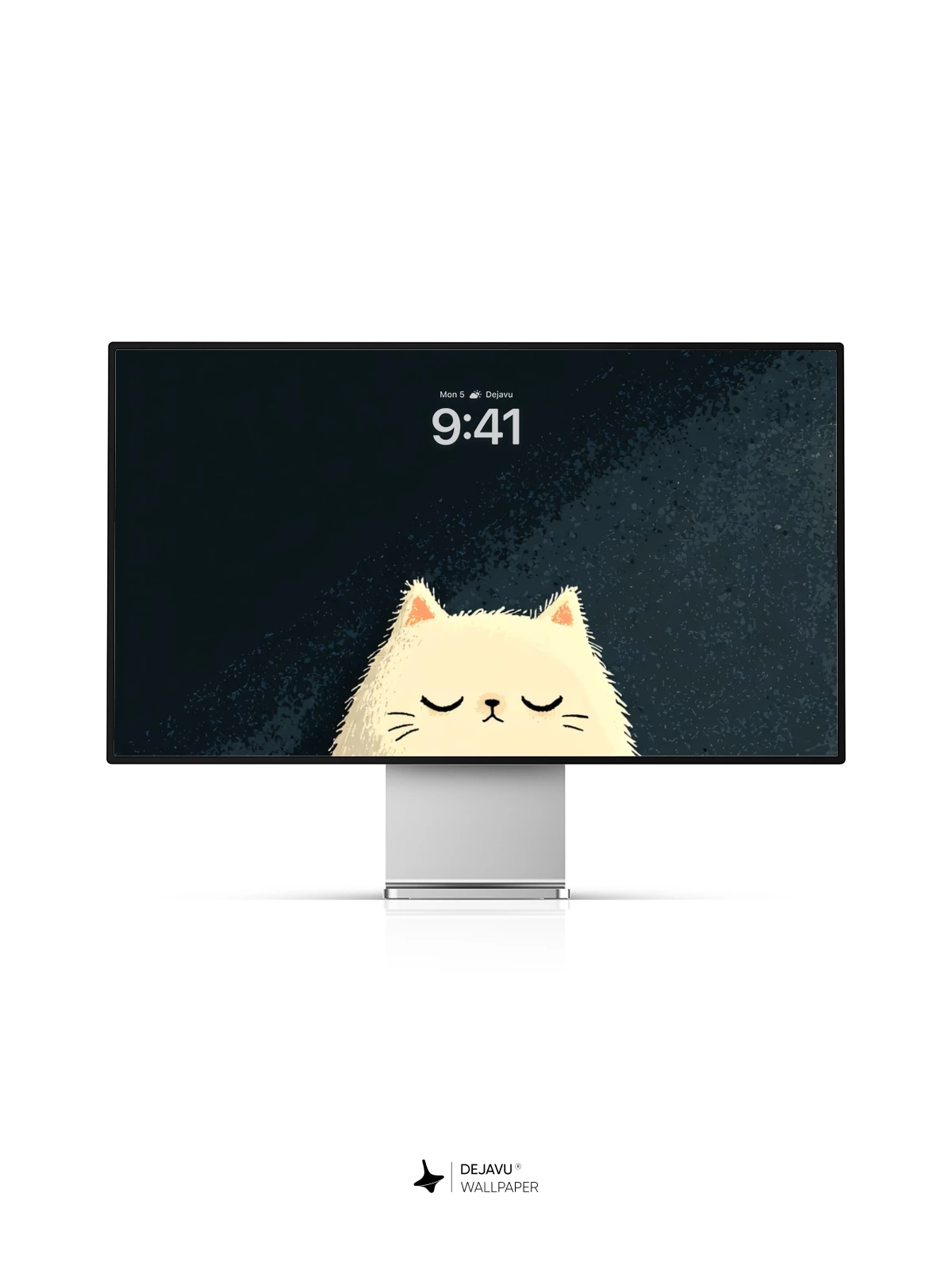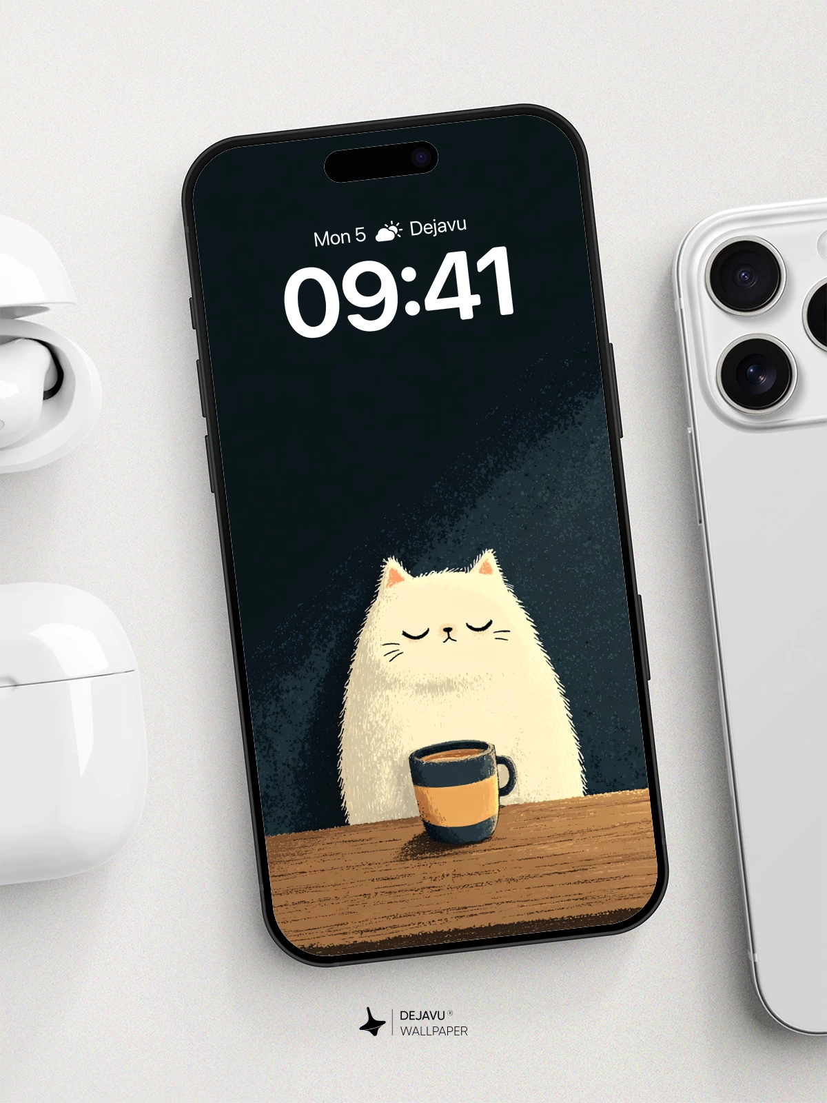This charming illustration features a fluffy white cat with closed eyes, radiating peace as it sits beside a steaming mug of coffee on a wooden table. Set against a deep navy background with subtle texture, the scene evokes quiet contemplation and comfort. The soft lighting and gentle brushwork create a soothing atmosphere ideal for any digital space. Designed in a minimalist, modern cartoon style, this 8K wallpaper brings warmth and whimsy to your iPhone, Android, or tablet screen—perfect for those who love cats, coffee, and calm moments.