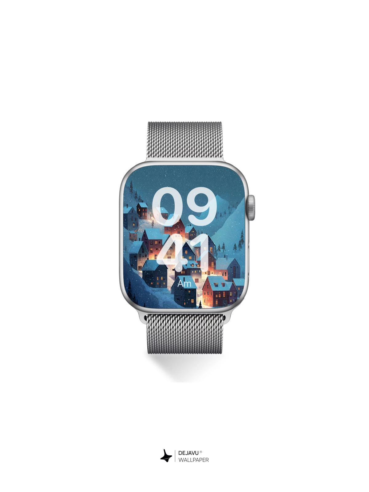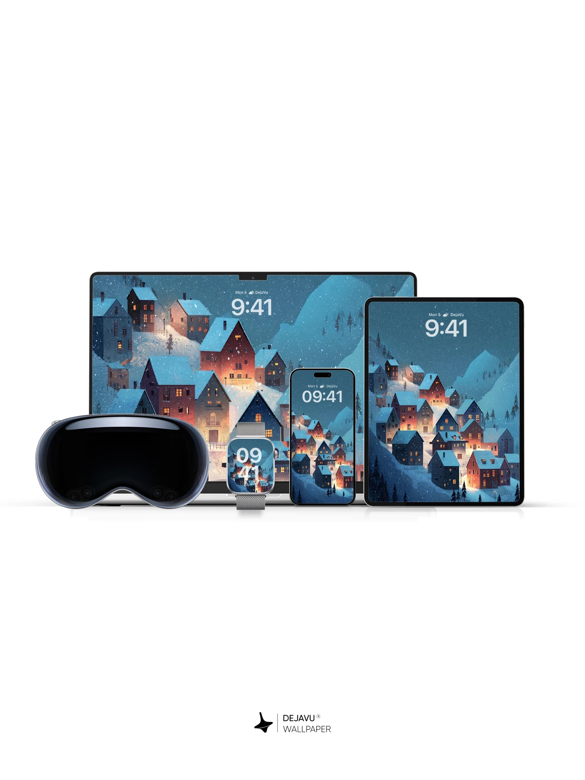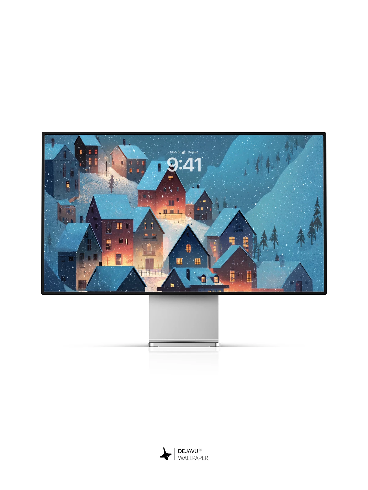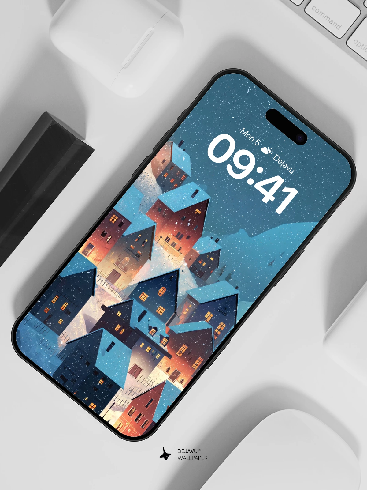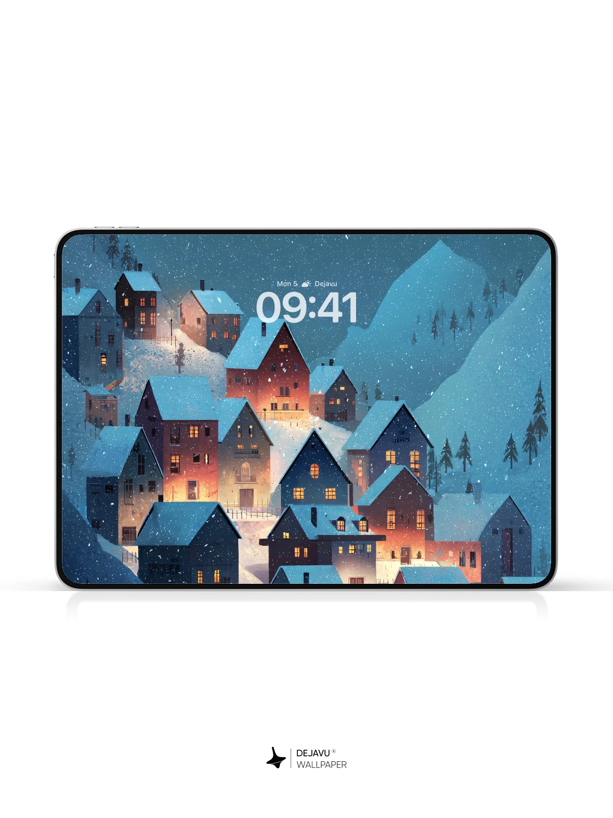 Nestled in snow-draped mountains, this enchanting winter village radiates warmth through glowing windows, creating a dreamy contrast against the cool blue night. Snowflakes drift gently, illuminating the peaceful scene with soft light and quiet magic. Inspired by whimsical illustrative art, it captures the soul of a tranquil alpine evening—perfect as an 8K wallpaper for iPhone, Android, or tablets. Embrace cozy charm and seasonal beauty on your device.