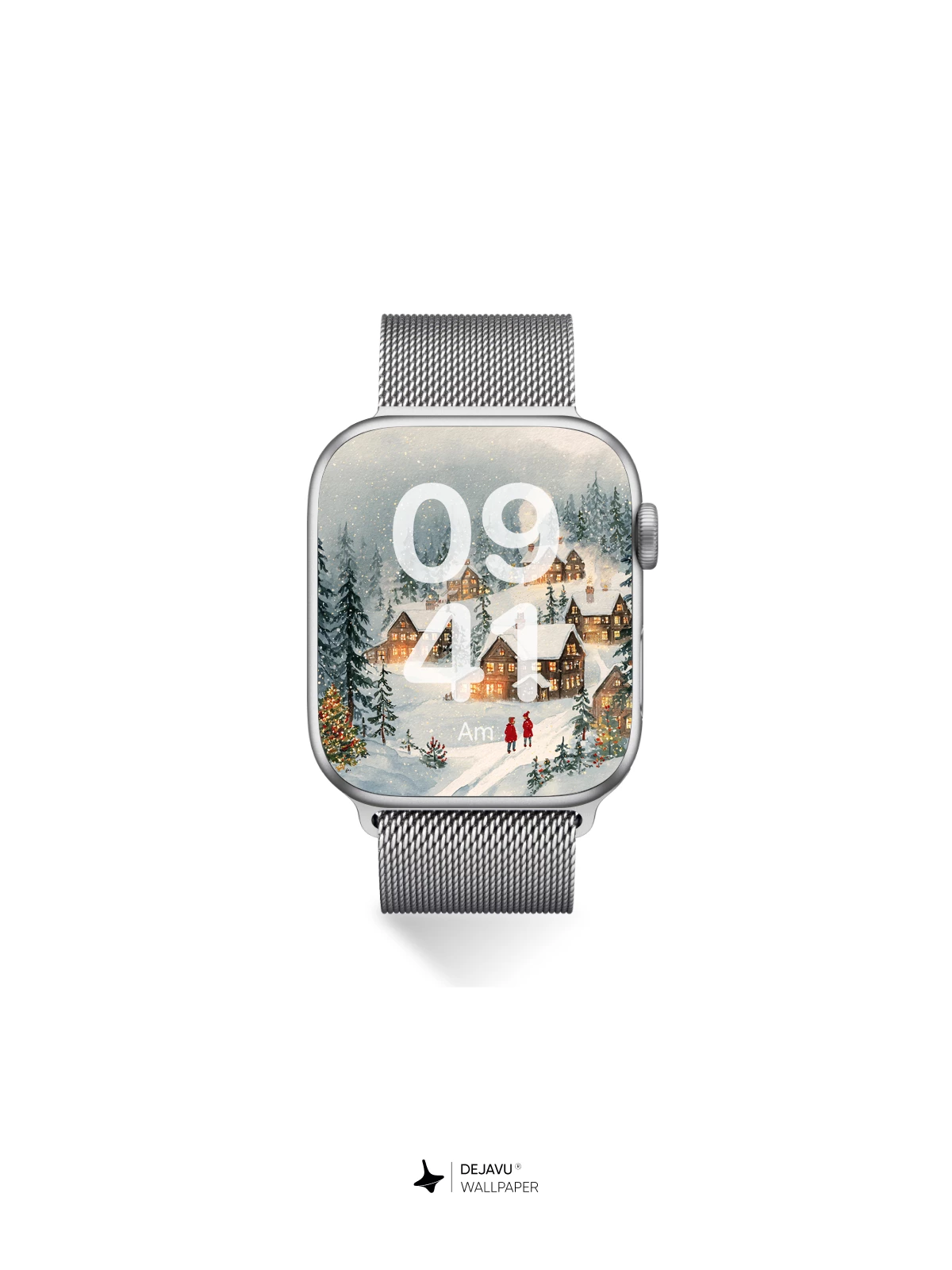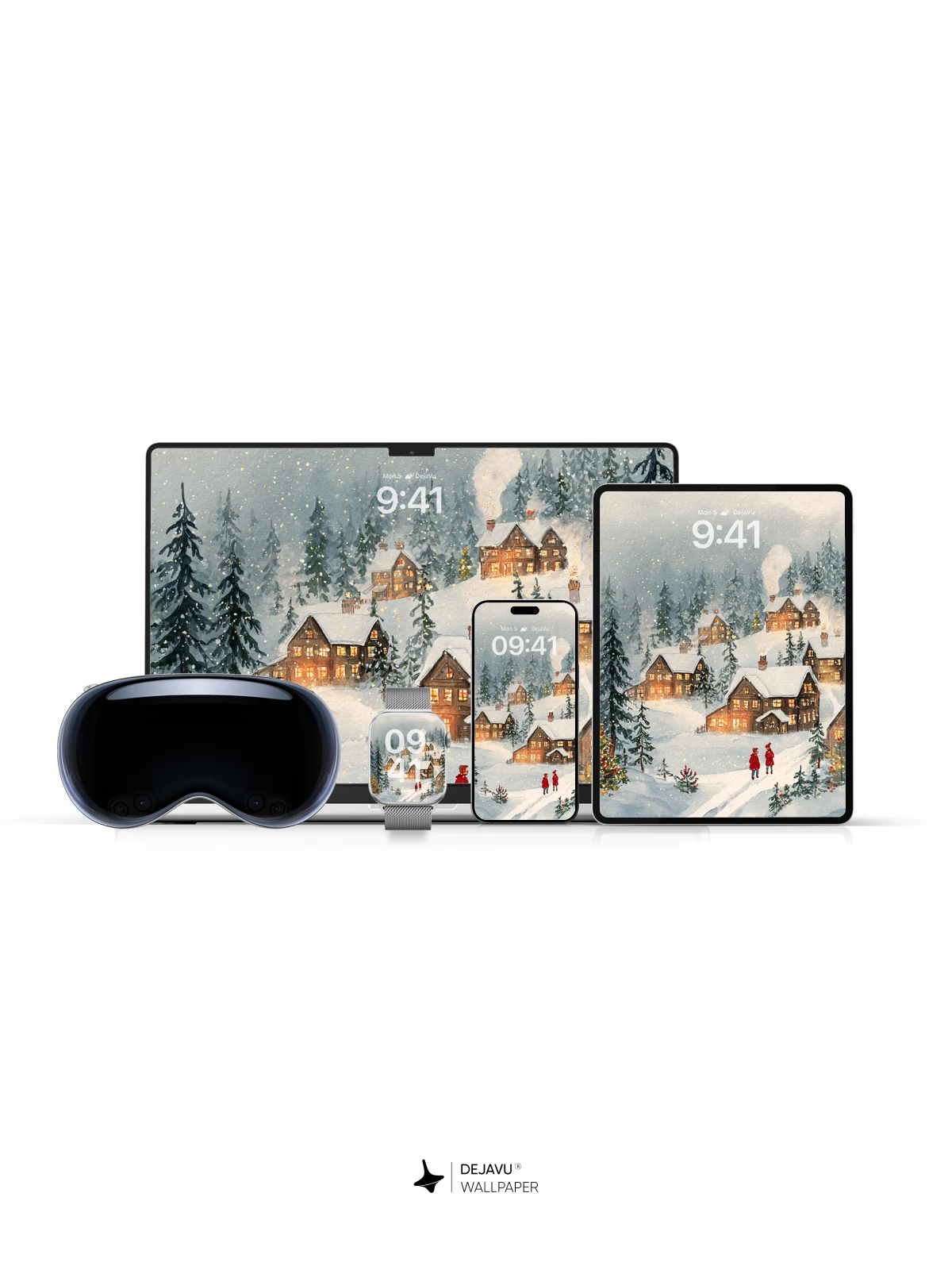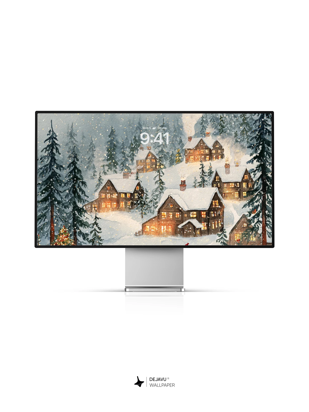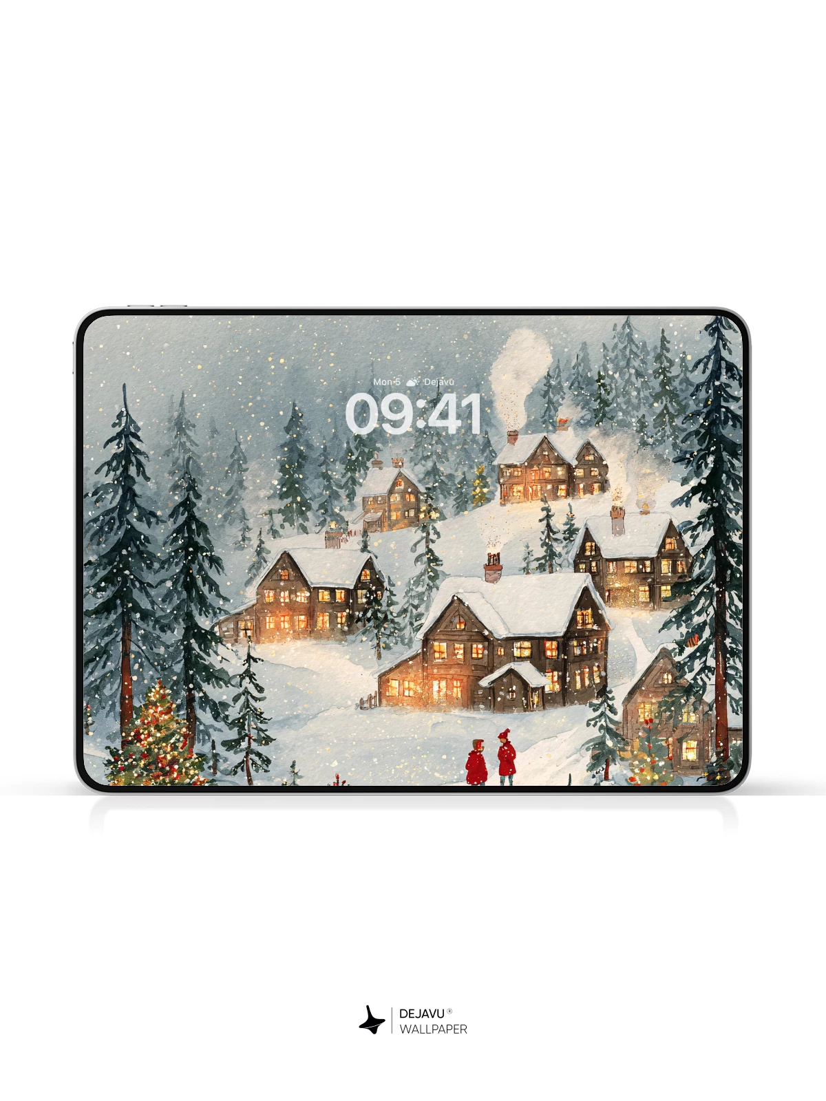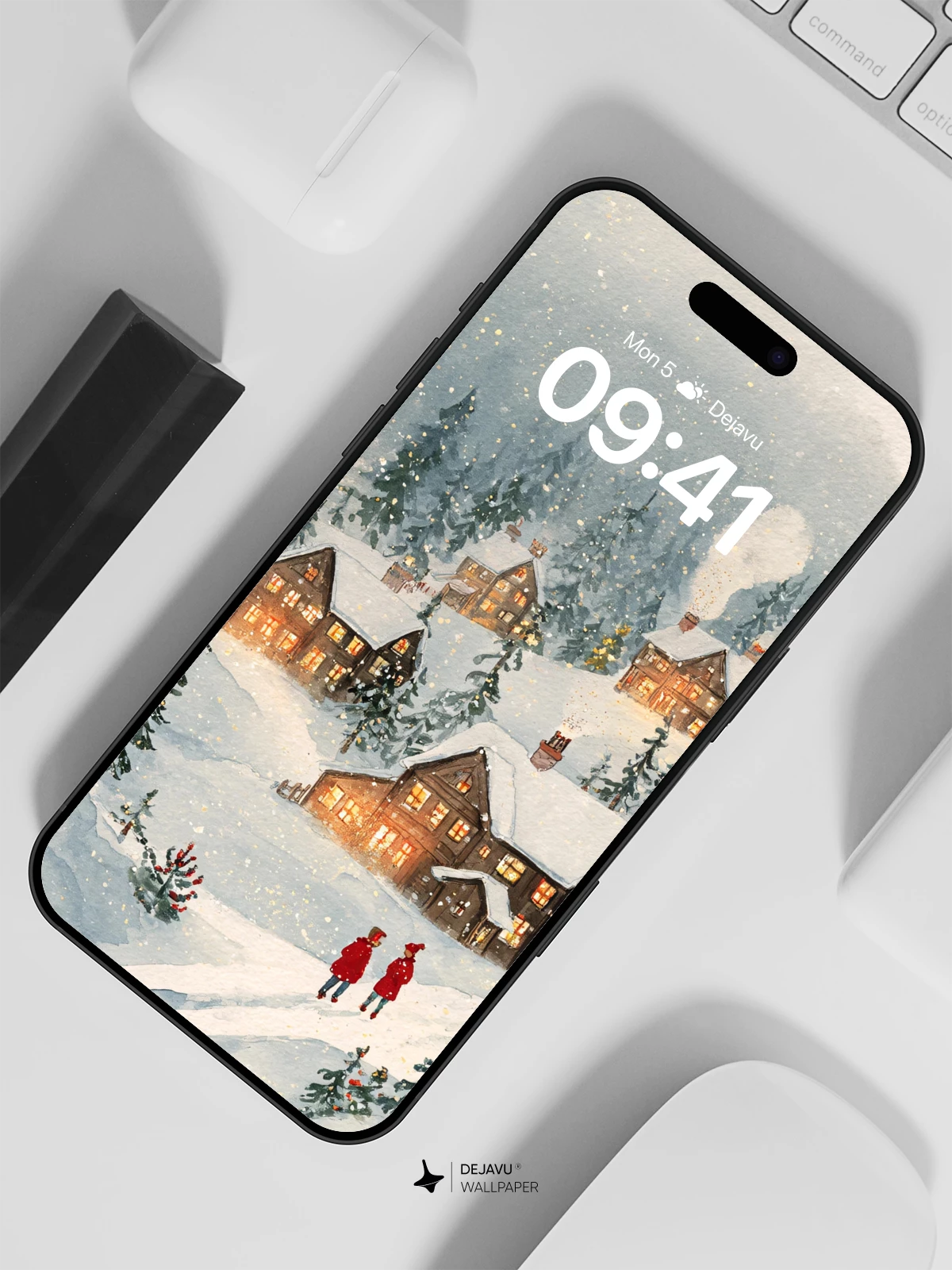 This enchanting winter scene captures a serene alpine village blanketed in snow, where wooden cottages emit golden light and smoke curls from chimneys into the frosty air. Tall evergreens frame the landscape, and two figures walk hand-in-hand along a snow-dusted path, evoking peace and holiday warmth. Inspired by classic illustrative styles reminiscent of Norman Rockwell’s nostalgic charm, this 8K wallpaper brings timeless coziness to your iPhone, Android, or tablet screen.