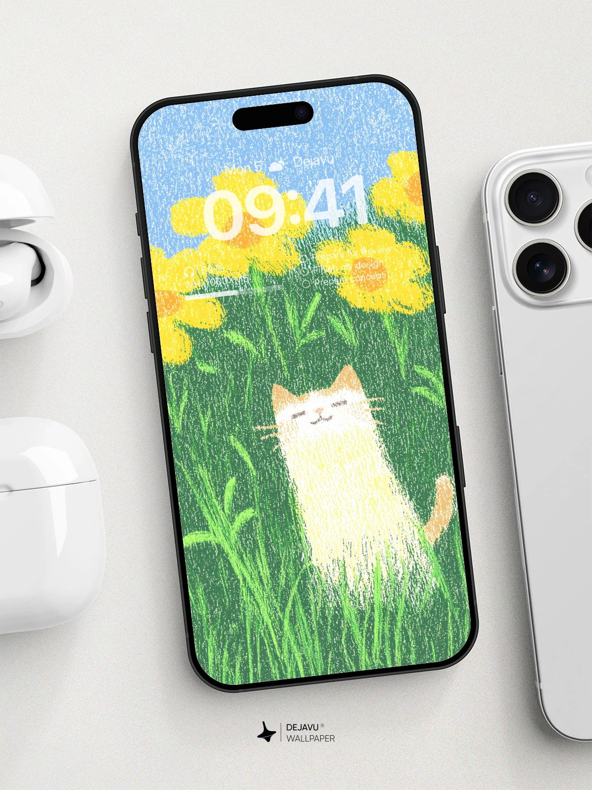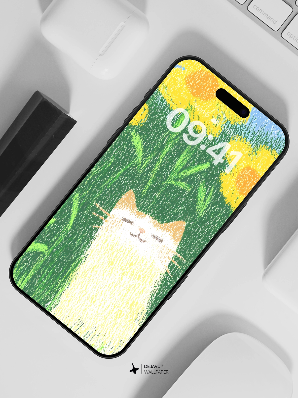 This charming 8K wallpaper features a cute cat nestled in a field of vibrant yellow flowers, offering a minimalist and aesthetic appeal. Perfect for brightening up your iPhone or Android device with its soft, gradient colors and playful theme. Download this delightful wallpaper for a touch of whimsy on your screen.