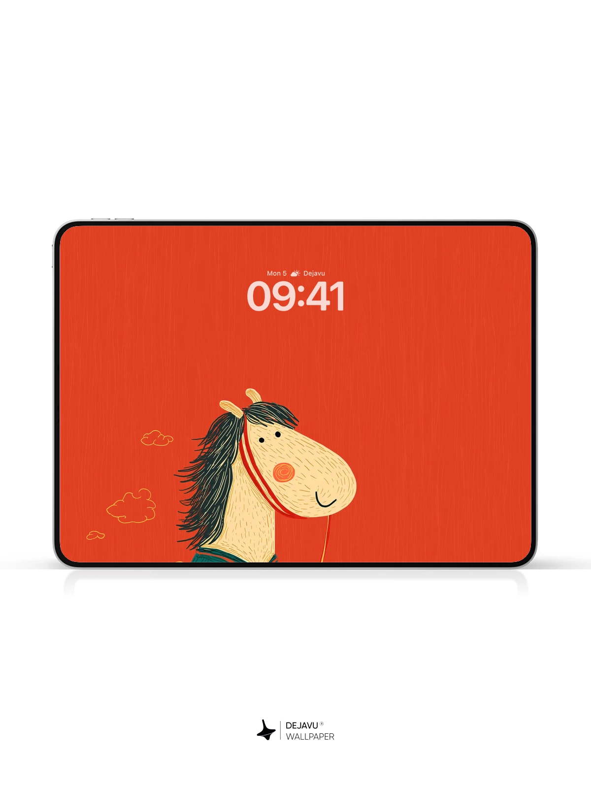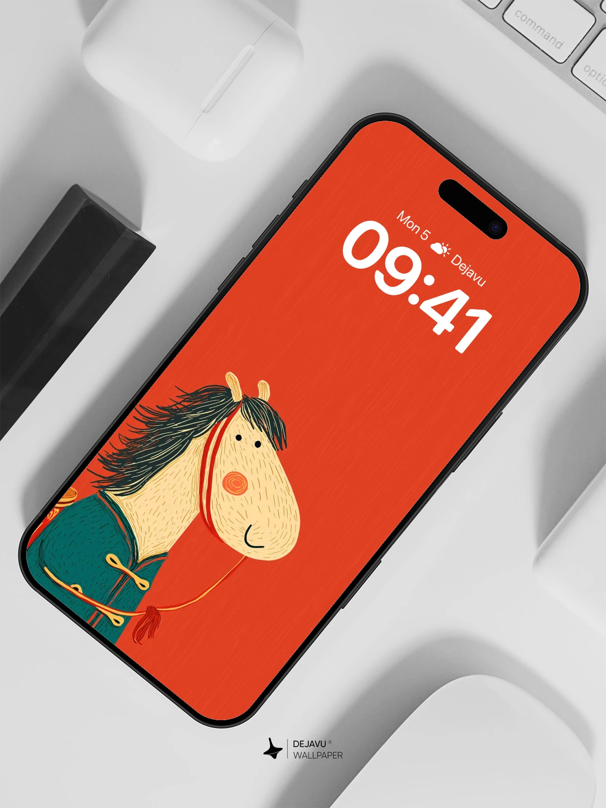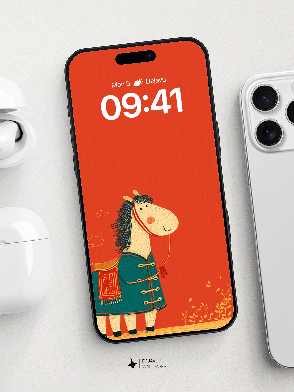 This whimsical illustration features a cheerful horse adorned in a vibrant teal robe with intricate red patterns, evoking traditional Chinese aesthetics. Set against a rich red backdrop with delicate golden foliage, the scene radiates festive warmth and cultural charm. The cartoon style is both playful and elegant, making it ideal for mobile wallpapers on iPhone, Android, or tablets. A delightful fusion of folklore and modern artistry, this 8K wallpaper brings joy and cultural flair to your device.