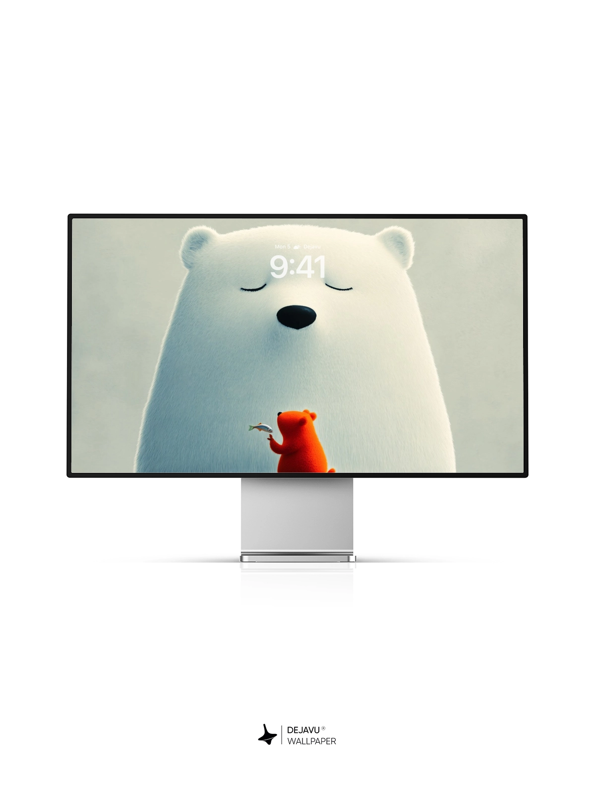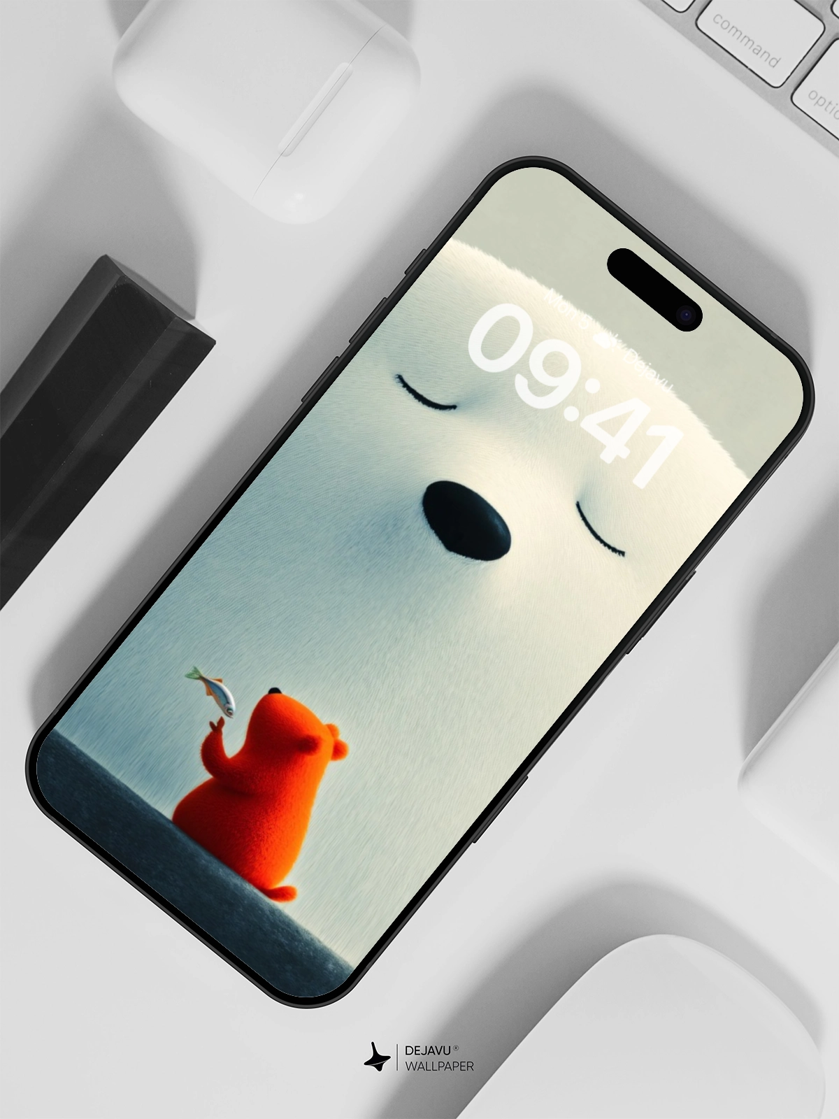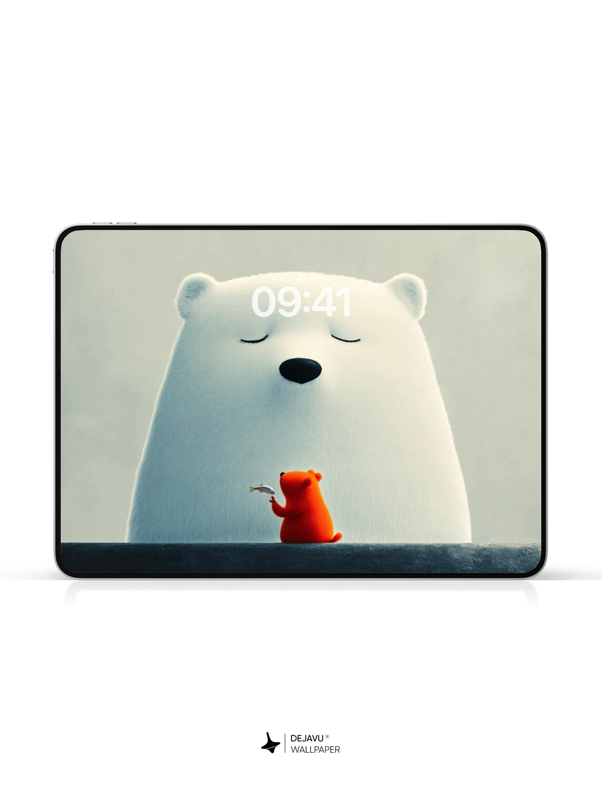 This adorable 8K wallpaper showcases a heartwarming scene of a small orange bear presenting a fish to a much larger white bear. The minimalist design and soft color palette create a soothing aesthetic, ideal for both iPhone and Android screens. This image evokes feelings of friendship and warmth, making it a delightful addition to any device.