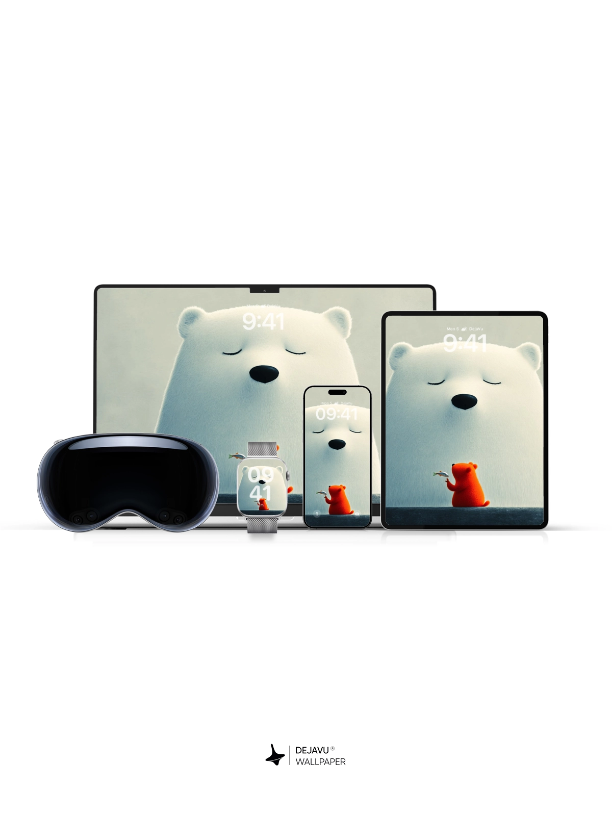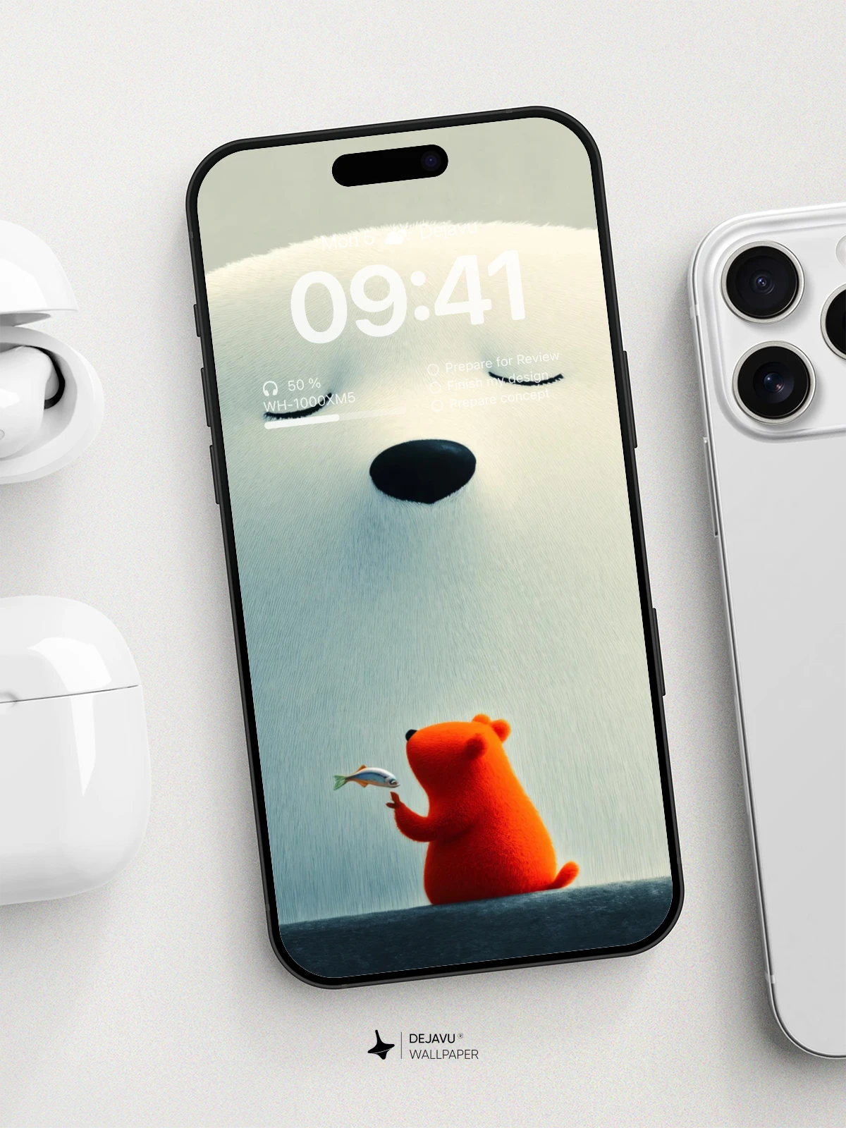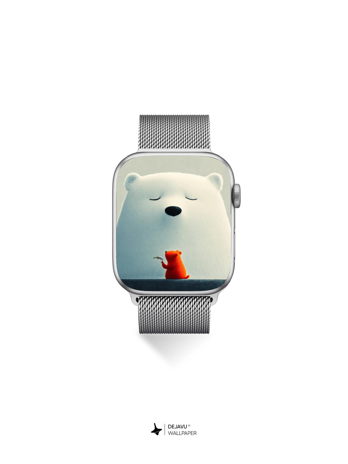 This adorable 8K wallpaper showcases a heartwarming scene of a small orange bear presenting a fish to a much larger white bear. The minimalist design and soft color palette create a soothing aesthetic, ideal for both iPhone and Android screens. This image evokes feelings of friendship and warmth, making it a delightful addition to any device.