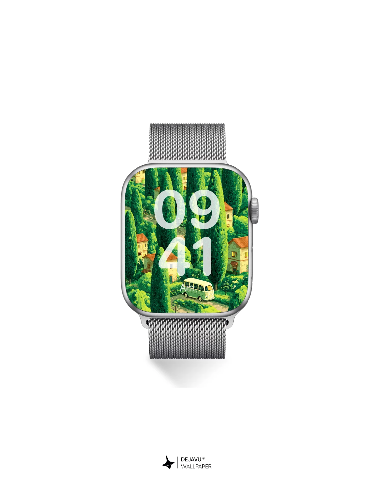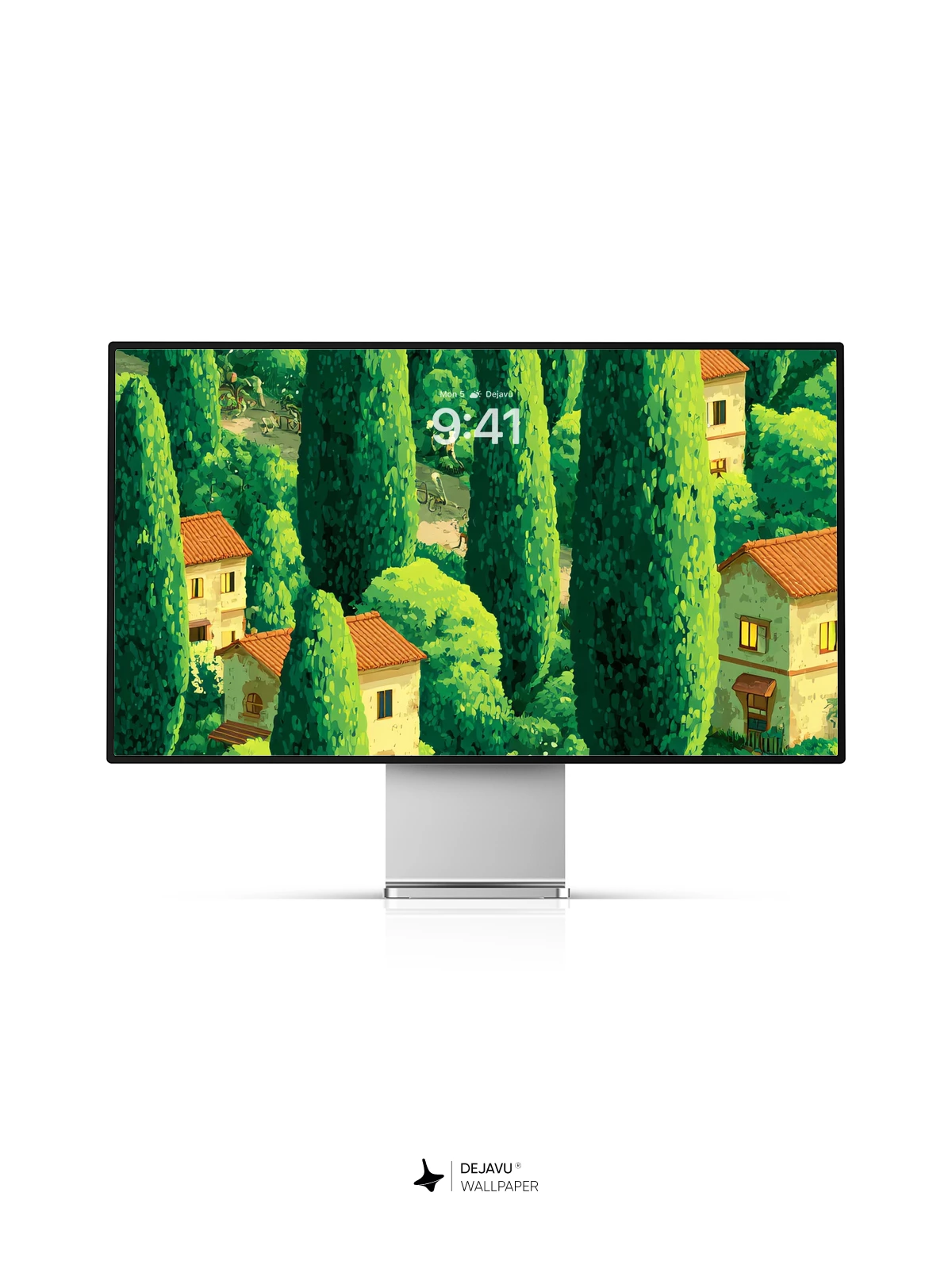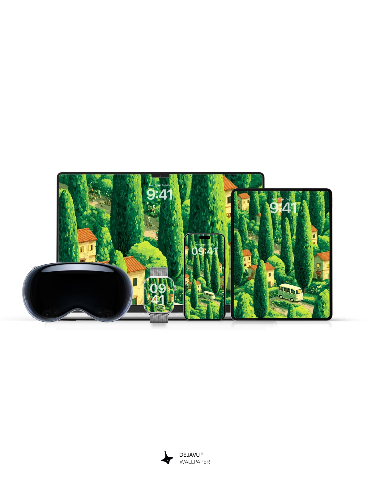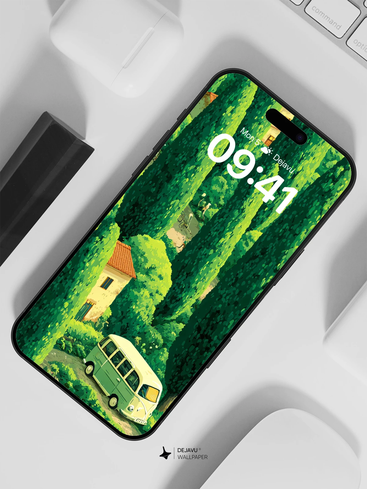This enchanting 8K wallpaper captures a whimsical Mediterranean village hidden within a dense forest of tall, slender cypress trees, evoking a sense of timeless tranquility. A retro-style van glides along a sun-dappled path, adding charm and narrative to the scene. The vibrant greens and warm terracotta rooftops create a dreamy, almost storybook atmosphere—ideal for iPhone, Android, or tablet screens seeking natural beauty with artistic flair. Inspired by the delicate balance of landscape and life, this design brings peaceful serenity to your mobile device.