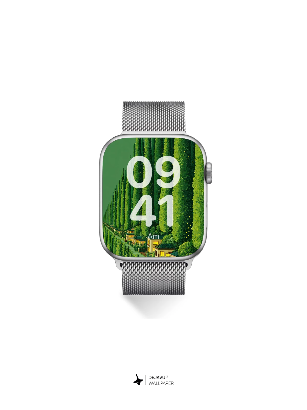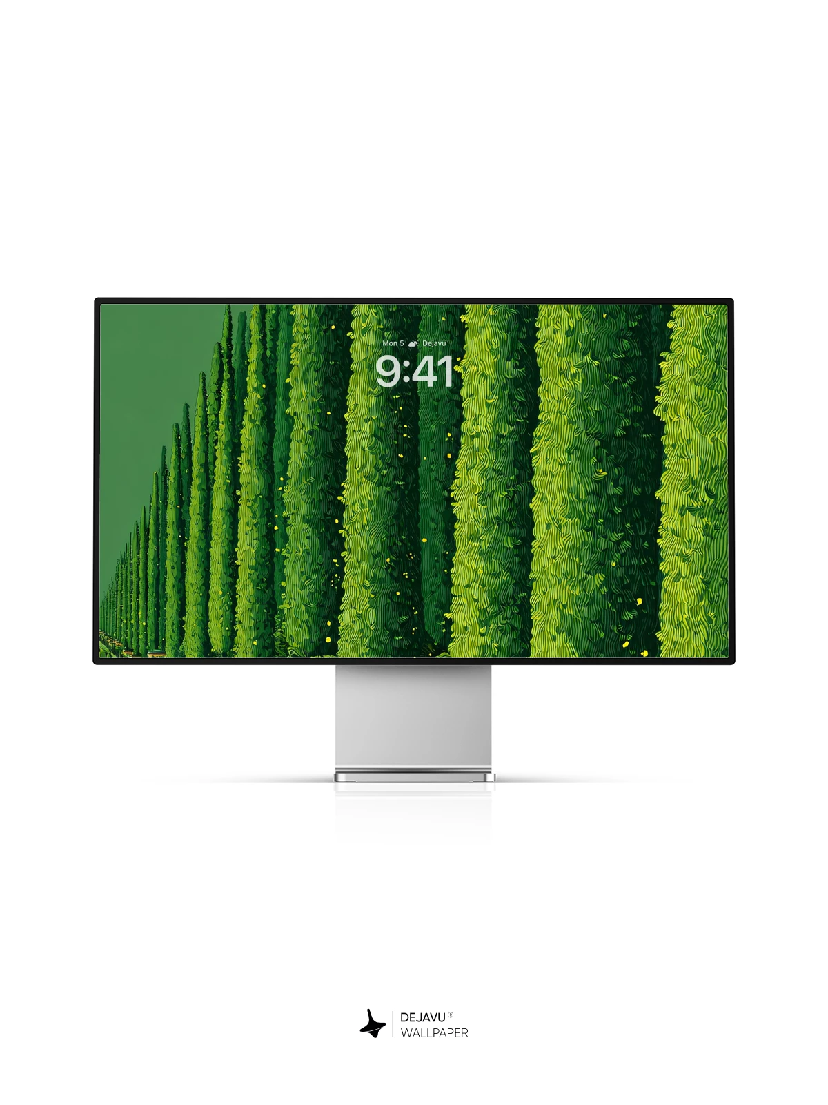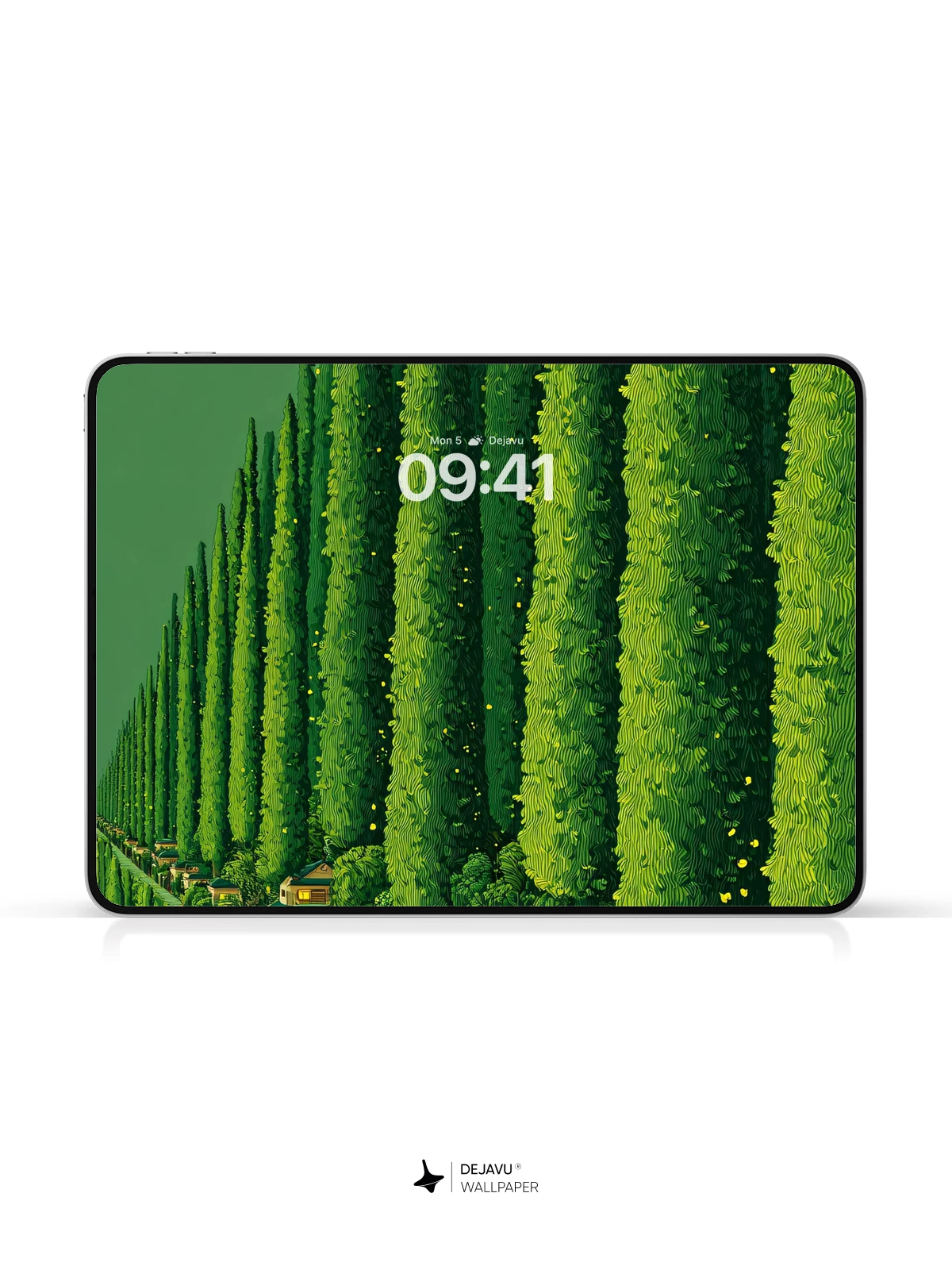 This enchanting 8K wallpaper presents a dreamlike village winding through an endless avenue of towering cypress trees, their vibrant green canopies forming a natural corridor. Inspired by the whimsical precision of Studio Ghibli animation, the scene glows with golden windows and a vintage yellow van, evoking warmth and quiet wonder. Ideal for iPhone, Android, or tablet screens, it transforms your device into a portal to a peaceful, storybook landscape where nature and home embrace in harmony.