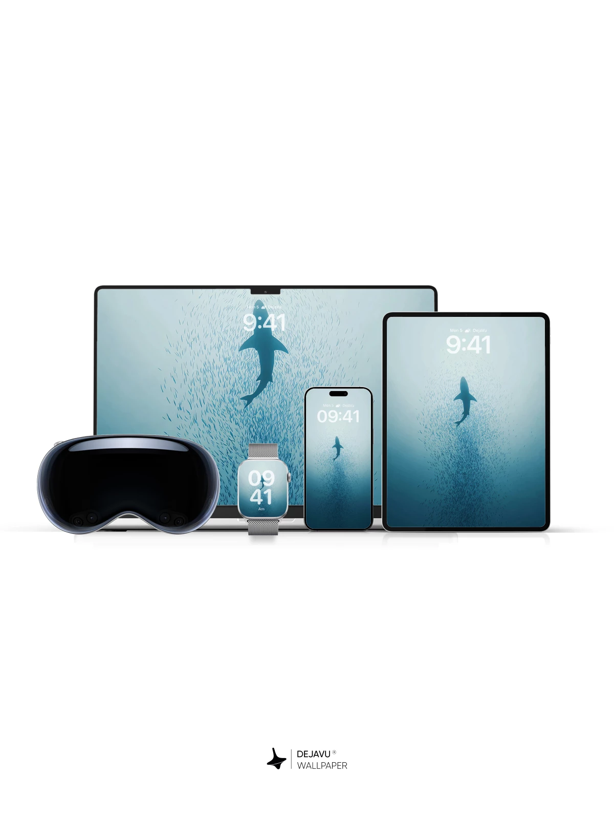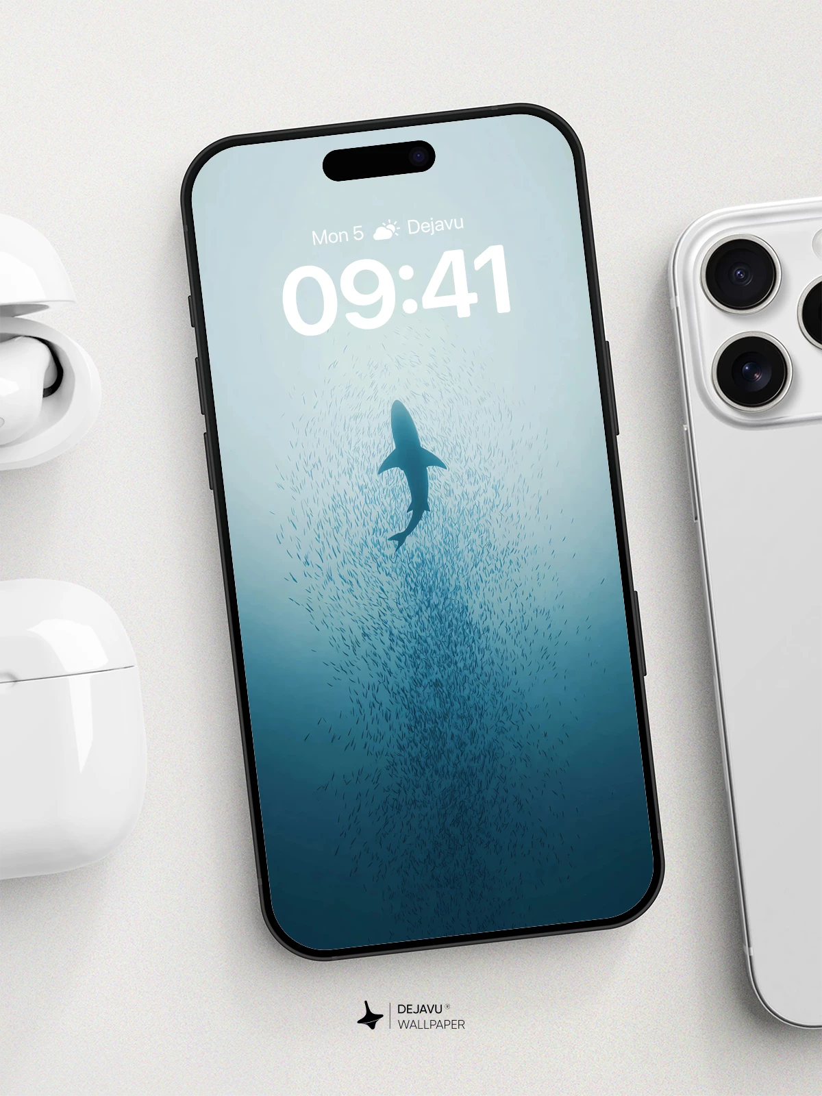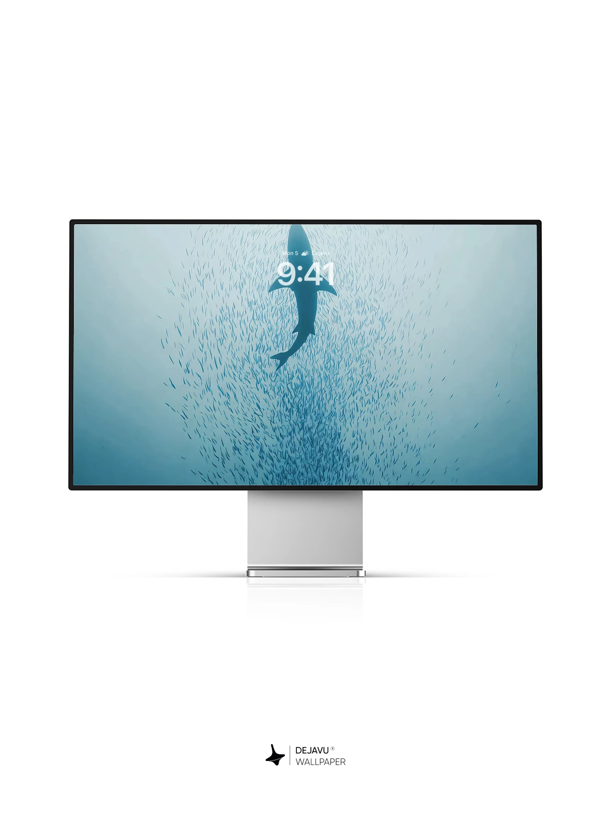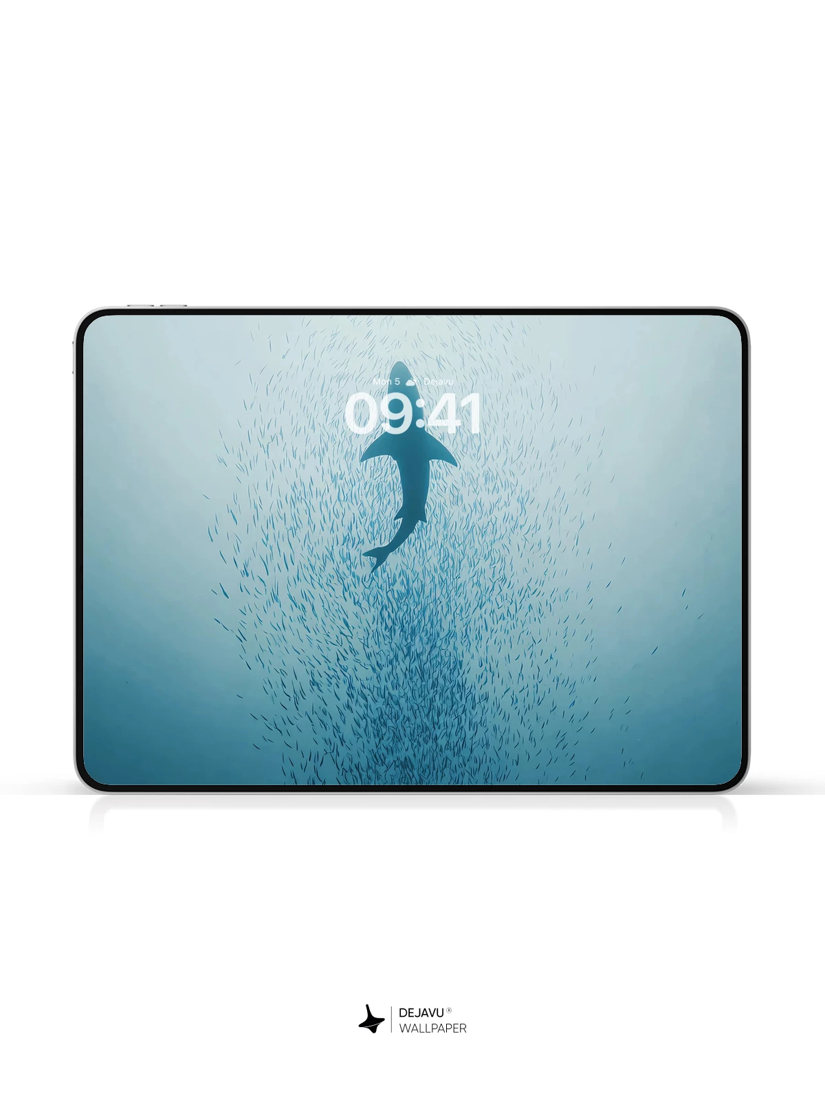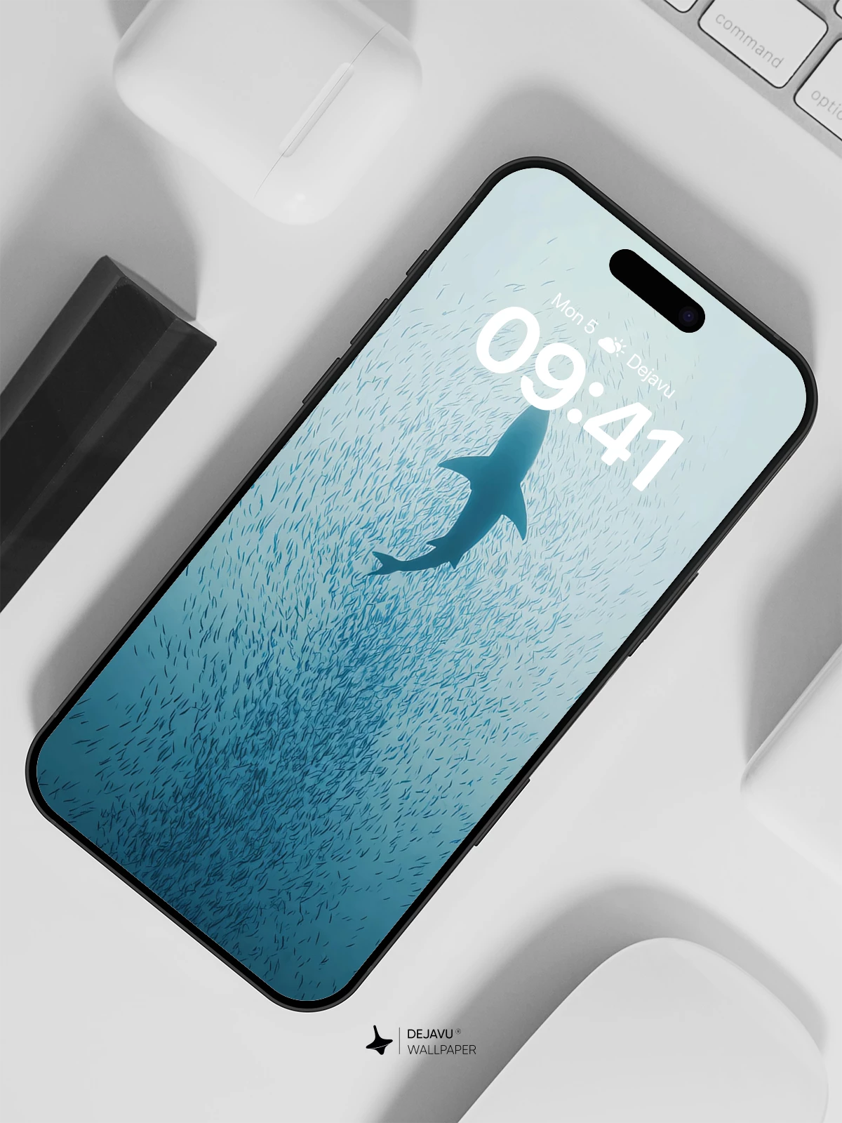 This high-resolution 8K wallpaper captures the serene yet powerful movement of a shark ascending through a swirling school of fish. The minimalist composition and cool blue tones evoke a sense of calm and mystery. Ideal for adding a touch of natural elegance to your iPhone, Android, or tablet screen.