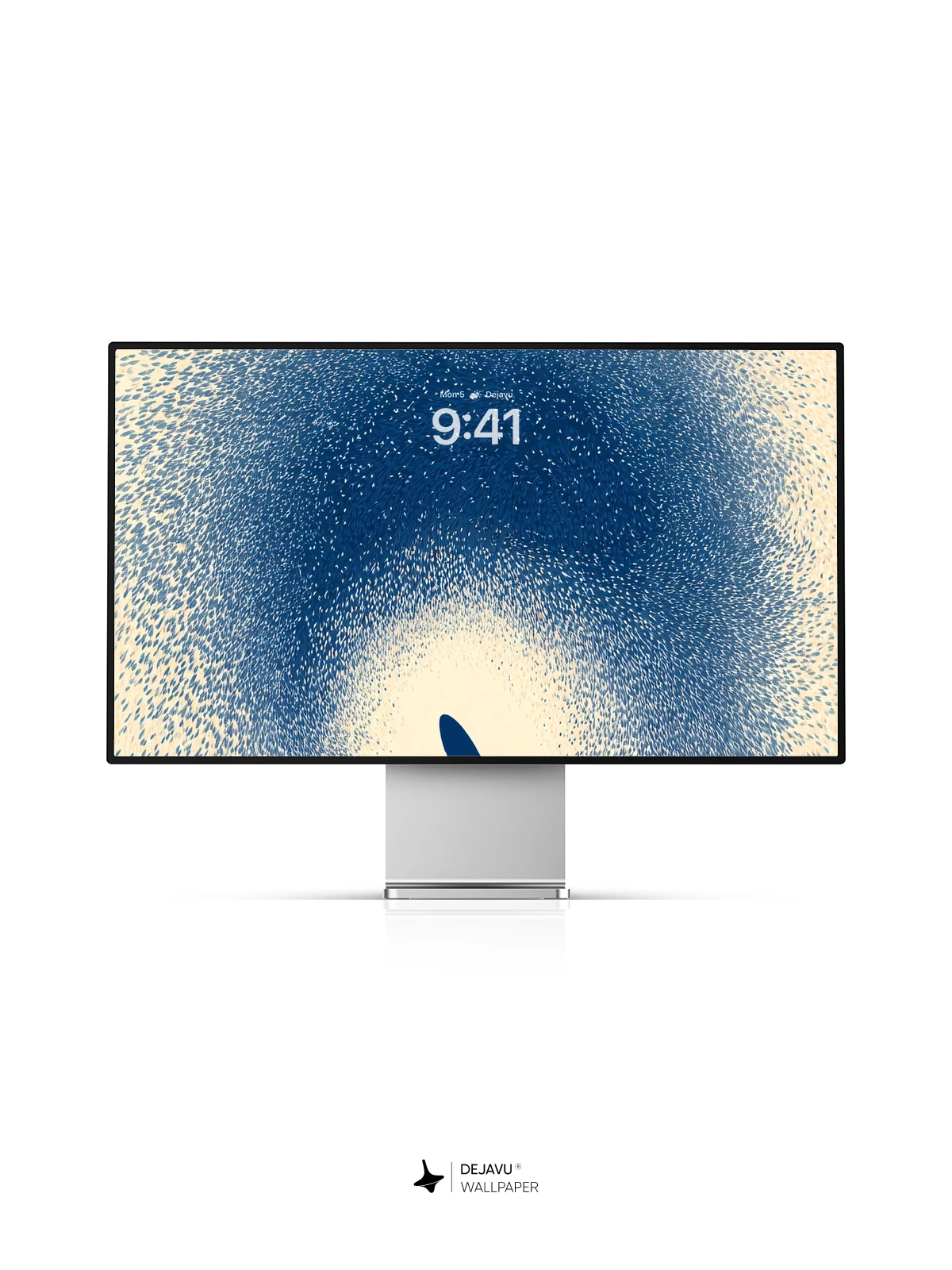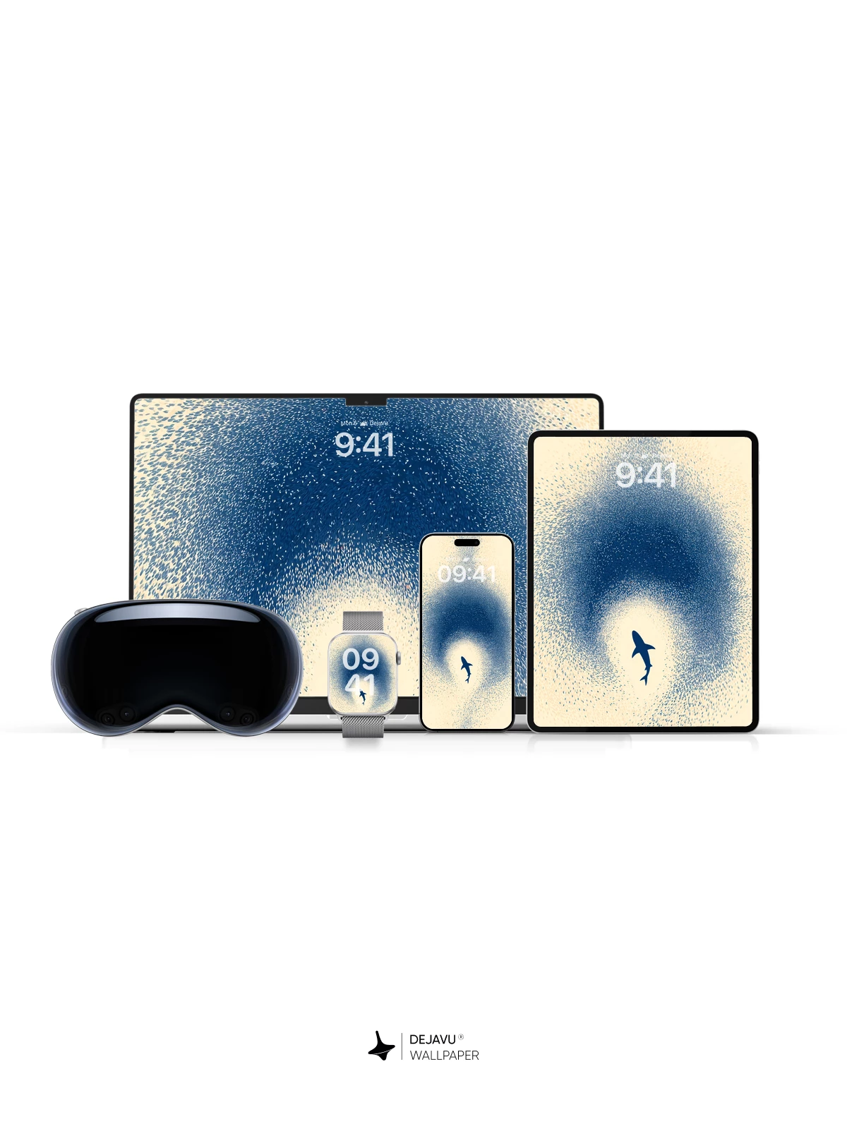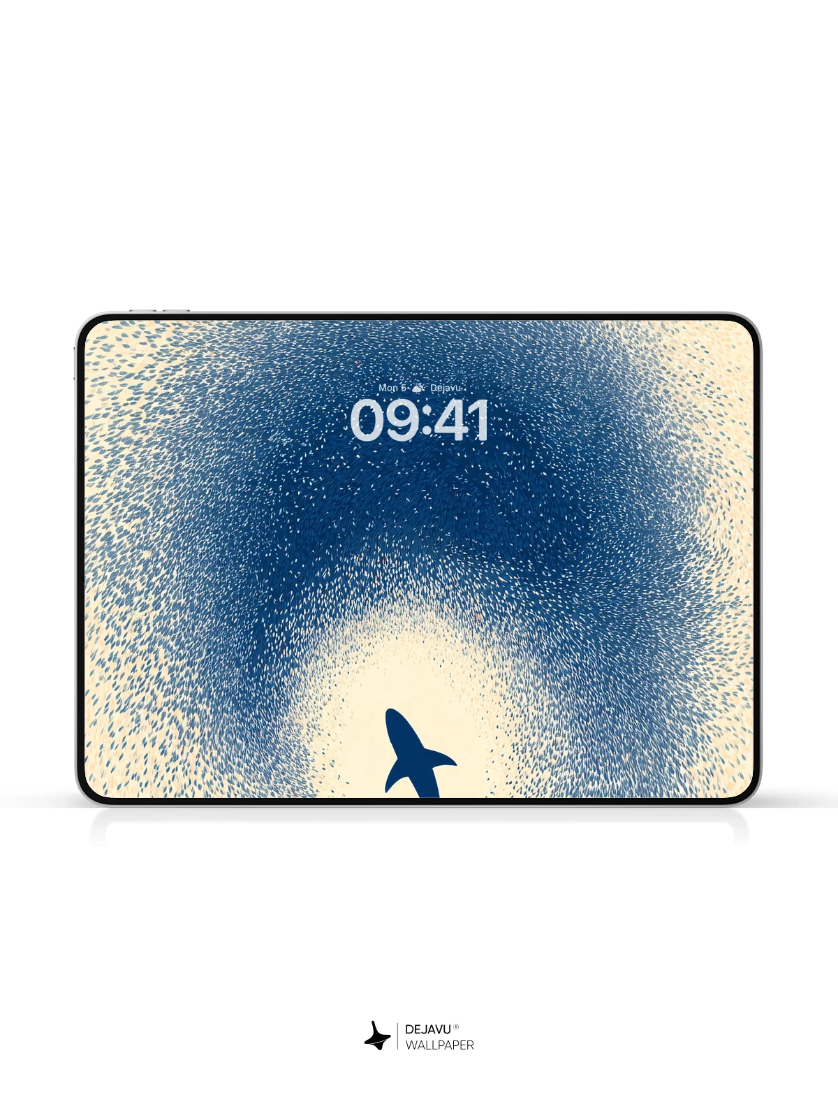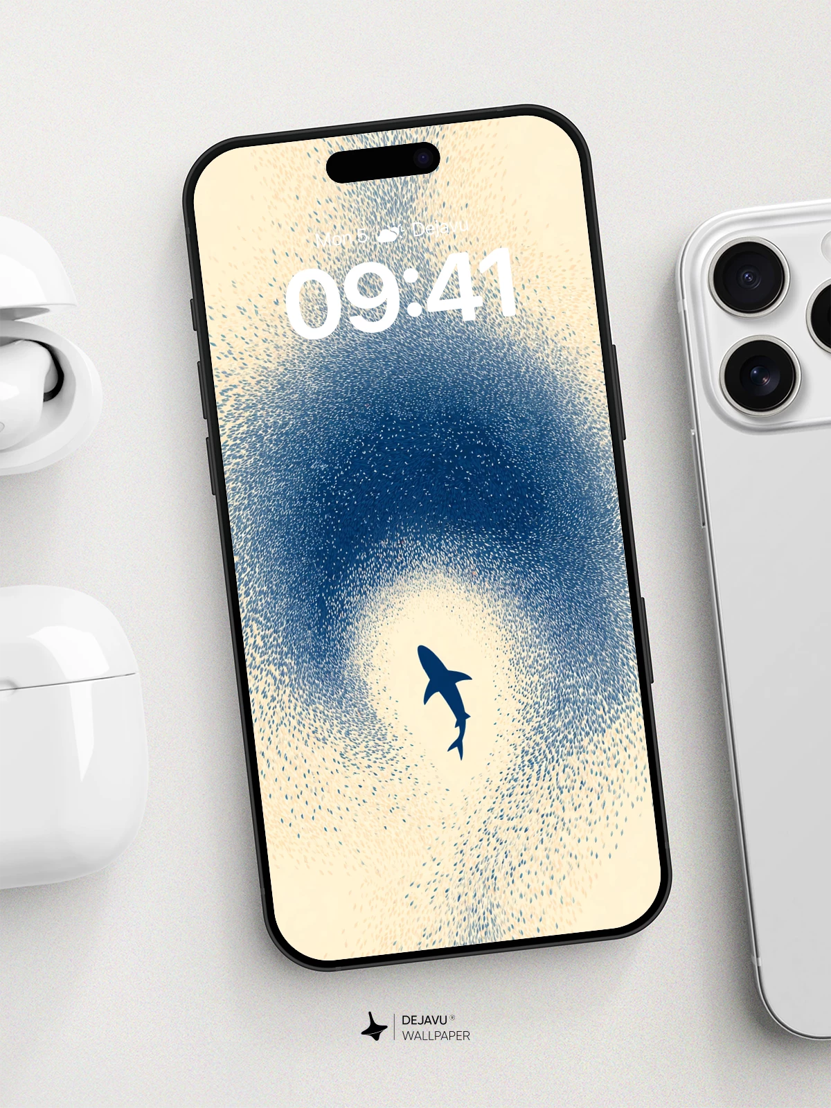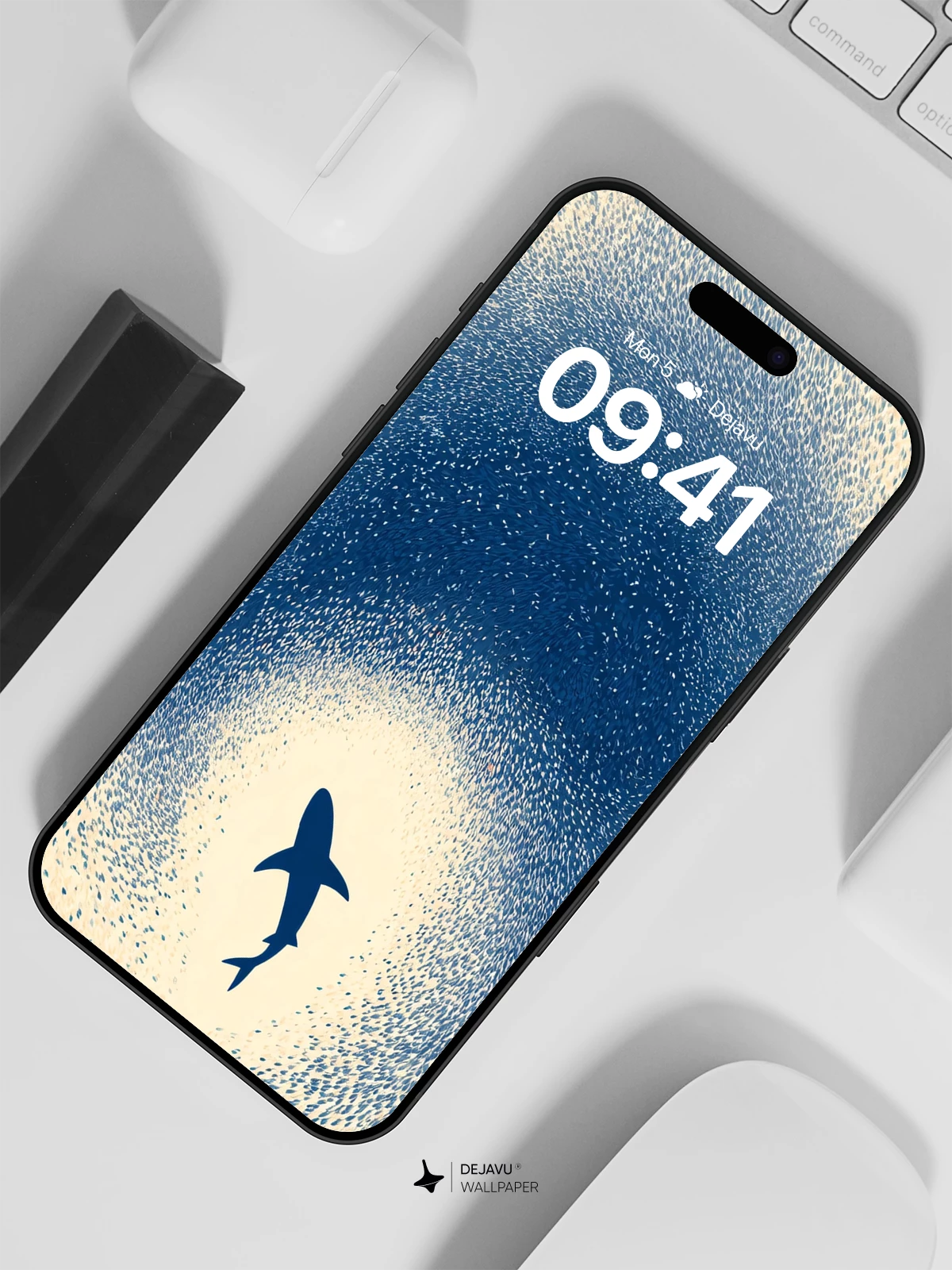 Experience the tranquil yet mysterious depths of the ocean with this 8K wallpaper. Featuring a shark gracefully navigating through a swirling school of fish, it offers a serene and captivating visual experience. Perfect for iPhone, Android, and tablet screens, this design brings the calming essence of the sea to your device.