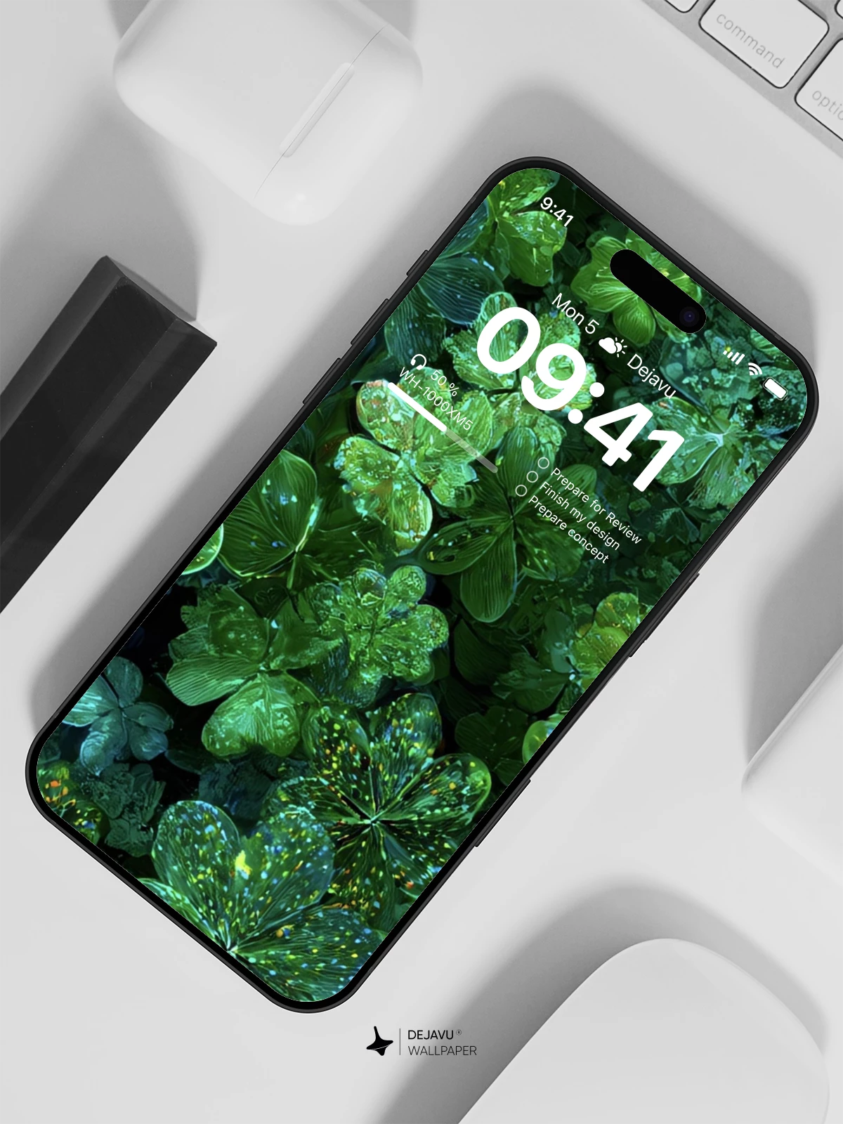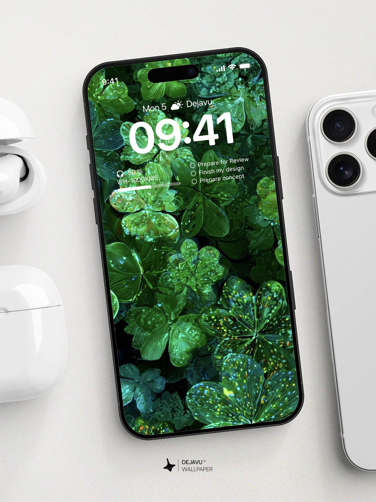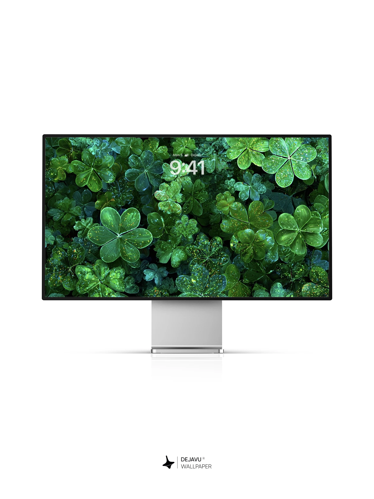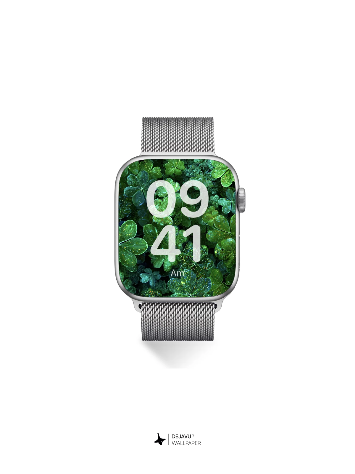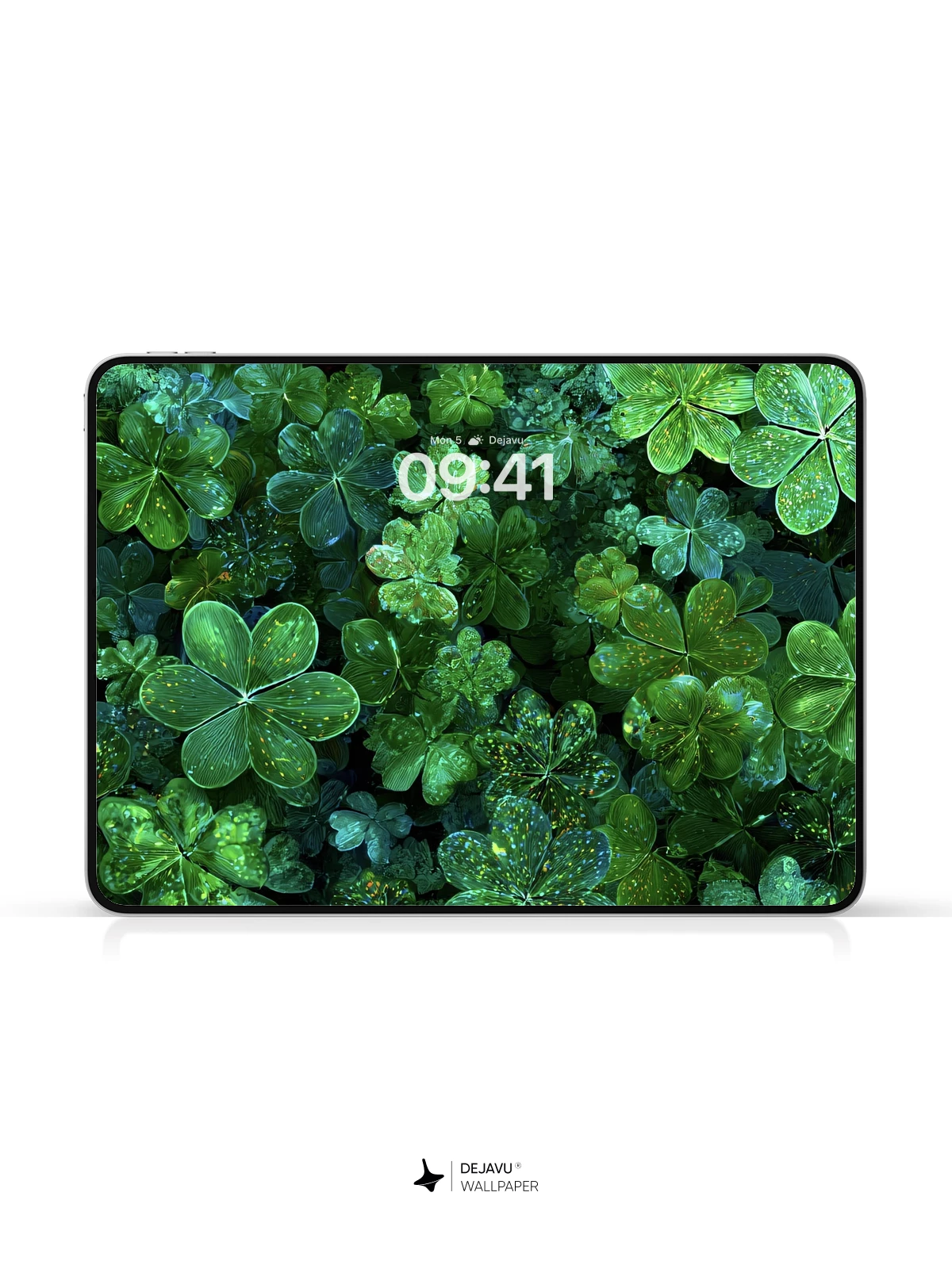 This 8K wallpaper features a dense, close-up view of shamrocks, their deep green surfaces speckled with clear water droplets. The focus on natural texture and the cool, damp atmosphere makes it a serene and grounding choice for any phone or tablet screen.