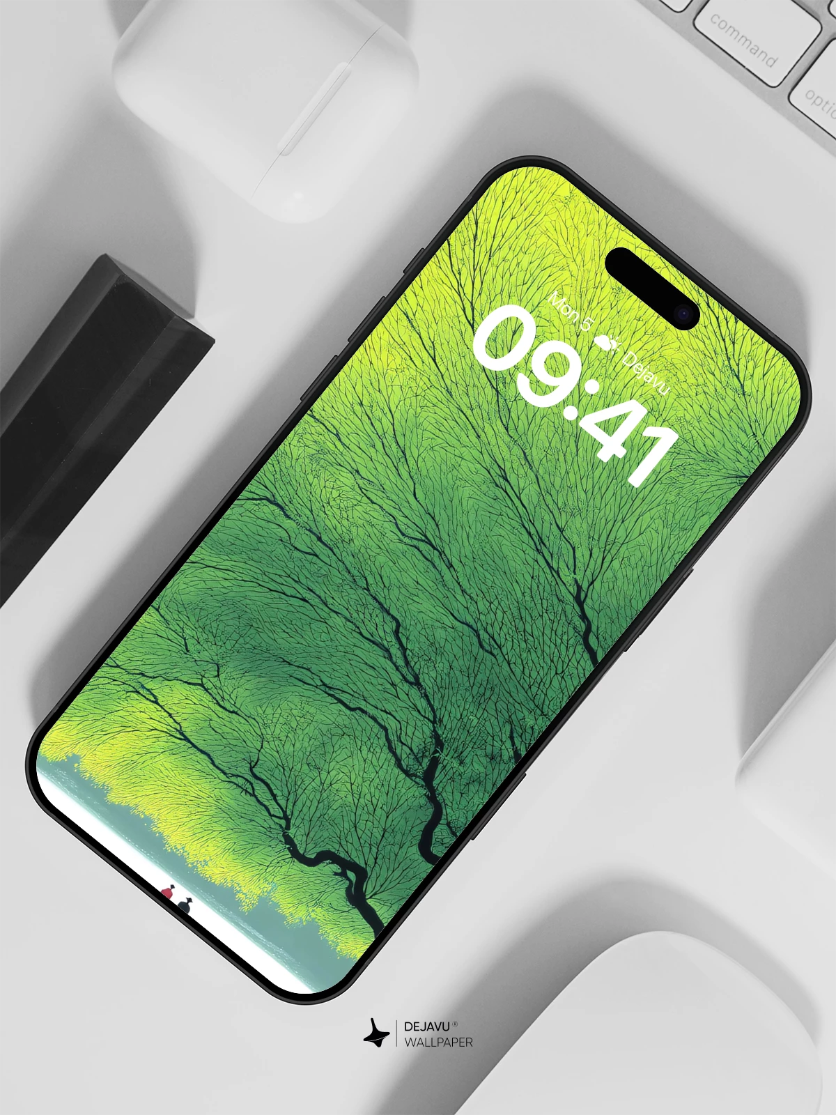 Under a vast, luminous canopy of green branches that seem to breathe life into the scene, two small figures find solace by a tranquil lake. The image evokes a sense of peaceful solitude and timeless connection, rendered in a dreamlike style reminiscent of Studio Ghibli’s poetic landscapes. With its rich gradients and delicate silhouettes, this 8K wallpaper is ideal for iPhone, Android, and tablets—bringing a touch of serene magic to your mobile device.