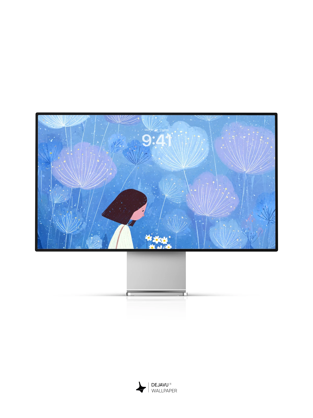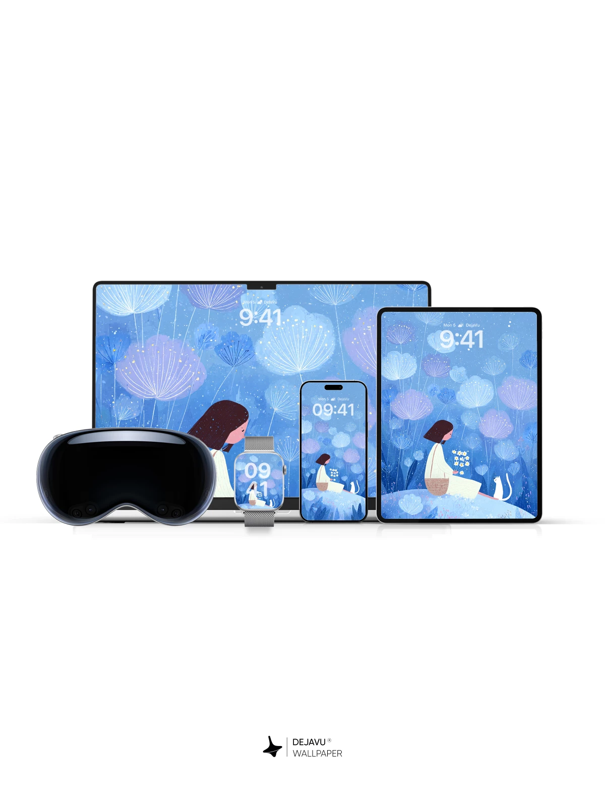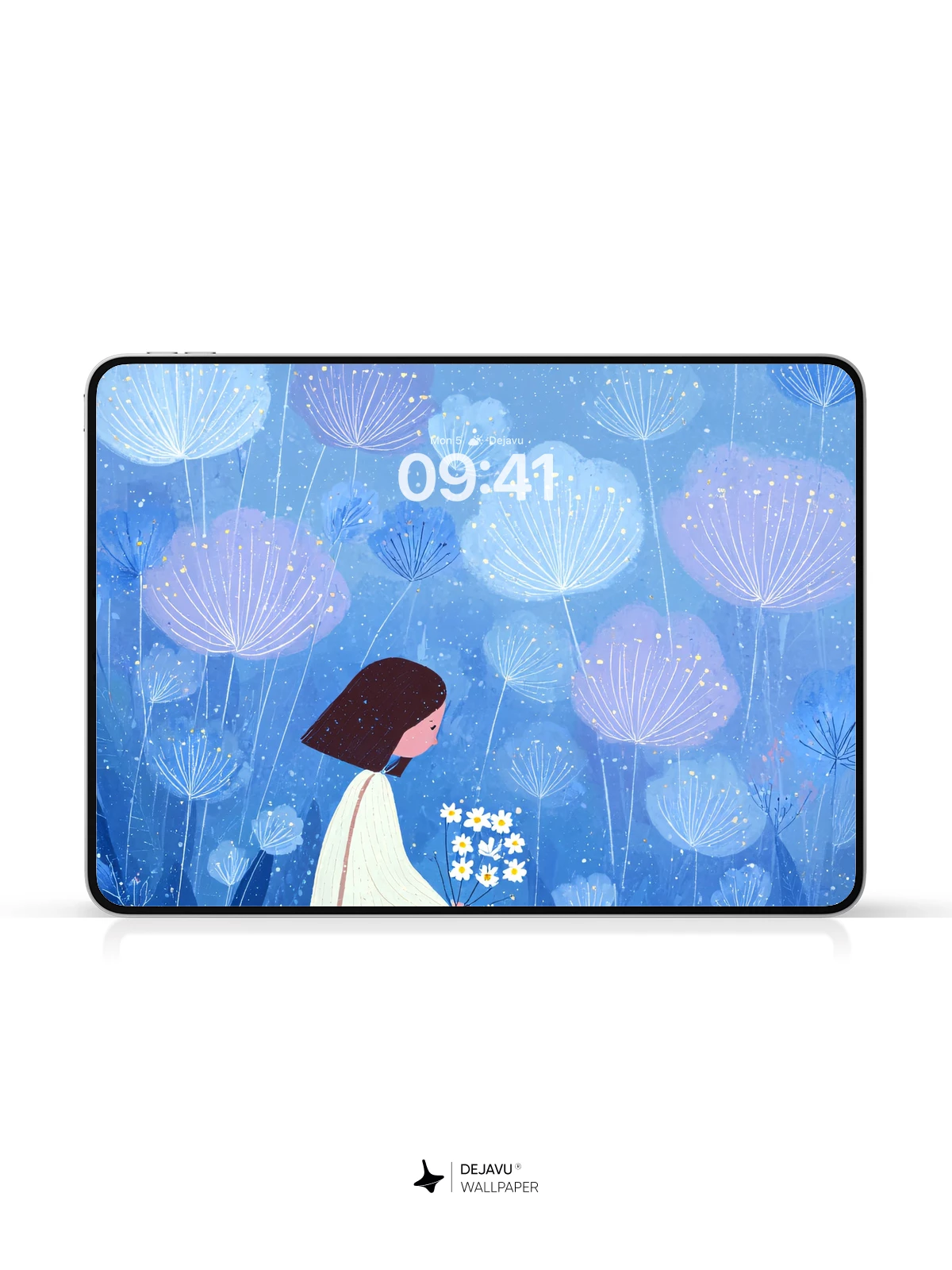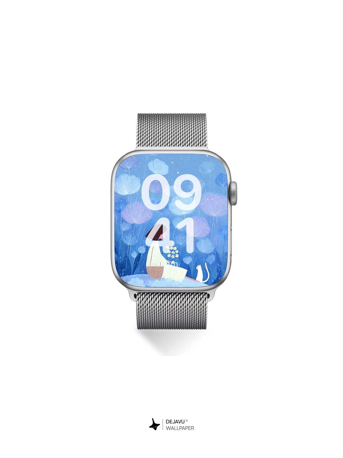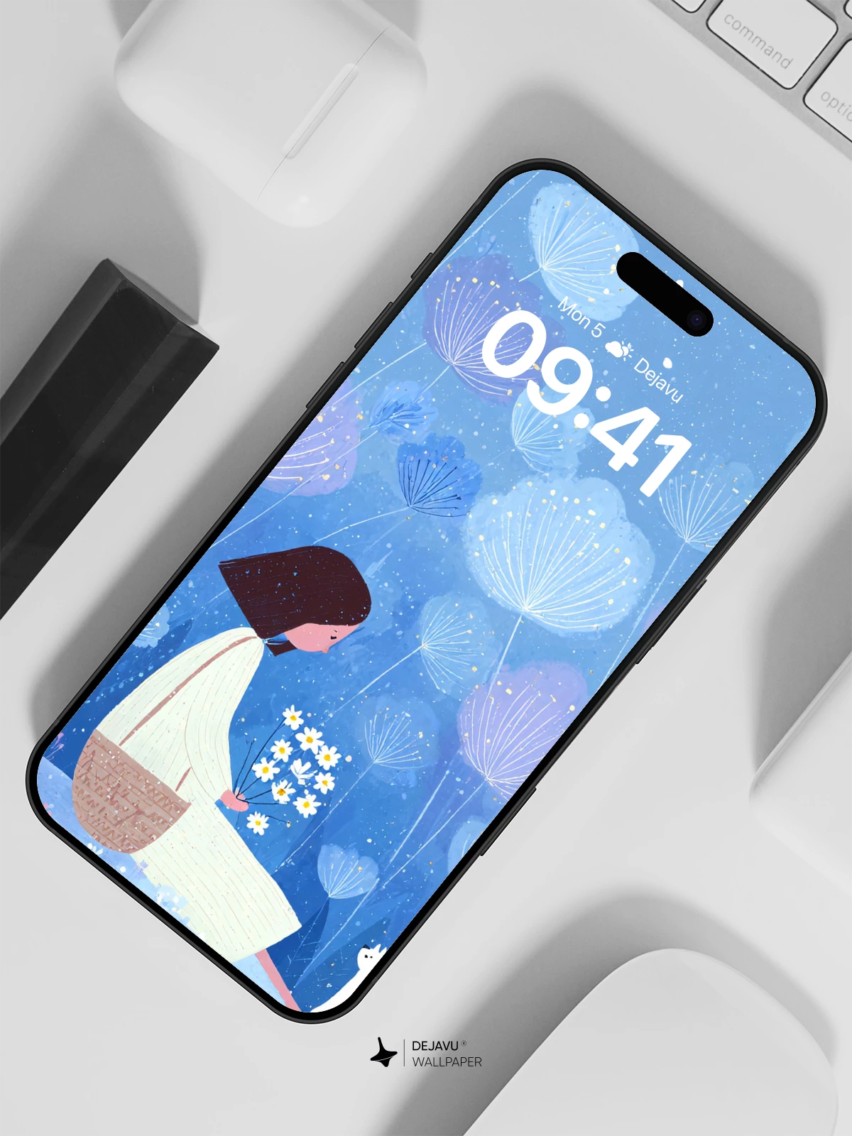 This enchanting 8K wallpaper captures a dreamlike moment where a young woman sits on a hillside with a white cat, surrounded by luminous dandelion-like flowers floating in a soft blue twilight. Inspired by delicate illustrative artistry reminiscent of modern fairy tales, the scene evokes peace, solitude, and gentle wonder. The ethereal glow and minimalist elegance make it ideal for iPhone, Android, and tablet screens, transforming your device into a portal to a quiet, magical world.”.
