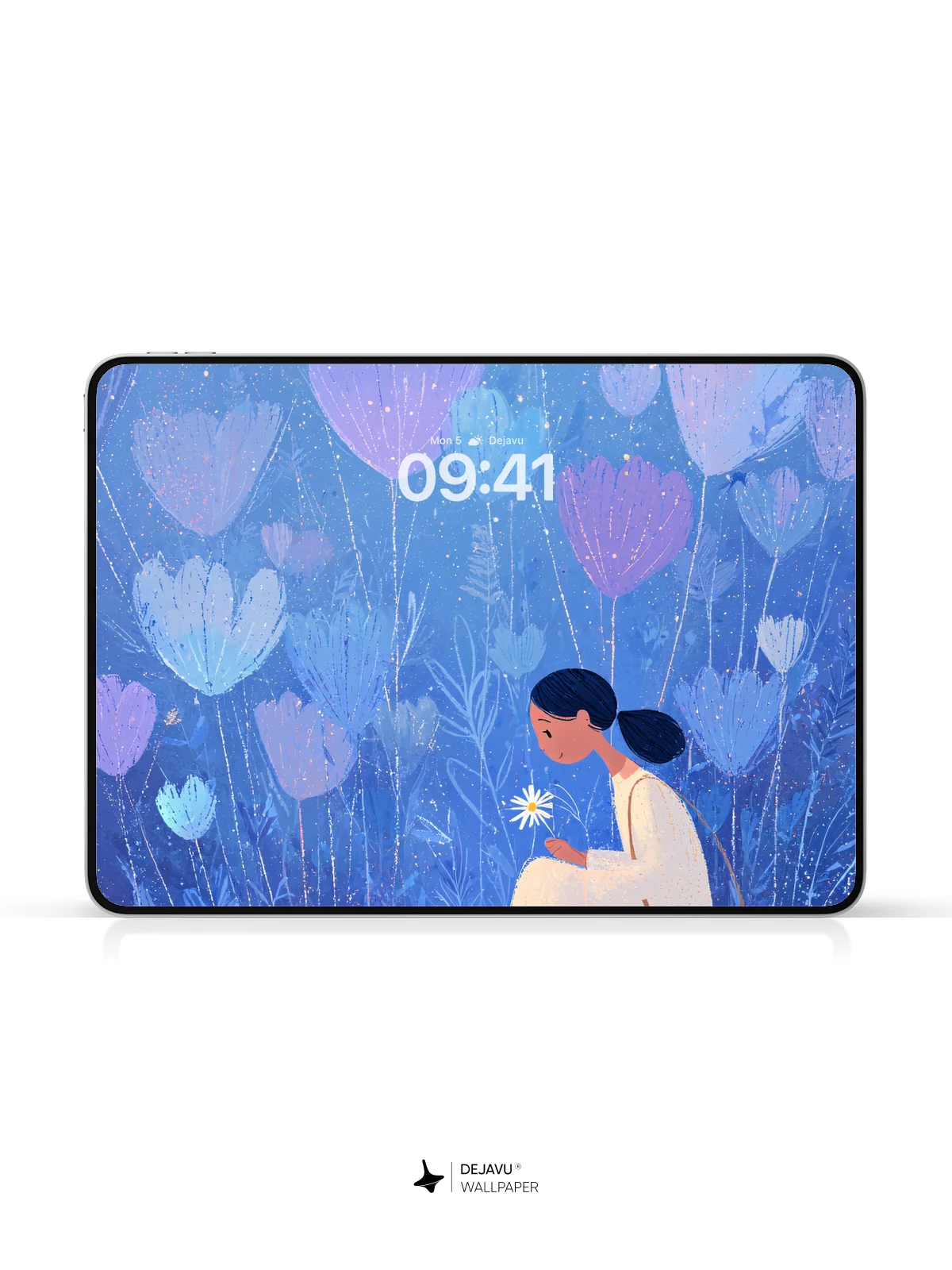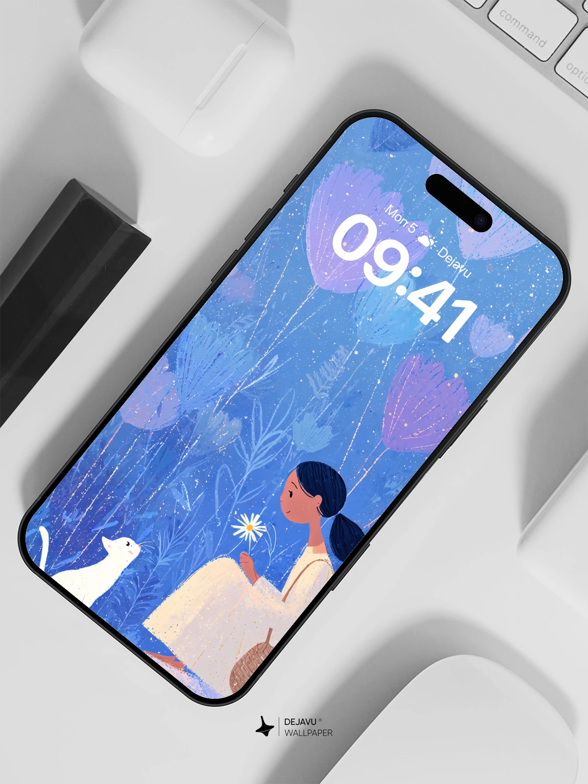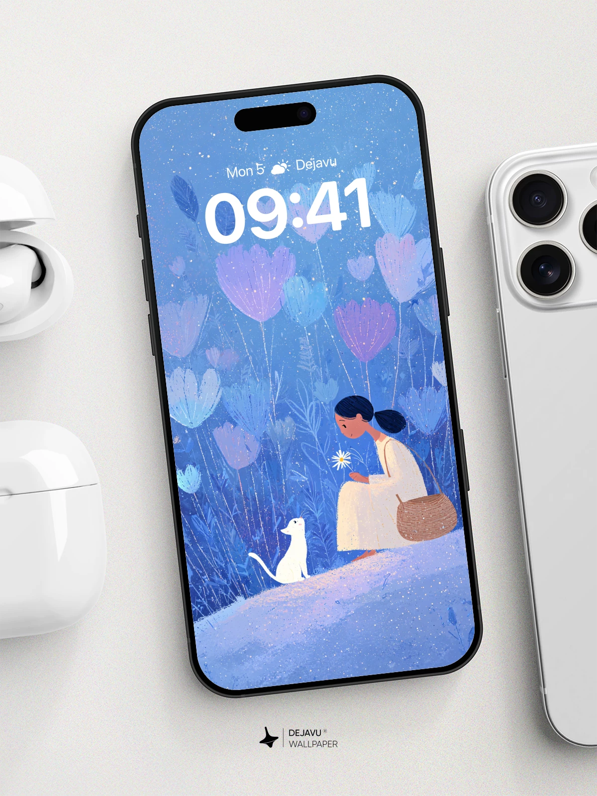 This enchanting illustration captures a quiet moment of connection between a young woman and her white cat beneath a canopy of luminous, oversized flowers in a dreamlike nocturnal landscape. Rendered in a delicate, painterly style reminiscent of modern whimsical art, the scene glows with subtle sparkles and cool tones, evoking tranquility and wonder. The composition, rich in symbolism and gentle emotion, feels like a whispered secret from a fairy tale. Ideal as an 8K wallpaper for iPhone, Android, or tablets, it brings a soothing, poetic atmosphere to any screen.