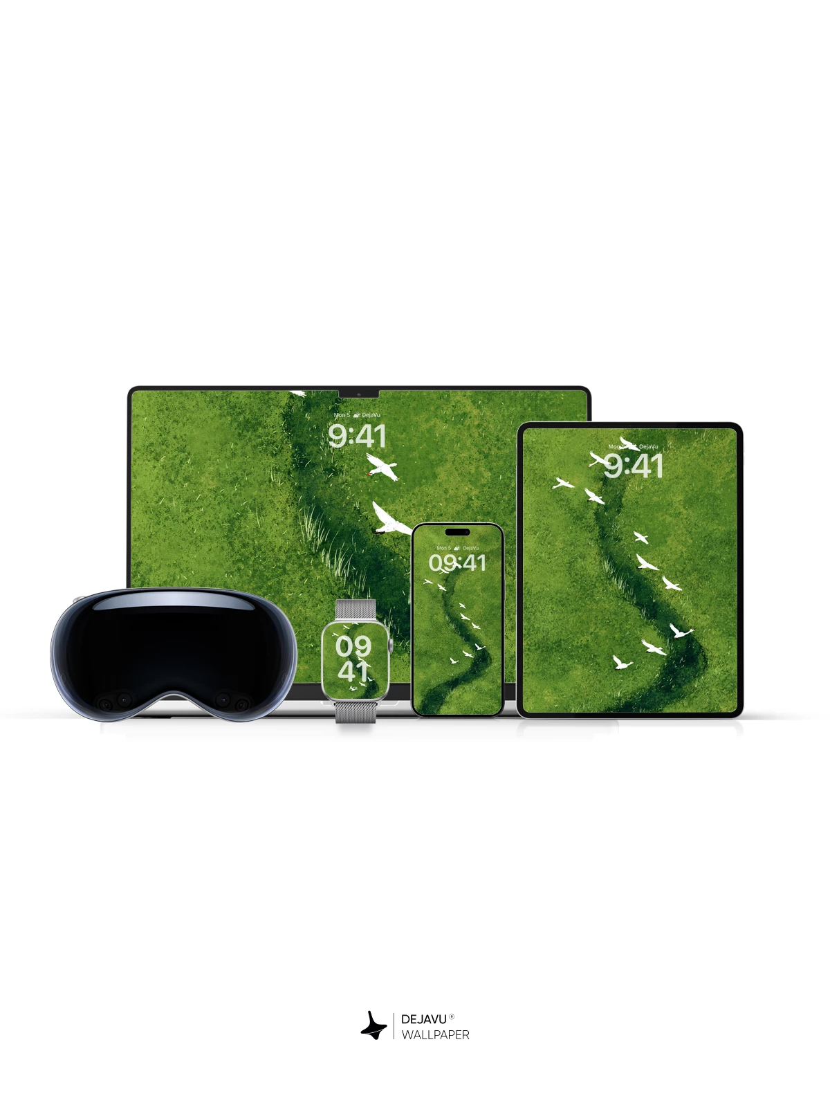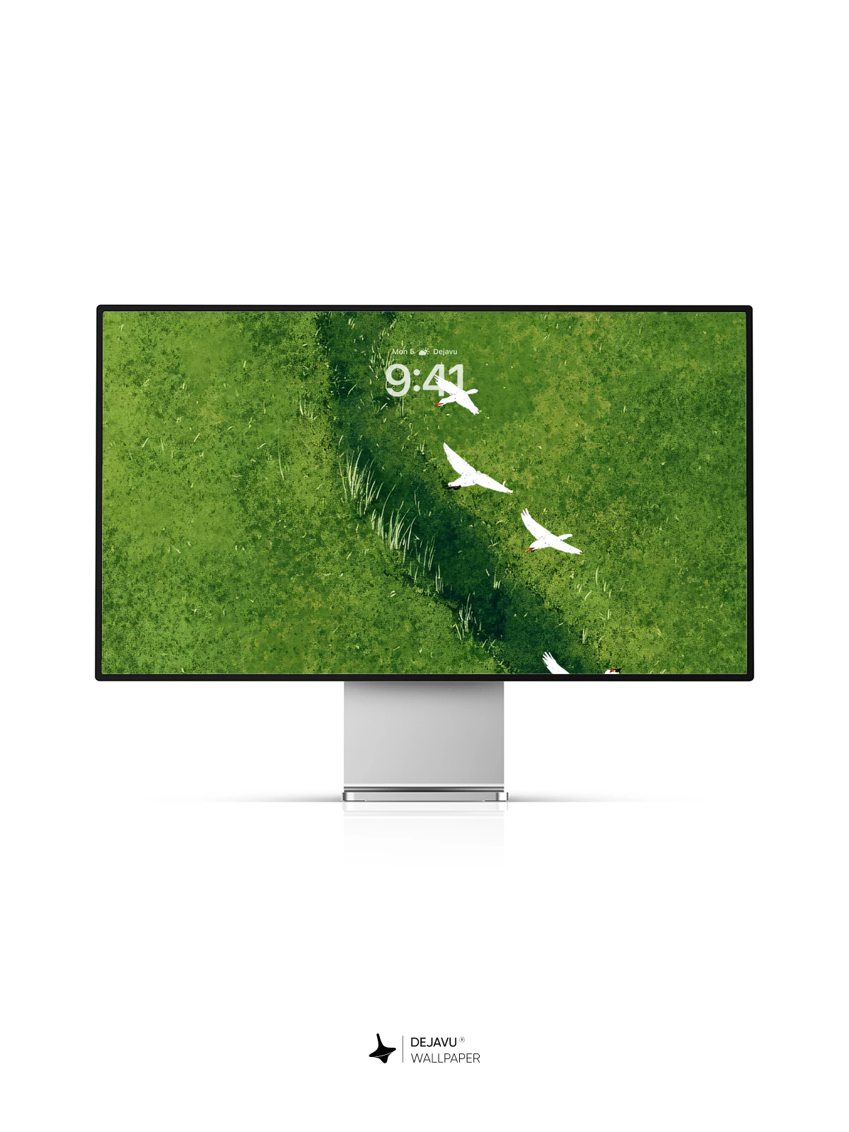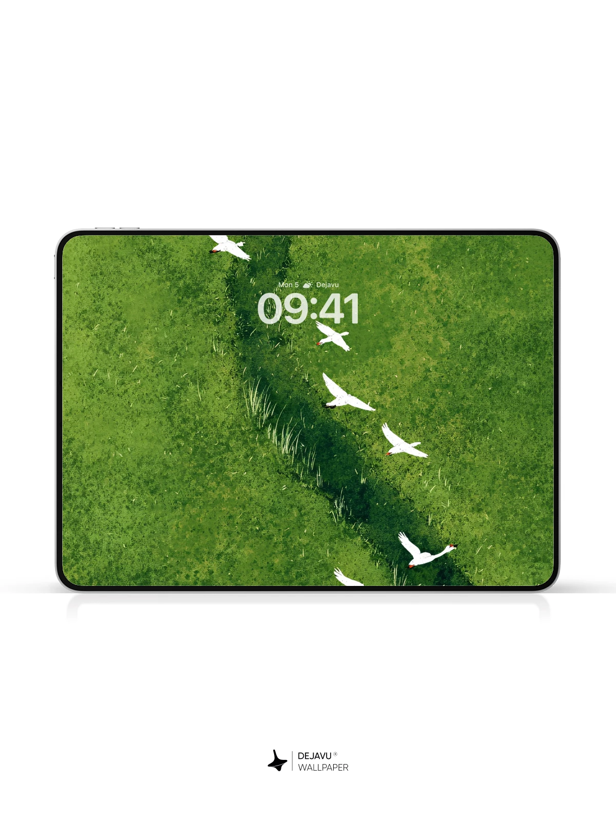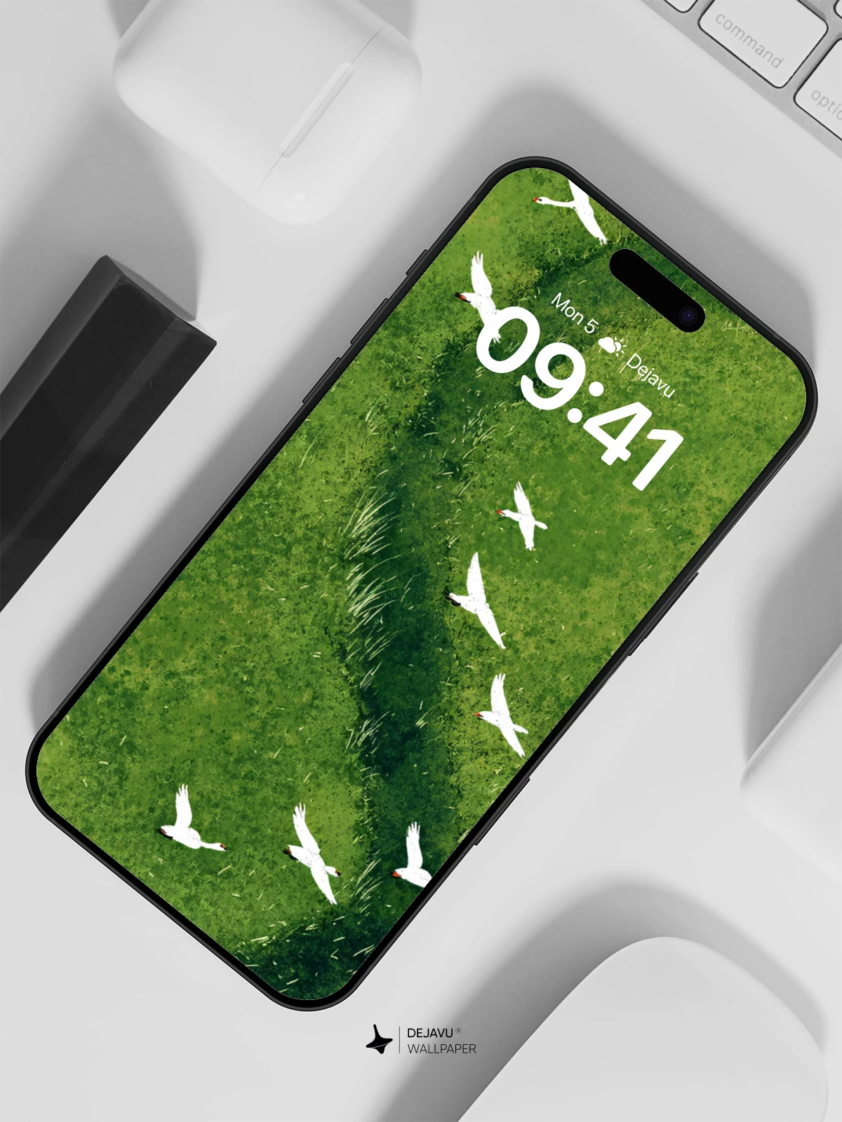 This stunning 8K wallpaper captures the tranquil beauty of nature from above, featuring a flock of white birds gliding in perfect harmony over a vibrant green landscape. The birds trace an elegant arc along a dark, meandering stream, creating a sense of movement and balance. Ideal for iPhone, Android, and tablets, this image evokes peace and freedom, offering a calming visual escape. Its crisp detail and natural palette make it a timeless choice for any device.