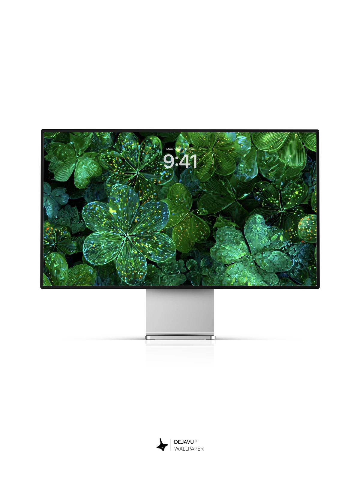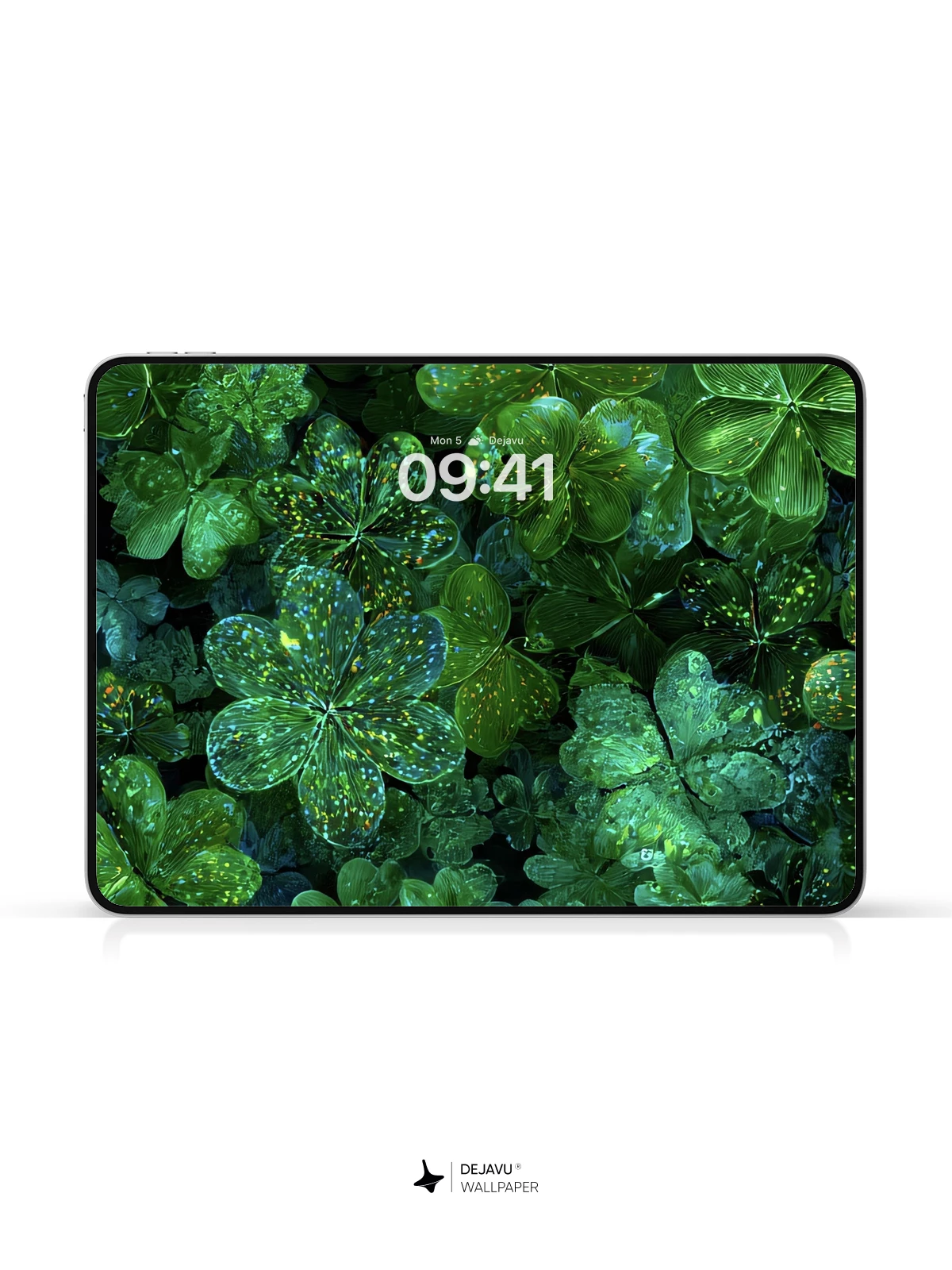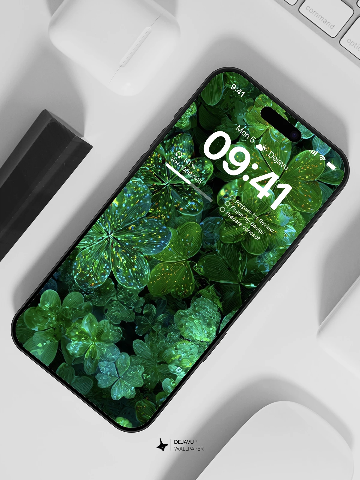 This 8K wallpaper features a tight cluster of four-leaf clovers with a high-sheen surface that reflects light like wet enamel. The deep green palette and sharp focus on the leaf veins create a tactile, immersive look for your phone or tablet screen.