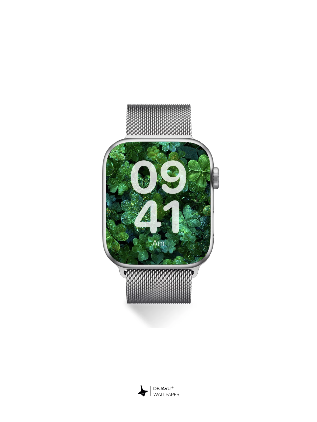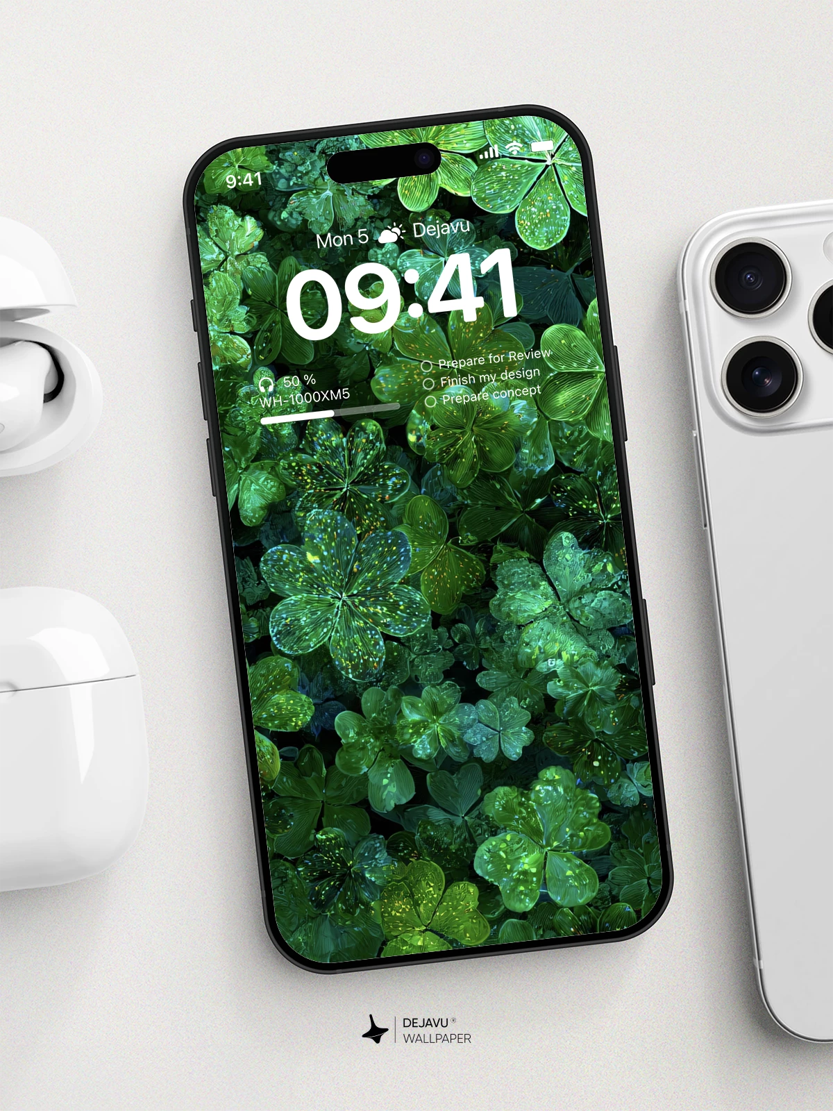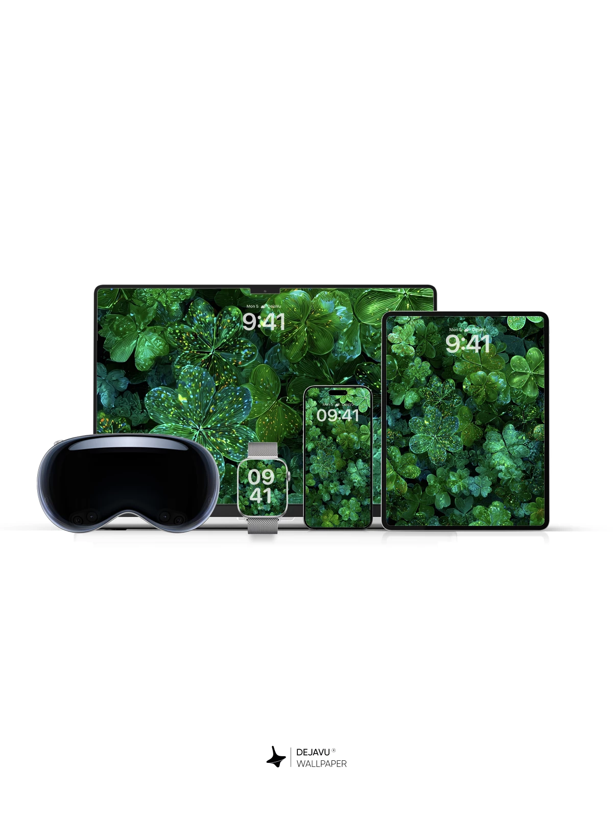 This 8K wallpaper features a tight cluster of four-leaf clovers with a high-sheen surface that reflects light like wet enamel. The deep green palette and sharp focus on the leaf veins create a tactile, immersive look for your phone or tablet screen.