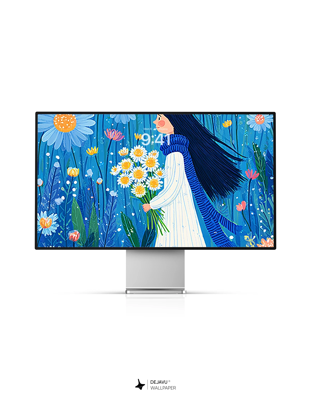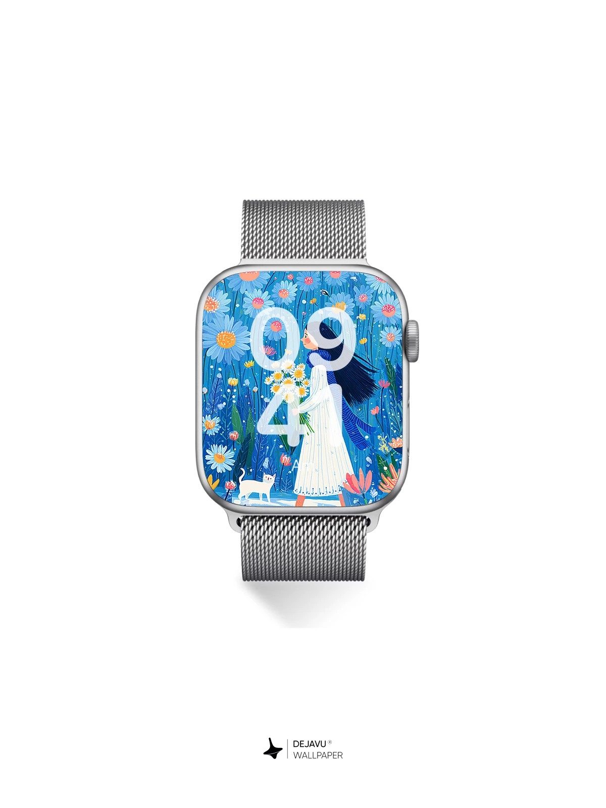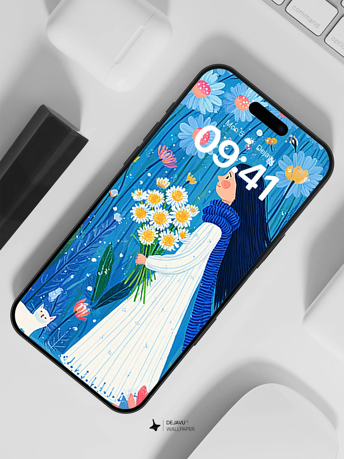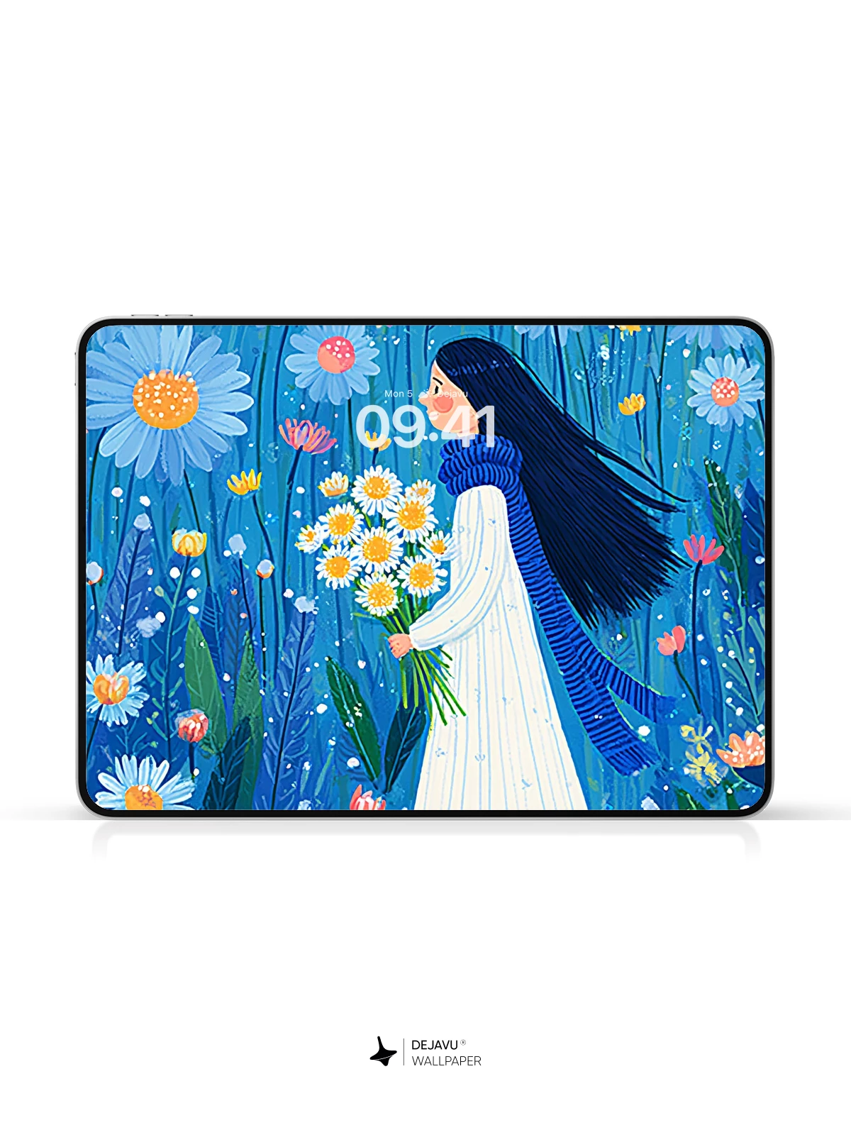 Step into a magical world where nature sings in hues of blue and gold. This enchanting 8K wallpaper features a serene girl walking through a surreal flower field, cradling daisies under a sky-like backdrop, accompanied by a curious white cat. Inspired by the delicate elegance of illustrative folk art, the scene evokes a sense of peaceful wonder and timeless beauty. Ideal for iPhone, Android, and tablets, this high-resolution design brings a touch of poetic charm to your device’s home screen.