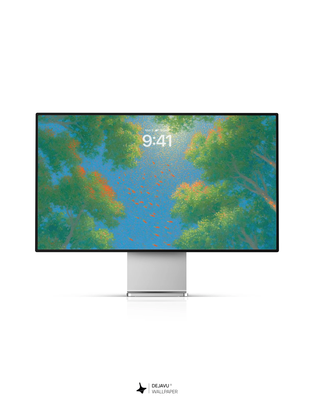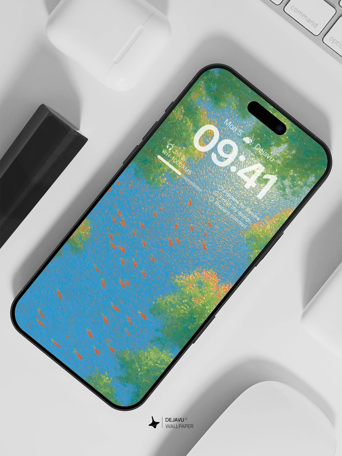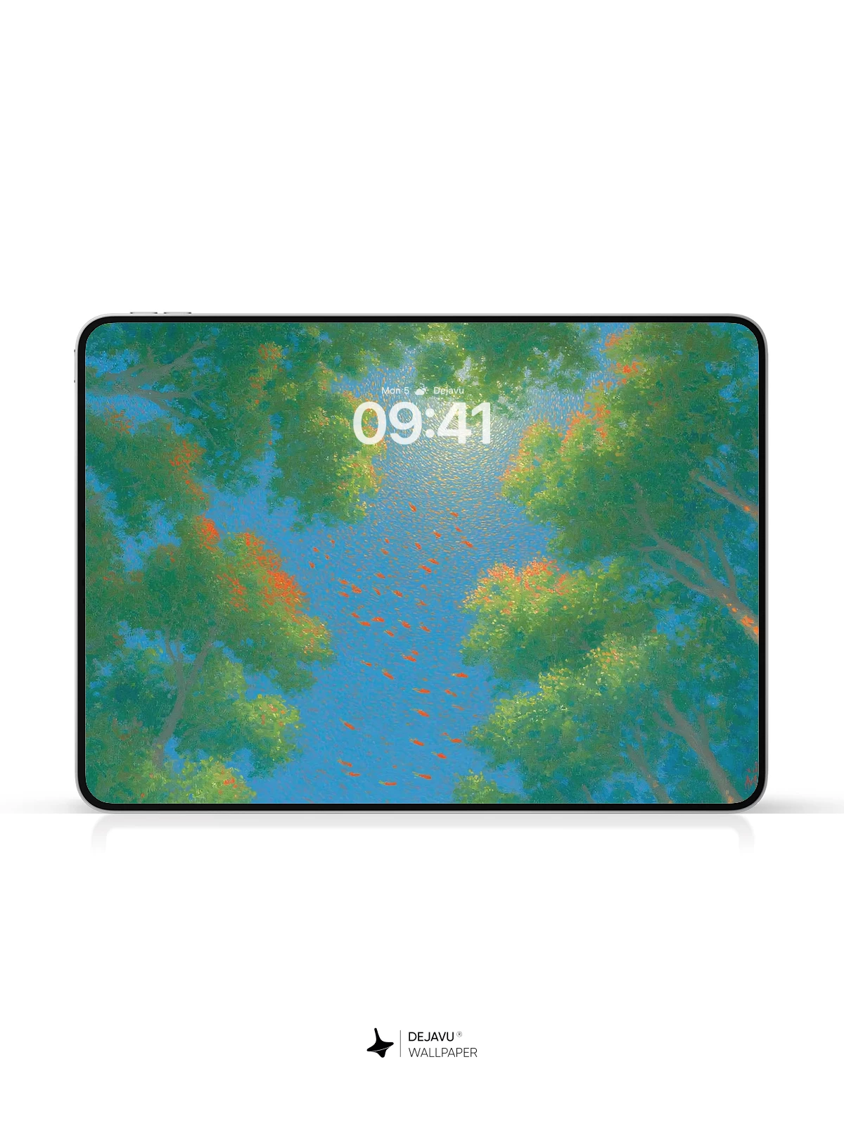 This captivating 8K wallpaper showcases a tranquil forest canopy viewed from below, where sunlight filters through lush green foliage and vibrant orange leaves drift like embers in the sky. The composition evokes a sense of peace and wonder, blending natural beauty with a painterly touch that brings warmth and depth to any screen. Ideal for iPhone, Android, or tablet users seeking a soothing, high-resolution background, this image transforms your device into a window to nature’s quiet magic.