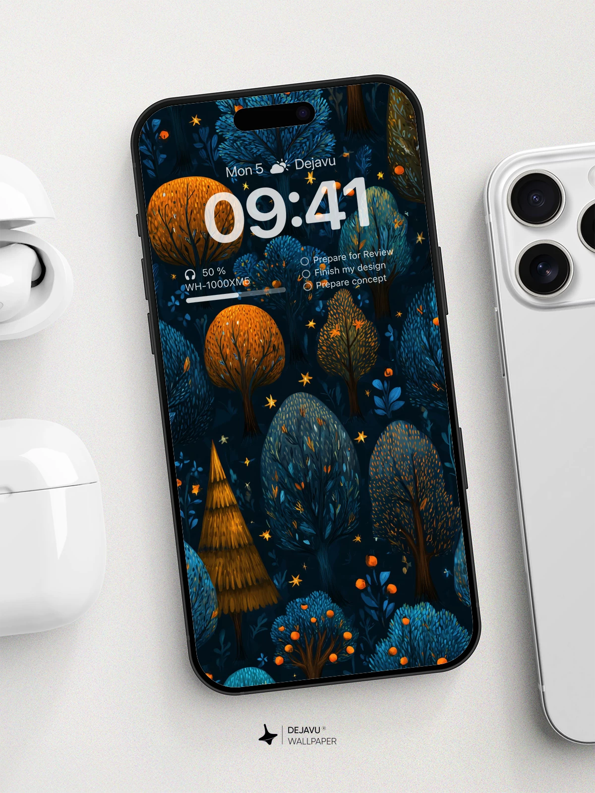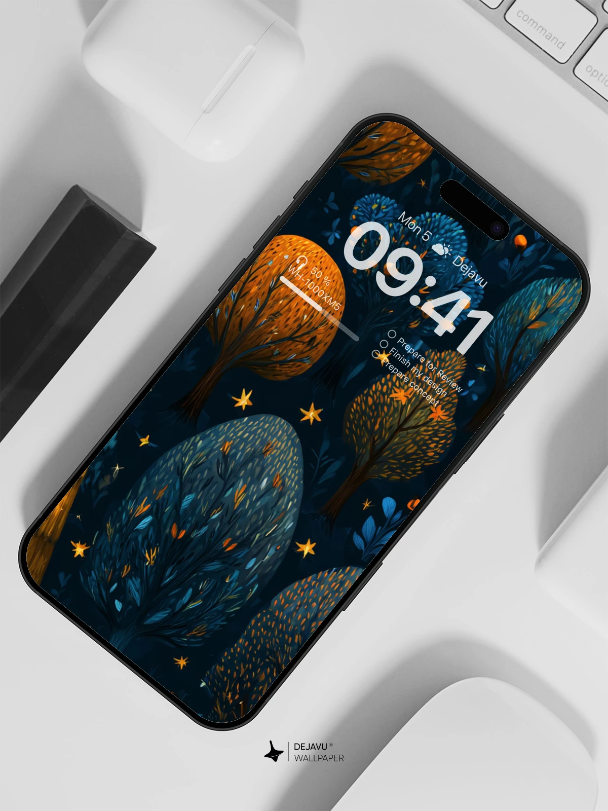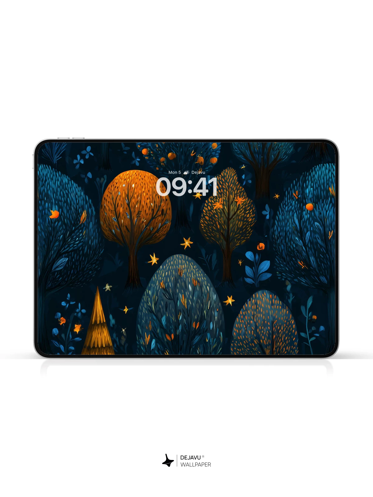 This enchanting 8K wallpaper transports you to a magical forest where luminous orange trees shimmer under a starlit sky, surrounded by richly textured blue and teal foliage. Inspired by whimsical nature art, the design evokes a sense of quiet wonder and nighttime serenity. Ideal for iPhone, Android, and tablet screens, it brings a touch of fantasy and elegance to your device with its intricate details and dreamlike atmosphere.