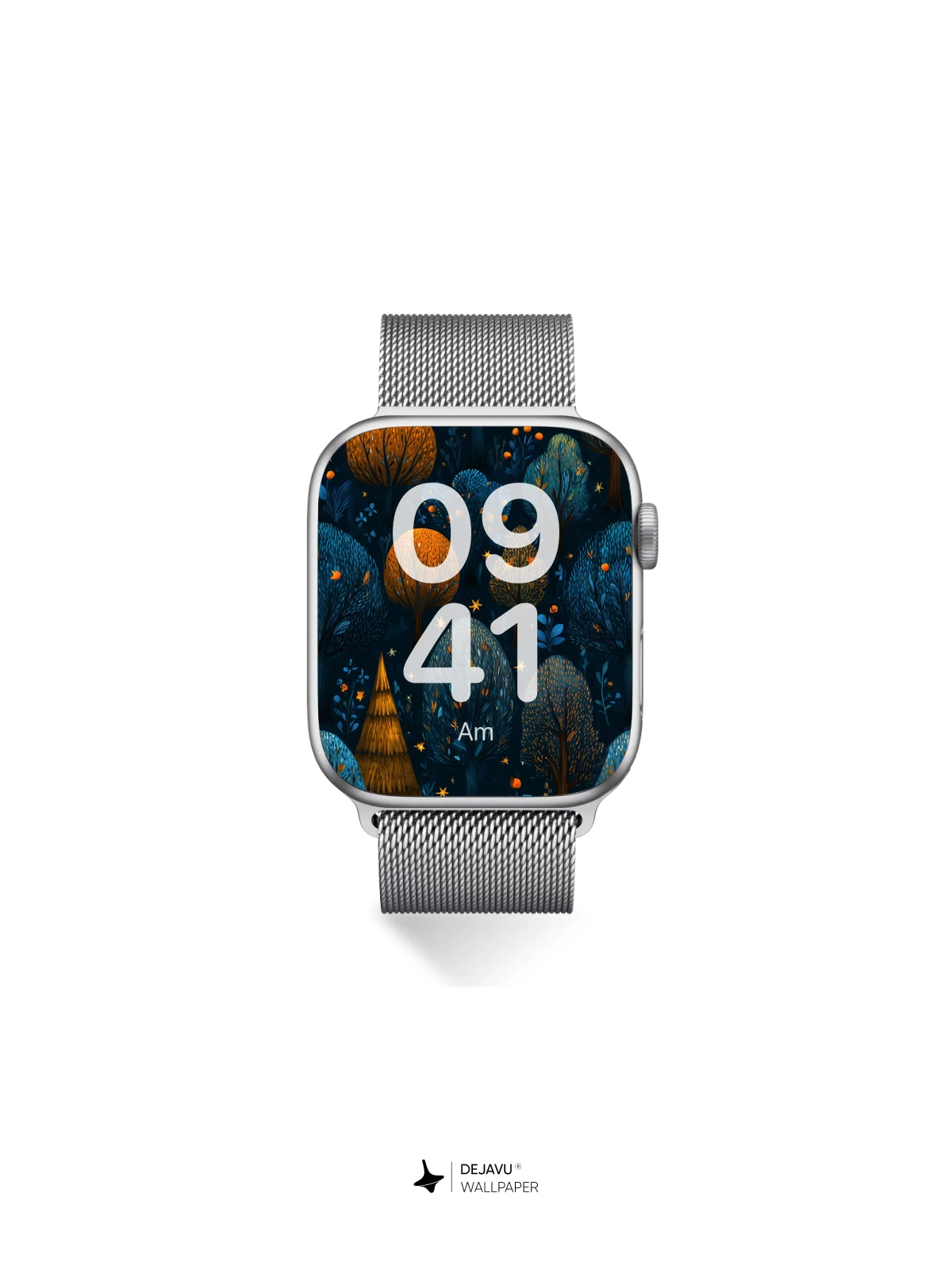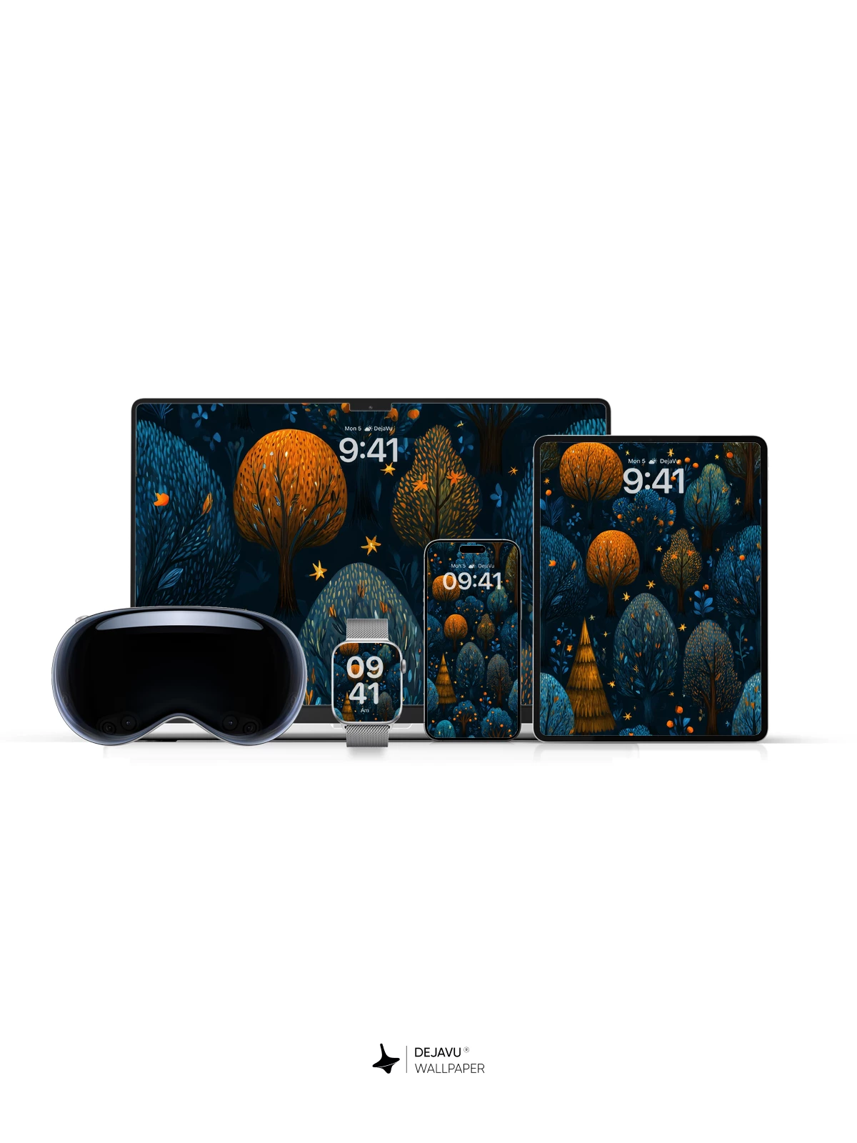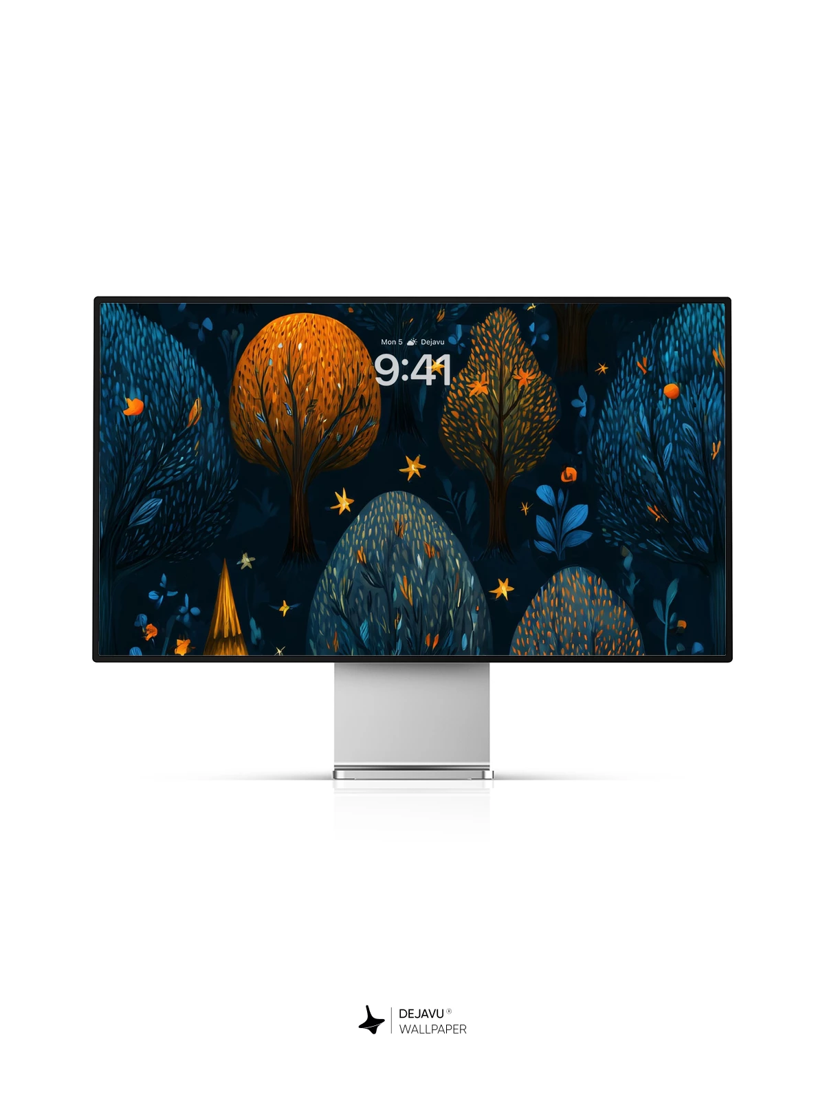 This enchanting 8K wallpaper transports you to a magical forest where luminous orange trees shimmer under a starlit sky, surrounded by richly textured blue and teal foliage. Inspired by whimsical nature art, the design evokes a sense of quiet wonder and nighttime serenity. Ideal for iPhone, Android, and tablet screens, it brings a touch of fantasy and elegance to your device with its intricate details and dreamlike atmosphere.