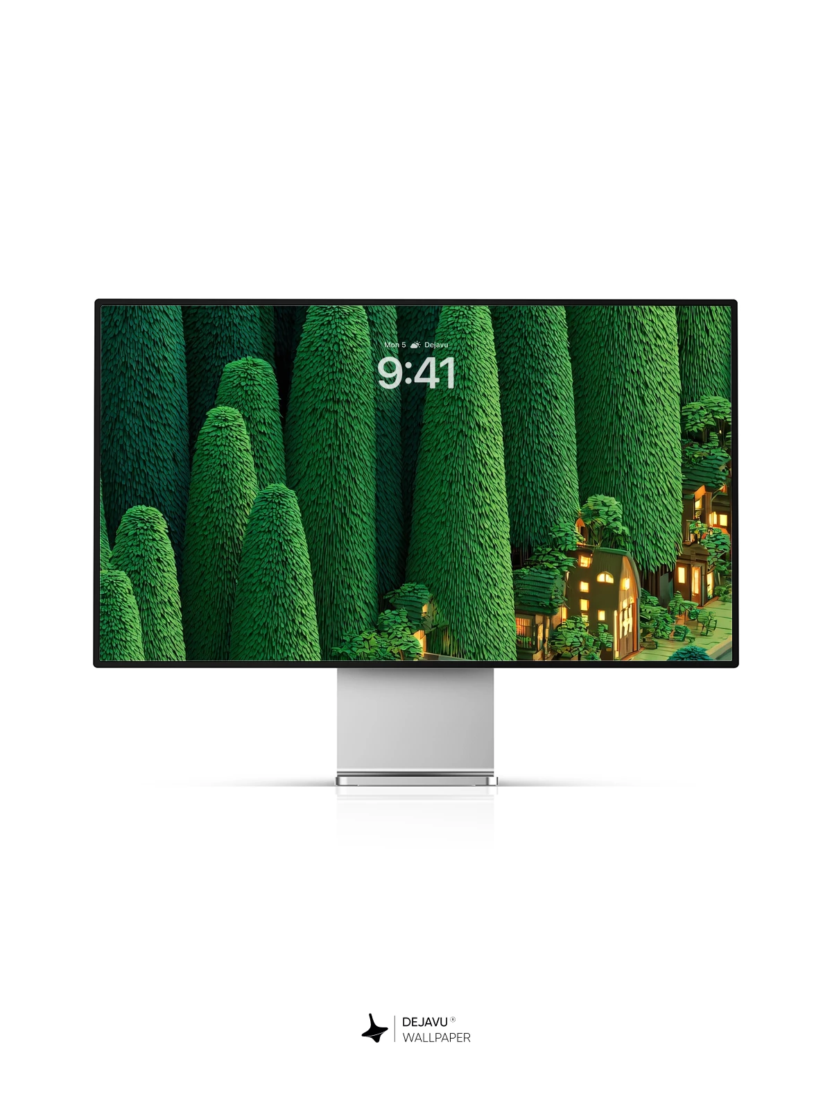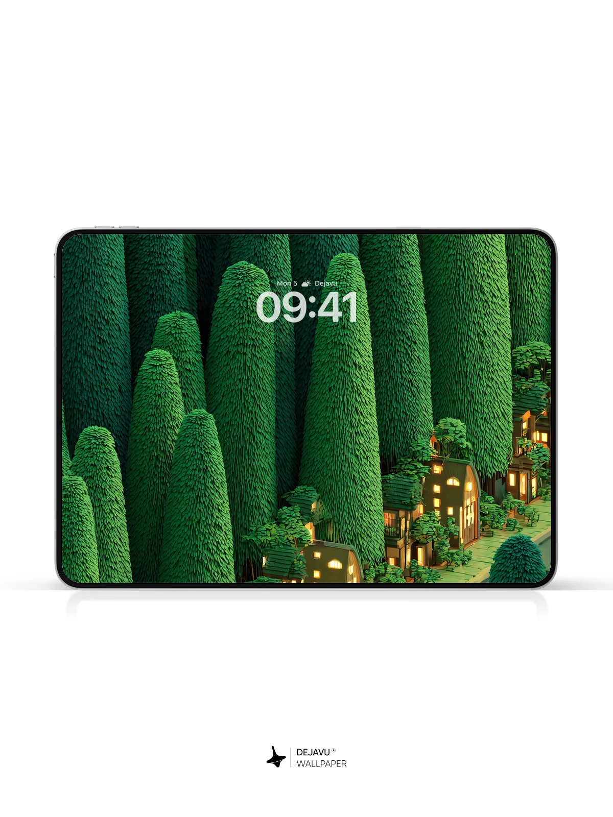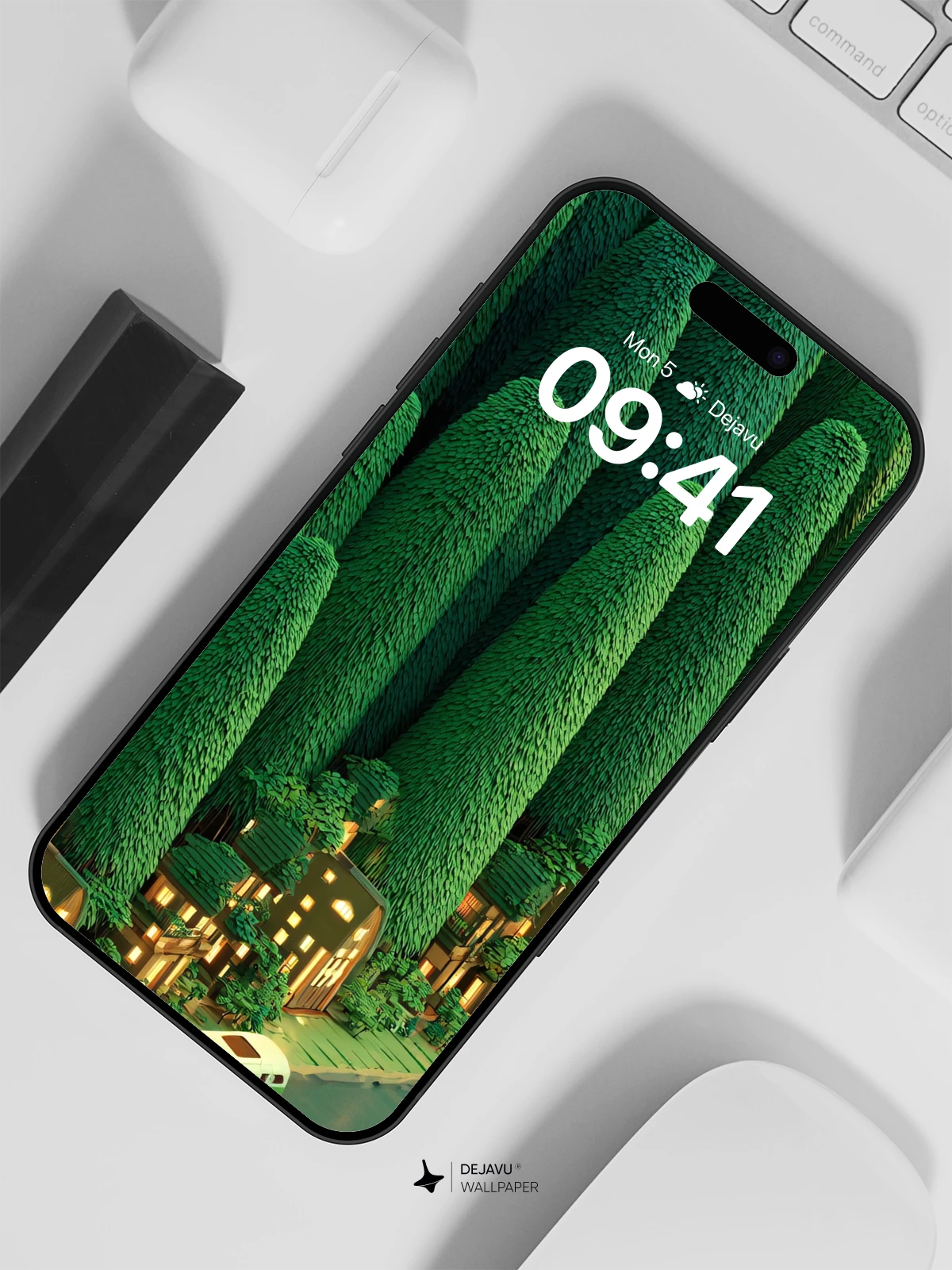 This surreal landscape features a cozy village tucked into a dense forest of giant, cone-shaped trees, evoking a whimsical fairytale world. The soft glow from windows and the vintage van on the winding road add charm and storytelling depth. Inspired by animated fantasy art, this 8K wallpaper brings enchantment to any iPhone, Android, or tablet screen—ideal for those who love nature, mystery, and magical design.