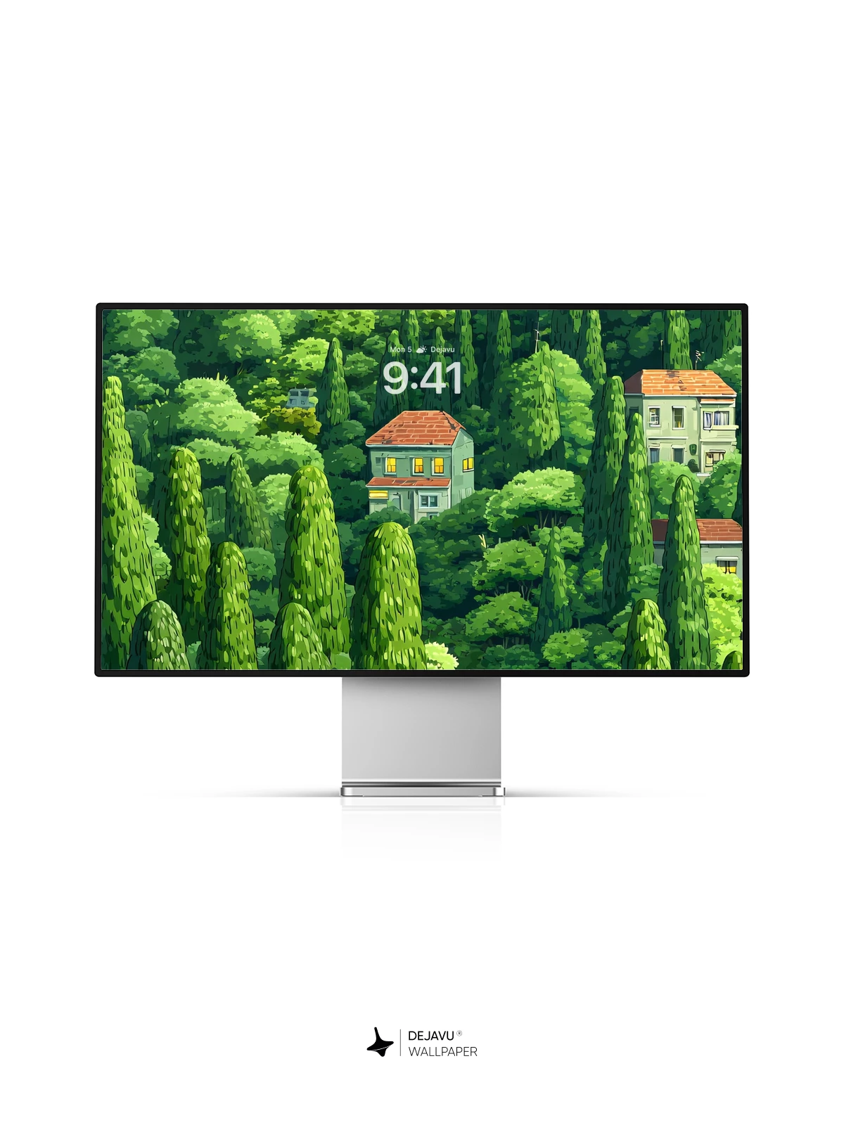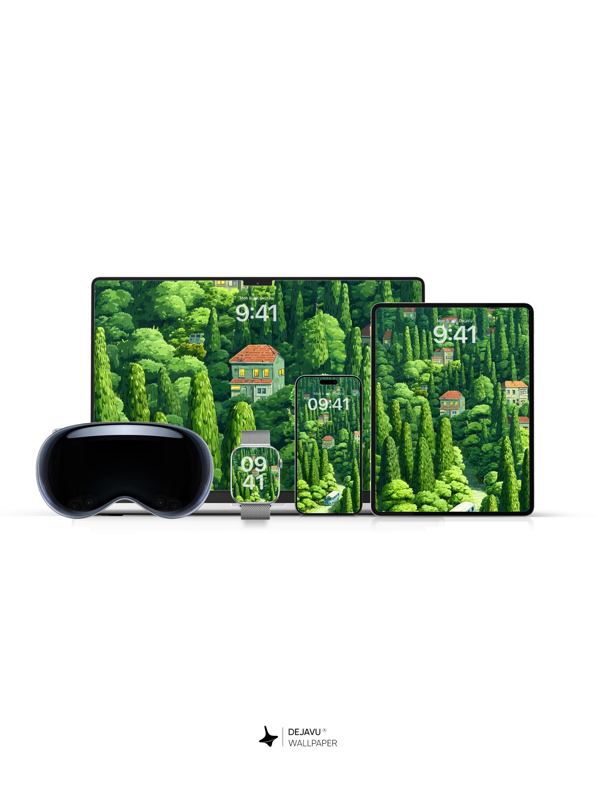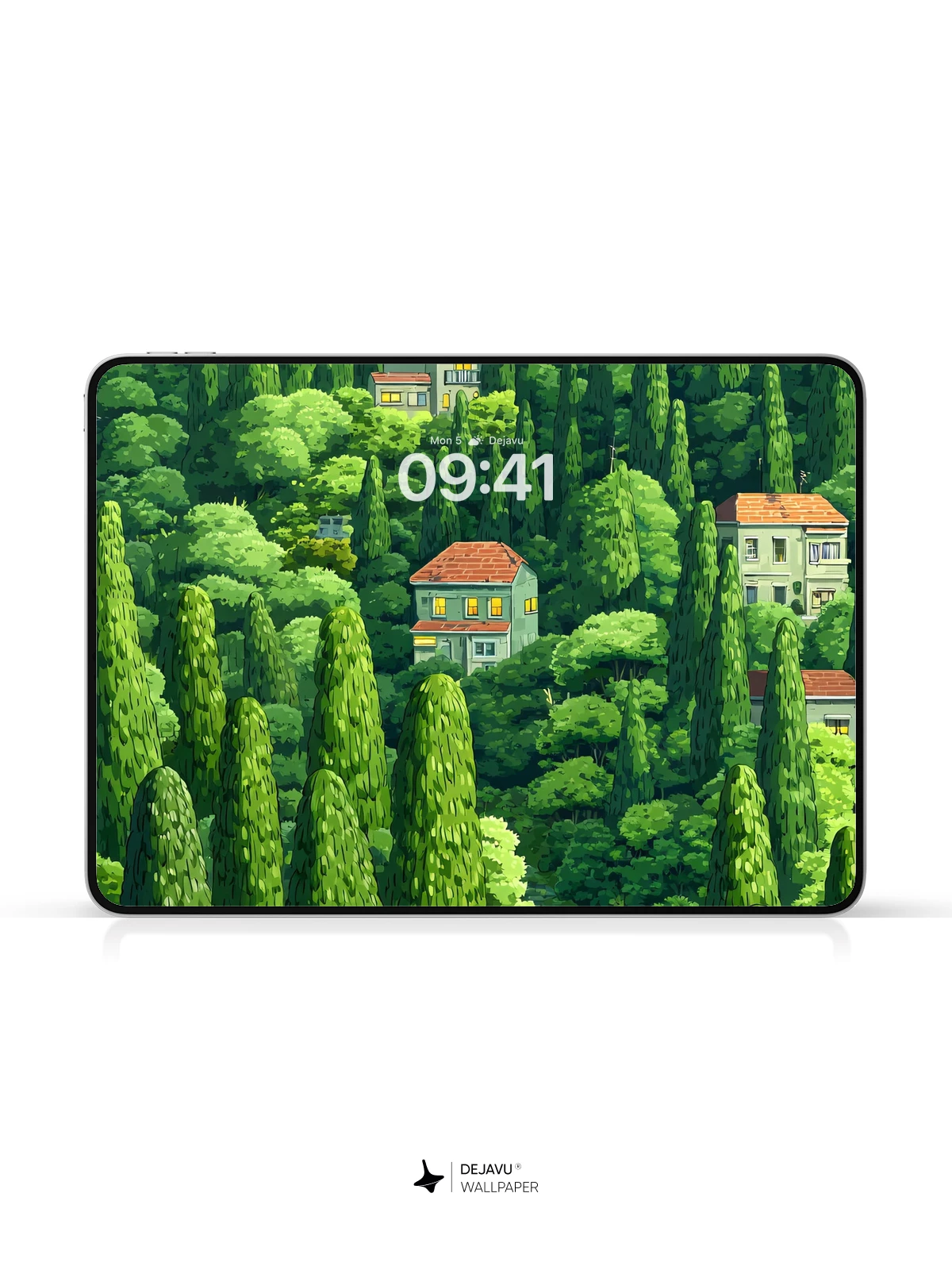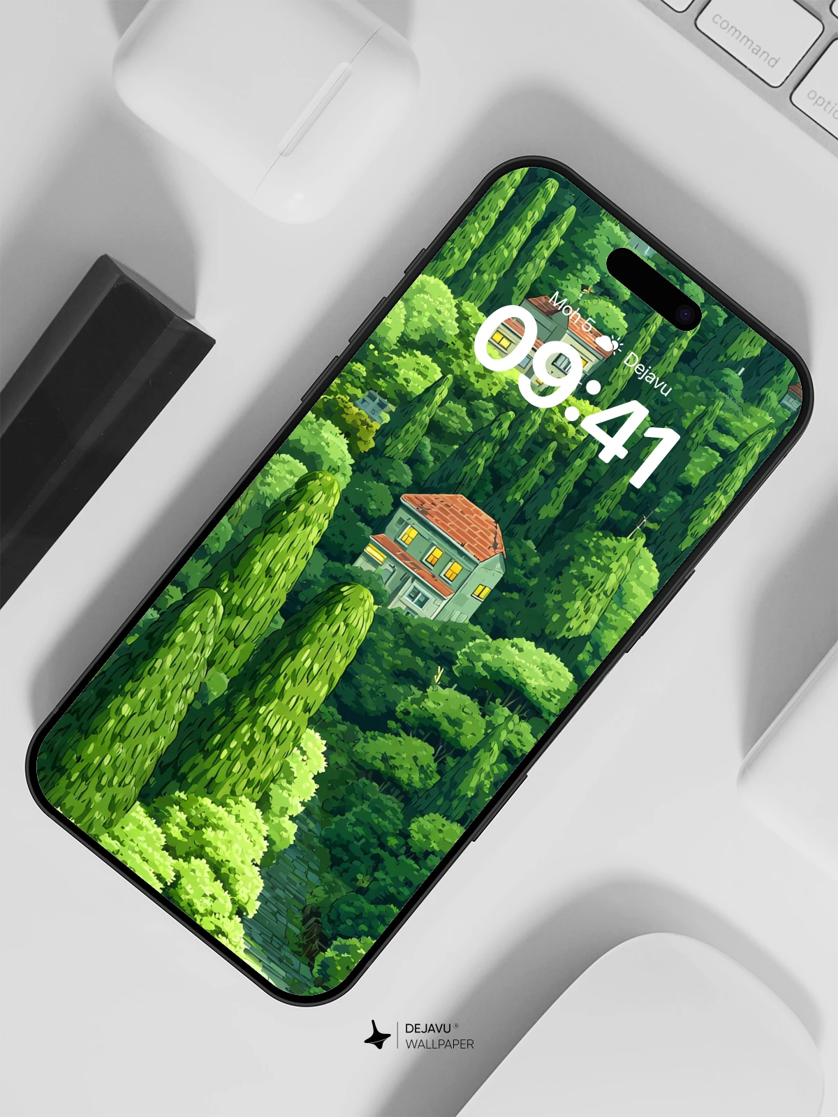 This enchanting 8K wallpaper captures a serene forest village where quaint houses peek through lush, vibrant greenery, evoking a sense of peaceful solitude and timeless charm. Inspired by Studio Ghibli’s dreamlike landscapes, the scene blends nature and nostalgia with meticulous detail—ideal for iPhone, Android, or tablet screens. A vintage blue van travels along a stone path, adding a touch of whimsy and adventure to the tranquil setting. Perfect for those who love nature-inspired art with a magical twist.